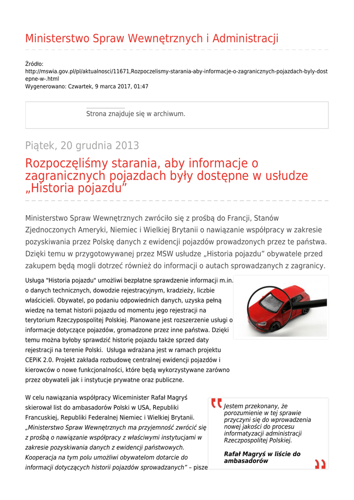 Ministerstwo Spraw Wewnętrznych i Administracji Źródło: http://mswia.gov.pl/pl/aktualnosci/11671,Rozpoczelismy-starania-aby-informacje-o-zagranicznych-pojazdach-byly-dost epne-w-.html Wygenerowano: Czwartek, 9 marca 2017, 01:47 Strona znajduje się w archiwum. Piątek, 20 grudnia 2013 Rozpoczęliśmy starania, aby informacje o zagranicznych pojazdach były dostępne w usłudze „Historia pojazdu” Ministerstwo Spraw Wewnętrznych zwróciło się z prośbą do Francji, Stanów Zjednoczonych Ameryki, Niemiec i Wielkiej Brytanii o nawiązanie współpracy w zakresie pozyskiwania przez Polskę danych z ewidencji pojazdów prowadzonych przez te państwa. Dzięki temu w przygotowywanej przez MSW usłudze „Historia pojazdu” obywatele przed zakupem będą mogli dotrzeć również do informacji o autach sprowadzanych z zagranicy. Usługa "Historia pojazdu" umożliwi bezpłatne sprawdzenie informacji m.in. o danych technicznych, dowodzie rejestracyjnym, kradzieży, liczbie właścicieli. Obywatel, po podaniu odpowiednich danych, uzyska pełną wiedzę na temat historii pojazdu od momentu jego rejestracji na terytorium Rzeczypospolitej Polskiej. Planowane jest rozszerzenie usługi o informacje dotyczące pojazdów, gromadzone przez inne państwa. Dzięki temu można byłoby sprawdzić historię pojazdu także sprzed daty rejestracji na terenie Polski. Usługa wdrażana jest w ramach projektu CEPiK 2.0. Projekt zakłada rozbudowę centralnej ewidencji pojazdów i kierowców o nowe funkcjonalności, które będą wykorzystywane zarówno przez obywateli jak i instytucje prywatne oraz publiczne. W celu nawiązania współpracy Wiceminister Rafał Magryś skierował list do ambasadorów Polski w USA, Republiki Francuskiej, Republiki Federalnej Niemiec i Wielkiej Brytanii. „Ministerstwo Spraw Wewnętrznych ma przyjemność zwrócić się z prośbą o nawiązanie współpracy z właściwymi instytucjami w zakresie pozyskiwania danych z ewidencji państwowych. Kooperacja na tym polu umożliwi obywatelom dotarcie do informacji dotyczących historii pojazdów sprowadzanych” – pisze Jestem przekonany, że porozumienie w tej sprawie przyczyni się do wprowadzenia nowej jakości do procesu informatyzacji administracji Rzeczpospolitej Polskiej. Rafał Magryś w liście do ambasadorów w liście wiceminister. Załączniki do strony List wiceministra Rafała Magrysia do Ambasadora RP w Republice Francuskiej 521.58 KB