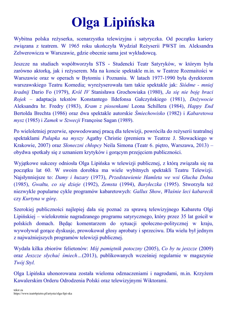 Olga Lipińska Wybitna polska reżyserka, scenarzystka telewizyjna i satyryczka. Od początku kariery związana z teatrem. W 1965 roku ukończyła Wydział Reżyserii PWST im. Aleksandra Zelwerowicza w Warszawie, gdzie obecnie sama jest wykładowcą. Jeszcze na studiach współtworzyła STS - Studencki Teatr Satyryków, w którym była zarówno aktorką, jak i reżyserem. Ma na koncie spektakle m.in. w Teatrze Rozmaitości w Warszawie oraz w operach w Bytomiu i Poznaniu. W latach 1977-1990 była dyrektorem warszawskiego Teatru Komedia; wyreżyserowała tam takie spektakle jak: Siódme - mniej kradnij Dario Fo (1979), Król IV Stanisława Grochowiaka (1980), Ja się nie boję braci Rojek – adaptacja tekstów Konstantego Ildefonsa Gałczyńskiego (1981), Dożywocie Aleksandra hr. Fredry (1983), Kram z piosenkami Leona Schillera (1984), Happy End Bertolda Brechta (1986) oraz dwa spektakle autorskie Śmiechowisko (1982) i Kabaretowa mysz (1985) i Zamek w Szwecji Françoise Sagan (1989). Po wieloletniej przerwie, spowodowanej pracą dla telewizji, powróciła do reżyserii teatralnej spektaklami Pułapka na myszy Agathy Christie (premiera w Teatrze J. Słowackiego w Krakowie, 2007) oraz Słoneczni chłopcy Neila Simona (Teatr 6. piętro, Warszawa, 2013) – obydwa spotkały się z uznaniem krytyków i gorącym przejęciem publiczności. Wyjątkowe sukcesy odniosła Olga Lipińska w telewizji publicznej, z którą związała się na początku lat 60. W swoim dorobku ma wiele wybitnych spektakli Teatru Telewizji. Najsłynniejsze to: Damy i huzary (1973), Przedstawienie Hamleta we wsi Głucha Dolna (1985), Gwałtu, co się dzieje (1992), Zemsta (1994), Baryłeczka (1995). Stworzyła też niezwykle popularne cykle programów kabaretowych: Gallux Show, Właśnie leci kabarecik czy Kurtyna w górę. Szerokiej publiczności najlepiej dała się poznać za sprawą telewizyjnego Kabaretu Olgi Lipińskiej – wielokrotnie nagradzanego programu satyrycznego, który przez 35 lat gościł w polskich domach. Będąc komentarzem do sytuacji społeczno-politycznej w kraju, wywoływał gorące dyskusje, prowokował głosy aprobaty i sprzeciwu. Dla wielu był jednym z najważniejszych programów telewizji publicznej. Wydała kilka zbiorów felietonów: Mój pamiętnik potoczny (2005), Co by tu jeszcze (2009) oraz Jeszcze słychać śmiech…(2013), publikowanych wcześniej regularnie w magazynie Twój Styl. Olga Lipińska uhonorowana została wieloma odznaczeniami i nagrodami, m.in. Krzyżem Kawalerskim Orderu Odrodzenia Polski oraz telewizyjnymi Wiktorami. tekst za https://www.teatr6pietro.pl/artysta/olga-lipi-ska