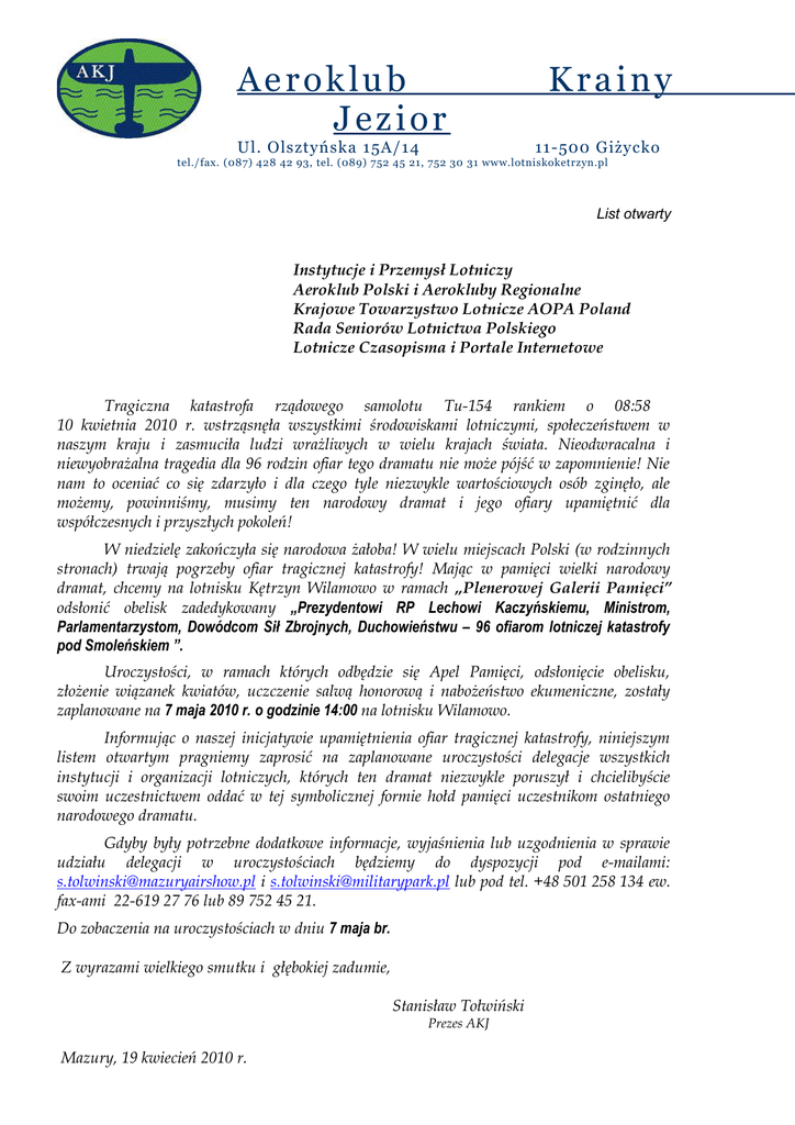 Aeroklub Jezior Ul. Olsztyńska 15A/14 Krainy 11-500 Giżycko tel./fax. (087) 428 42 93, tel. (089) 752 45 21, 752 30 31 www.lotniskoketrzyn.pl List otwarty Instytucje i Przemysł Lotniczy Aeroklub Polski i Aerokluby Regionalne Krajowe Towarzystwo Lotnicze AOPA Poland Rada Seniorów Lotnictwa Polskiego Lotnicze Czasopisma i Portale Internetowe Tragiczna katastrofa rządowego samolotu Tu-154 rankiem o 08:58 10 kwietnia 2010 r. wstrząsnęła wszystkimi środowiskami lotniczymi, społeczeństwem w naszym kraju i zasmuciła ludzi wrażliwych w wielu krajach świata. Nieodwracalna i niewyobrażalna tragedia dla 96 rodzin ofiar tego dramatu nie może pójść w zapomnienie! Nie nam to oceniać co się zdarzyło i dla czego tyle niezwykle wartościowych osób zginęło, ale możemy, powinniśmy, musimy ten narodowy dramat i jego ofiary upamiętnić dla współczesnych i przyszłych pokoleń! W niedzielę zakończyła się narodowa żałoba! W wielu miejscach Polski (w rodzinnych stronach) trwają pogrzeby ofiar tragicznej katastrofy! Mając w pamięci wielki narodowy dramat, chcemy na lotnisku Kętrzyn Wilamowo w ramach „Plenerowej Galerii Pamięci” odsłonić obelisk zadedykowany „Prezydentowi RP Lechowi Kaczyńskiemu, Ministrom, Parlamentarzystom, Dowódcom Sił Zbrojnych, Duchowieństwu – 96 ofiarom lotniczej katastrofy pod Smoleńskiem ”. Uroczystości, w ramach których odbędzie się Apel Pamięci, odsłonięcie obelisku, złożenie wiązanek kwiatów, uczczenie salwą honorową i nabożeństwo ekumeniczne, zostały zaplanowane na 7 maja 2010 r. o godzinie 14:00 na lotnisku Wilamowo. Informując o naszej inicjatywie upamiętnienia ofiar tragicznej katastrofy, niniejszym listem otwartym pragniemy zaprosić na zaplanowane uroczystości delegacje wszystkich instytucji i organizacji lotniczych, których ten dramat niezwykle poruszył i chcielibyście swoim uczestnictwem oddać w tej symbolicznej formie hołd pamięci uczestnikom ostatniego narodowego dramatu. Gdyby były potrzebne dodatkowe informacje, wyjaśnienia lub uzgodnienia w sprawie udziału delegacji w uroczystościach będziemy do dyspozycji pod e-mailami: [email protected] i [email protected] lub pod tel. +48 501 258 134 ew. fax-ami 22-619 27 76 lub 89 752 45 21. Do zobaczenia na uroczystościach w dniu 7 maja br. Z wyrazami wielkiego smutku i głębokiej zadumie, Stanisław Tołwiński Prezes AKJ Mazury, 19 kwiecień 2010 r.