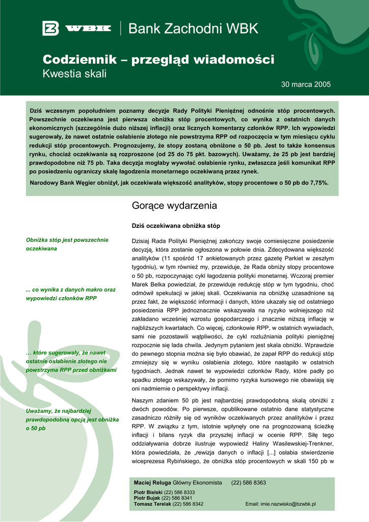 Codziennik – przegląd wiadomości Kwestia skali 30 marca 2005 Dziś wczesnym popołudniem poznamy decyzje Rady Polityki Pieniężnej odnośnie stóp procentowych. Powszechnie oczekiwana jest pierwsza obniżka stóp procentowych, co wynika z ostatnich danych ekonomicznych (szczególnie dużo niższej inflacji) oraz licznych komentarzy członków RPP. Ich wypowiedzi sugerowały, że nawet ostatnie osłabienie złotego nie powstrzyma RPP od rozpoczęcia w tym miesiącu cyklu redukcji stóp procentowych. Prognozujemy, że stopy zostaną obniżone o 50 pb. Jest to także konsensus rynku, chociaż oczekiwania są rozproszone (od 25 do 75 pkt. bazowych). Uważamy, że 25 pb jest bardziej prawdopodobne niż 75 pb. Taka decyzja mogłaby wywołać osłabienie rynku, zwłaszcza jeśli komunikat RPP po posiedzeniu ograniczy skalę łagodzenia monetarnego oczekiwaną przez rynek. Narodowy Bank Węgier obniżył, jak oczekiwała większość analityków, stopy procentowe o 50 pb do 7,75%. Gorące wydarzenia Dziś oczekiwana obniżka stóp Obniżka stóp jest powszechnie oczekiwana ... co wynika z danych makro oraz wypowiedzi członków RPP … które sugerowały, że nawet ostatnie osłabienie złotego nie powstrzyma RPP przed obniżkami Uważamy, że najbardziej prawdopodobną opcją jest obniżka o 50 pb Dzisiaj Rada Polityki Pieniężnej zakończy swoje comiesięczne posiedzenie decyzją, która zostanie ogłoszona w połowie dnia. Zdecydowana większość analityków (11 spośród 17 ankietowanych przez gazetę Parkiet w zeszłym tygodniu), w tym również my, przewiduje, że Rada obniży stopy procentowe o 50 pb, rozpoczynając cykl łagodzenia polityki monetarnej. Wczoraj premier Marek Belka powiedział, że przewiduje redukcję stóp w tym tygodniu, choć odmówił spekulacji w jakiej skali. Oczekiwania na obniżkę uzasadnione są przez fakt, że większość informacji i danych, które ukazały się od ostatniego posiedzenia RPP jednoznacznie wskazywała na ryzyko wolniejszego niż zakładano wcześniej wzrostu gospodarczego i znacznie niższą inflację w najbliższych kwartałach. Co więcej, członkowie RPP, w ostatnich wywiadach, sami nie pozostawili wątpliwości, że cykl rozluźniania polityki pieniężnej rozpocznie się lada chwila. Jedynym pytaniem jest skala obniżki. Wprawdzie do pewnego stopnia można się było obawiać, że zapał RPP do redukcji stóp zmniejszy się w wyniku osłabienia złotego, które nastąpiło w ostatnich tygodniach. Jednak nawet te wypowiedzi członków Rady, które padły po spadku złotego wskazywały, że pomimo ryzyka kursowego nie obawiają się oni nadmiernie o perspektywy inflacji. Naszym zdaniem 50 pb jest najbardziej prawdopodobną skalą obniżki z dwóch powodów. Po pierwsze, opublikowane ostatnio dane statystyczne zasadniczo różniły się od wyników oczekiwanych przez analityków i przez RPP. W związku z tym, istotnie wpłynęły one na prognozowaną ścieżkę inflacji i bilans ryzyk dla przyszłej inflacji w ocenie RPP. Siłę tego oddziaływania dobrze ilustruje wypowiedź Haliny Wasilewskiej-Trenkner, która powiedziała, że „rewizja danych o inflacji [...] osłabia stwierdzenie wiceprezesa Rybińskiego, że obniżka stóp procentowych w skali 150 pb w Maciej Reluga Główny Ekonomista Piotr Bielski (22) 586 8333 Piotr Bujak (22) 586 8341 Tomasz Terelak (22) 586 8342 (22) 586 8363 Email: [email protected] Codziennik – przegląd wydarzeń ciągu 12 miesięcy [...] znacznie zwiększyłaby ryzyko, że inflacja pozostawałaby powyżej celu inflacyjnego”. Członkini RPP dodała też, że nie jest przekonana, czy inflacja zacznie wzrastać w wyniku tak głębokiej obniżki stóp (150 pb). Pokazuje to, że ocena perspektyw gospodarczych ze strony Rady zmieniła się w sposób istotny po ostatnich publikacjach danych, co może przemawiać za bardziej zdecydowaną zmianą stóp procentowych. Po drugie, decyzja zapewne jak zwykle będzie kompromisem – pomiędzy tymi, którzy prawdopodobnie opowiedzą się za bardziej zdecydowanym cięciem już w pierwszym kroku (potencjalnie Nieckarz i Pietrewicz) i tymi, którzy preferują stopniowe i ostrożne ruchy (Balcerowicz i Filar). Biorąc pod uwagę, że inni członkowie RPP wskazywali, że poziom ok. 5,25% (wartość stopy referencyjnej przed akcesją do UE) jako dobry punkt odniesienia dla stóp procentowych w Polsce, to redukcja o 50 pb w pierwszym kroku cyklu łagodzenia polityki pieniężnej wydaje się uzasadniona, uwzględniając skalę pozytywnej niespodzianki inflacyjnej od początku tego roku. Konkluzja: Prognozujemy, że stopy zostaną obniżone o 50 pb. Jest to także konsensus rynku, chociaż oczekiwania są rozproszone (od 25 do 75 pkt. bazowych). Uważamy, że 25 pb jest bardziej prawdopodobne niż 75 pb. Może to wywołać osłabienie rynku, zwłaszcza jeśli komunikat RPP po posiedzeniu ograniczy skalę łagodzenia monetarnego oczekiwaną przez rynek. Monitor rynku Notowania złotego (29.03.2005) Min Max USD 3,1965 3,2350 EUR 4,1300 4,1800 Fixing 3,2217 4,1659 Kursy walutowe (dzisiejsze otwarcie) EURUSD CADPLN 1,2946 USDPLN DKKPLN 3,2037 EURPLN NOKPLN 4,1484 CHFPLN SEKPLN 2,6716 JPYPLN* CZKPLN 2,9873 GBPPLN HUFPLN* 6,0188 *100 jednostek 2,6457 0,5568 0,5054 0,4541 0,1374 1,6701 Rentowności na rynku wtórnym (29.03.2005) Bony Rentowność Zmiana (pb) 3M 5,80 5 6M 5,70 5 9M 5,60 2 12M 5,55 2 Obligacje 2L 5,61 7 3L 5,71 11 4L 5,70 6 5L 5,72 4 8L 5,70 4 10L 5,66 2 Stawki WIBOR (29.03.2005) Termin Stawki O/N 7,82 T/N 7,87 SW 6,22 2W 6,21 1M 6,20 3M 6,06 6M 5,86 9M 5,75 1L 5,66 Zmiana (pb) 135 134 -8 -4 0 1 1 0 1 Z powodu umocnienia się dolara (1,2860), gdy polski rynek był zamknięty podczas przerwy świątecznej, złoty stracił na wartości 1,5% osiągając poziomy 3,23 do dolara oraz 4,1725 do euro. Chociaż EURUSD z powrotem wspiął się powyżej 1,29 polska waluta odbiła się jedynie w mniejszym stopniu odnotowując wzrost wartości odpowiednio do 3,215 oraz 4,156. P