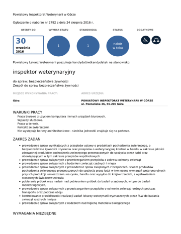 Powiatowy Inspektorat Weterynarii w Górze Ogłoszenie o naborze nr 2792 z dnia 24 sierpnia 2016 r. OFERTY DO WYMIAR ETATU STANOWISKA STATUS 1 1 nabór w toku 30 września 2016 DODATKOWE Powiatowy Lekarz Weterynarii poszukuje kandydatów\kandydatek na stanowisko: inspektor weterynaryjny do spraw: bezpieczeństwa żywności Zespół do spraw bezpieczeństwa żywności MIEJSCE WYKONYWANIA PRACY: ADRES URZĘDU: Góra POWIATOWY INSPEKTORAT WETERYNARII W GÓRZE ul. Poznańska 36, 56-200 Góra WARUNKI PRACY Praca biurowa z użyciem komputera i innych urządzeń biurowych. Wyjazdy służbowe. Praca w terenie. Kontakt ze zwierzętami. Nie występują bariery architektoniczne - siedziba jednostki znajduje się na parterze. ZAKRES ZADAŃ prowadzenie spraw wynikających z przepisów ustawy o produktach pochodzenia zwierzęcego, o bezpieczeństwie żywności i żywienia oraz przepisów o weterynaryjnej kontroli w handlu w zakresie jakości zdrowotnej produktów pochodzenia zwierzęcego przeznaczonych do spożycia przez ludzi oraz obowiązujących w tym zakresie przepisów wspólnotowych prowadzenie spraw związanych z przestrzeganiem przepisów z zakresu ochrony zwierząt prowadzenie spraw związanych z badaniem zwierząt rzeźnych i mięsa prowadzenie spraw związanych z prowadzenie spraw związanych z bezpieczeń- stwem produktów pochodzenia zwierzęcego przeznaczonych do spożycia przez ludzi w tym ocena wymagań weterynaryjnych przy ich produkcji, umieszczaniu na rynku, handlu oraz wysyłce do krajów trzecich, z wystawieniem stosownych świadectw zdrowia pobieranie próbek oraz nadzór nad pobieraniem próbek do badań urzędowych, w tym do badań monitoringowych, prowadzenie spraw związanych z przestrzeganiem przepisów o ochronie zwierząt rzeźnych podczas transportu oraz podczas uboju kontrolowanie prawidłowości realizacji zadań lekarzy weterynarii wyznaczonych przez PLW do badania zwierząt rzeźnych i mięsa prowadzenie spraw związanych z nadzorem nad higieną materiału biologicznego WYMAGANIA NIEZBĘDNE Wykształcenie: wyższe Weterynaryjne lub inne wyższe z zakresu spraw należących do właściwości Inspekcji Weterynaryjnej prawo wykonywania zawodu lekarza weterynarii w przypadku wykształcenia wyższego weterynaryjnego znajomość obowiązujących przepisów prawnych związanych z działalnością Inspekcji Weterynaryjnej, Służby Cywilnej i prawa administracyjnego aktualne prawo jazdy kat. B (czynne prowadzenie pojazdów) umiejętność obsługi komputera Posiadanie obywatelstwa polskiego Korzystanie z pełni praw publicznych Nieskazanie prawomocnym wyrokiem za umyślne przestępstwo lub umyślne przestępstwo skarbowe WYMAGANIA DODATKOWE umiejętność pracy w zespole dyspozycyjność umiejętność działania w sytuacjach stresowych umiejętność obsługi urządzeń biurowych DOKUMENTY I OŚWIADCZENIA NIEZBĘDNE Życiorys/CV i list motywacyjny Kopie dokumentów potwierdzających spełnienie wymagania niezbędnego w zakresie wykształcenia Oświadczenie o posiadaniu obywatelstwa polskiego albo kopia dokumentu potwierdzającego posiadanie polskiego obywatelstwa Kopia dokumentu prawo wykonywania zawodu lekarza weterynarii w przypadku wykształcenia wyższego weterynaryjnego Oświadczenie o posiadaniu obywatelstwa polskiego albo kopia dokumentu potwierdzającego posiadanie polskiego obywatelstwa Oświadczenie o wyrażeniu zgody na przetwarzanie danych osobowych do celów naboru Oświadczenie o korzystaniu z pełni praw publicznych Oświadczenie o nieskazaniu prawomocnym wyrokiem za umyślne przestępstwo lub umyślne przestępstwo skarbowe DOKUMENTY I OŚWIADCZENIA DODATKOWE kopia dokumentu potwierdzającego niepełnosprawność - w przypadku kandydatek/kandydatów, zamierzających skorzystać z pierwszeństwa w zatrudnieniu w przypadku, gdy znajdą się w gronie najlepszych kandydatek/kandydatów TERMINY I MIEJSCE SKŁADANIA DOKUMENTÓW Dokumenty należy złożyć do: 30 września 2016 r. Decyduje data: stempla pocztowego / osobistego dostarczenia oferty do urzędu Miejsce składania dokumentów: Powiatowy Inspektorat Weterynarii w Górze ul. Poznańska 36, 56-200 Góra w godzinach pracy urzędu tj. od 7:30 do 15:30 INNE INFORMACJE: W miesiącu poprzedzającym datę upublicznienia ogłoszenia wskaźnik zatrudnienia osób niepełnosprawnych w urzędzie, w rozumieniu przepisów o rehabilitacji zawodowej i społecznej oraz zatrudnianiu osób niepełnosprawnych, nie wynosi co najmniej 6%. Przewidywany termin zatrudnienia: październik 2016 r. Nasz urząd jest pracodawcą równych szans i wszystkie aplikacje są rozważane z równą uwagą bez względu na płeć, wiek, niepełnosprawność, rasę, narodowość, przekonania polityczne, przynależność związkową, pochodzenie etniczne, wyznanie, orientacje seksualną czy też jakąkolwiek inną cechę prawnie chronioną. Dodatkowe informacje oraz kontakt można uzyskać na stronie: www.piwgora.pl Legenda Pierwszeństwo dla osób z niepełnosprawnościami Ogłoszenie z tym symbolem oznacza, że pierwszeństwo w zatrudnieniu mają osoby z niepełnosprawnościami, które spełniają wszystkie następujące warunki: • złożyły w terminie ofertę wraz z dokumentem potwierdzającym niepełnosprawność, • spełniają warunki wymienione w ogłoszeniu, • po rekrutacji znalazły się w gronie najlepszych kandydatów. Zastępstwo Ogłoszenie z tym symbolem oznacza, że urząd poszukuje kandydatów do pracy na czas przewidywanej nieobecności swojego pracownika. Jeśli w ogłoszeniu nie wskazano okresu zastępstwa, możesz o to spytać w urzędzie. Osoba zatrudniona na zastępstwo jest członkiem korpusu służby cywilnej. Nabór otwarty dla cudzoziemców Ogłoszenie z tym symbolem oznacza, że o stanowisko mogą starać się, poza polskimi obywatelami, również cudzoziemcy. Kandydaci muszą spełniać następujące warunki: • są obywatelami państwa Unii Europejskiej lub innego państwa, którego obywatelom na podstawie umów 