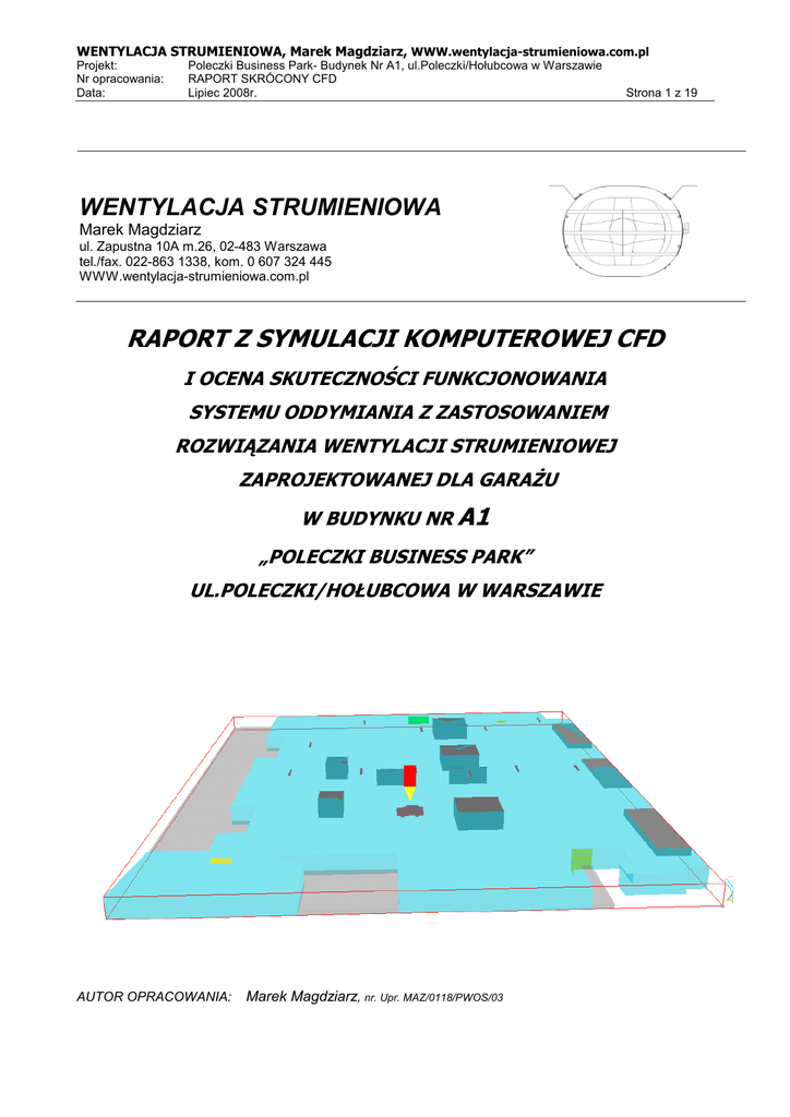 WENTYLACJA STRUMIENIOWA, Marek Magdziarz, WWW.wentylacja-strumieniowa.com.pl Projekt: Nr opracowania: Data: Poleczki Business Park- Budynek Nr A1, ul.Poleczki/Hołubcowa w Warszawie RAPORT SKRÓCONY CFD Lipiec 2008r. Strona 1 z 19 WENTYLACJA STRUMIENIOWA Marek Magdziarz ul. Zapustna 10A m.26, 02-483 Warszawa tel./fax. 022-863 1338, kom. 0 607 324 445 WWW.wentylacja-strumieniowa.com.pl RAPORT Z SYMULACJI KOMPUTEROWEJ CFD I OCENA SKUTECZNOŚCI FUNKCJONOWANIA SYSTEMU ODDYMIANIA Z ZASTOSOWANIEM ROZWIĄZANIA WENTYLACJI STRUMIENIOWEJ ZAPROJEKTOWANEJ DLA GARAśU W BUDYNKU NR A1 „POLECZKI BUSINESS PARK” UL.POLECZKI/HOŁUBCOWA W WARSZAWIE AUTOR OPRACOWANIA: Marek Magdziarz, nr. Upr. MAZ/0118/PWOS/03 WENTYLACJA STRUMIENIOWA, Marek Magdziarz, www.wentylacja-strumieniowa.com.pl Projekt: Nr opracowania: Data: Poleczki Business Park- Budynek Nr A1, ul.Poleczki/Hołubcowa w Warszawie RAPORT SKRÓCONY CFD Lipiec 2008r. Strona 2 z 19 Spis treści 1. 2. 3. 4. 5. 6. Przedmiot opracowania .......................................................................................................................................... 3 Podstawa opracowania ........................................................................................................................................... 3 ZałoŜenia projektowe .............................................................................................................................................. 3 Przyjęte kryteria i modele CFD ............................................................................................................................... 4 Geometria garaŜu ................................................................................................................................................... 5 Wyniki graficzne obliczeń CFD ............................................................................................................................... 6 WENTYLACJA STRUMIENIOWA, Marek Magdziarz, WWW.wentylacja-strumieniowa.com.pl Projekt: Nr opracowania: Data: Poleczki Business Park- Budynek Nr A1, ul.Poleczki/Hołubcowa w Warszawie RAPORT SKRÓCONY CFD Lipiec 2008r. Strona 3 z 19 1. Przedmiot opracowania Przedmiot opracowania stanowi system wentylacji oddymiającej dla garaŜu w budynku garaŜu podziemnego POLECZKI BUSINESS PARK budynek nr A1 przy ul.Poleczki / Hołubcowej z zastosowaniem rozwiązania wentylacji strumieniowej jet-fan. Celem opracowania jest : - analiza warunków i moŜliwości ewakuacji ludzi z garaŜu oraz skuteczności działania systemu wentylacji oddymiającej; - ocena moŜliwości operowania ekip ratowniczych; - ocena moŜliwości zrezygnowania z zastosowania podziału obszaru garaŜu na strefy poŜarowe wydzielone oddzieleniami przeciwpoŜarowymi i powiększenia powierzchni strefy poŜarowej dopuszczonej przepisami techniczno-budowlanymi Dz. U. Nr. 75.poz. 690 z 2002r.; - ocena moŜliwości zastosowania wentylatorów poŜarowych w instalacji oddymiającej o odporności w o klasie F300 wg. PN-EN 12101-3 zamiennie dla urządzeń o odporności 400 C/2 godziny wymaganych przepisami techniczno-budowlanymi Dz. U. Nr. 75.poz. 690 z 2002r.; Analizy oparte będą o modelowanie CFD warunków rozwoju poŜaru dla najbardziej prawdopodobnego i niekorzystnego scenariusza rozwoju poŜaru. Jest to scenariusz w strefie wykrywania dymu „A1B”, pokazany na Rys. 1-3. 2. Podstawa opracowania Opracowanie sporządzono na podstawie: - Projektu systemu wentylacji strumieniowej jet-fan, z Czerwca 2008r., - projektu architektonicznego kondygnacji garaŜu autorstwa biura projektowo-architektonicznego RKW z Czerwca 2008r. - danych technicznych urządzeń jet-fan - zasad wiedzy technicznej, - wyników obliczeniowych symulacji komputerowej wraz z graficznym ich zobrazowaniem uzyskanych za pomocą licencjonowanego programu komputerowego PHOENICS FLAIR, 3. ZałoŜenia projektowe a) b) c) d) e) f) scenariusz rozwoju poŜaru nr.1 tj. miejsce poŜaru pokazano na rysunku nr.1,2,3; garaŜ składa się z 1-ej kondygnacji i 1-ej strefy poŜarowej, garaŜ jest garaŜem zamkniętym, ogrzewanym i nie tryskaczowanym, czas trwania symulacji CFD 15 minut; o temperatura otaczającego powietrza 20 C; o początkowa temperatura w przestrzeni garaŜu 20 C; WENTYLACJA STRUMIENIOWA, Marek Magdziarz, www.wentylacja-strumieniowa.com.pl Projekt: Nr opracowania: Data: Poleczki Business Park- Budynek Nr A1, ul.Poleczki/Hołubcowa w Warszawie RAPORT SKRÓCONY CFD Lipiec 2008r. Strona 4 z 19 4. Przyjęte kryteria i modele CFD 4.1 Analiza moŜliwości ewakuacji ludzi Dla analizy warunków ewakuacji ludzi w garaŜu i spełnienia wymogów zapewniających umoŜliwienie ewakuacji ludzi w czasie niezbędnym do przeprowadzenia ewakuacji przyjmuje się spełnienie kryteriów: a) zakres widzialności znaków ewakuacyjnych podświetlanych (ozn. SLEN) na wysokości ok. 1.8m większy niŜ 15m; b) temperatura powietrza (ozn. TEMPERATURE) w obszarze zagroŜonym nie wyŜsza niŜ o 60 C; c) czas niezbędny do ewakuacji ludzi od wybuchu poŜaru i początku symulacji CFD: 4 minuty (co jest równoznaczne z 3 minuty od wykrycia poŜaru). 4.2 Analiza warunków bezpieczeństwa Dla analizy warunków bezpieczeństwa konstrukcji budynku i operowania ekip ratowniczo gaśniczych oraz spełnienia wymogów bezpieczeństwa z umoŜliwieniem ugaszenia poŜaru przez przybyłe ekipy gaśniczo-ratownicze przyjmuje się spełnienie kryteriów: a) umoŜliwienia wejścia ekipom gaśniczo-ratowniczym w strefie wolnej od dymu (nawietrznej na miejsce poŜaru) i operowanie w wystarczającym zakresie widzialności; o b) temperatura powietrza w obszarze nawietrznym nie wyŜsza niŜ 60 C; o c) temperatura poŜaru poniŜej wartości krytycznej 1000 C przez 15 minut wg krzywej odporności stropu REI120 zagraŜającej naruszeniu wytrzymałości statycznej konstrukcji budynku; d) temperatura mieszaniny dymu w punkcie usuwania dymu przy szachcie wentylacyjnym nie o wyŜsza niŜ 300 C zagraŜająca uszkodze