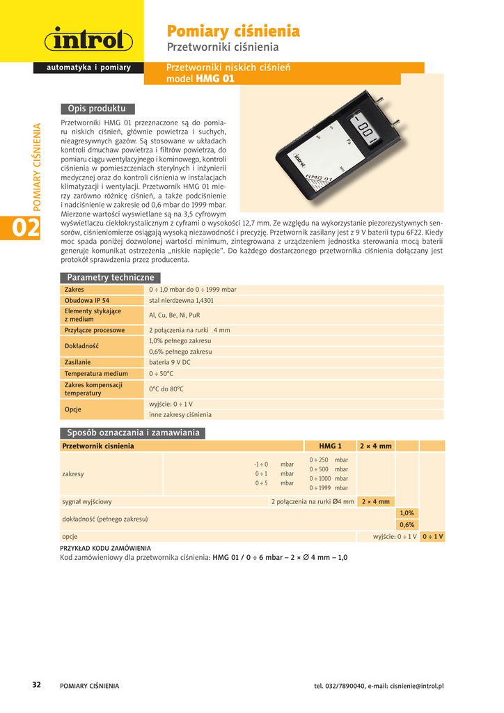 Pomiary ciśnienia Przetworniki ciśnienia Przetworniki niskich ciśnień model HMG 01 POMIARY CIŚNIENIA Opis produktu 02 Przetworniki HMG 01 przeznaczone są do pomiaru niskich ciśnień, głównie powietrza i suchych, nieagresywnych gazów. Są stosowane w układach kontroli dmuchaw powietrza i filtrów powietrza, do pomiaru ciągu wentylacyjnego i kominowego, kontroli ciśnienia w pomieszczeniach sterylnych i inżynierii medycznej oraz do kontroli ciśnienia w instalacjach klimatyzacji i wentylacji. Przetwornik HMG 01 mierzy zarówno różnicę ciśnień, a także podciśnienie i nadciśnienie w zakresie od 0,6 mbar do 1999 mbar. Mierzone wartości wyswietlane są na 3,5 cyfrowym wyświetlaczu ciekłokrystalicznym z cyframi o wysokości 12,7 mm. Ze względu na wykorzystanie piezorezystywnych sensorów, ciśnieniomierze osiągają wysoką niezawodność i precyzję. Przetwornik zasilany jest z 9 V baterii typu 6F22. Kiedy moc spada poniżej dozwolonej wartości minimum, zintegrowana z urządzeniem jednostka sterowania mocą baterii generuje komunikat ostrzeżenia „niskie napięcie”. Do każdego dostarczonego przetwornika ciśnienia dołączany jest protokół sprawdzenia przez producenta. Parametry techniczne Zakres 0 ÷ 1,0 mbar do 0 ÷ 1999 mbar Obudowa IP 54 stal nierdzewna 1,4301 Elementy stykające z medium Al, Cu, Be, Ni, PuR Przyłącze procesowe 2 połączenia na rurki 4 mm Dokładność 1,0% pełnego zakresu 0,6% pełnego zakresu Zasilanie bateria 9 V DC Temperatura medium 0 ÷ 50°C Zakres kompensacji temperatury 0°C do 80°C Opcje wyjście: 0 ÷ 1 V inne zakresy ciśnienia Sposób oznaczania i zamawiania Przetwornik cisnienia zakresy sygnał wyjściowy HMG 1 -1 ÷ 0 0÷1 0÷5 mbar mbar mbar 0 ÷ 250 0 ÷ 500 0 ÷ 1000 0 ÷ 1999 2 × 4 mm mbar mbar mbar mbar 2 połączenia na rurki Ø4 mm 2 × 4 mm 1,0% dokładność (pełnego zakresu) 0,6% wyjście: 0 ÷ 1 V 0 ÷ 1 V opcje PRZYKŁAD KODU ZAMÓWIENIA Kod zamówieniowy dla przetwornika ciśnienia: HMG 01 / 0 ÷ 6 mbar – 2 × Ø 4 mm – 1,0 32 POMIARY CIŚNIENIA tel. 032/7890040, e-mail: [email protected]
