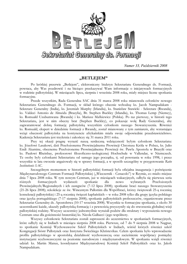 Numer 33, Październik 2008 „BETLEJEM” Po krótkiej przerwie „Betlejem”, elektroniczny biuletyn Sekretariatu Generalnego ds. Formacji, powraca, aby Was pozdrowić i na bieżąco przekazywać Wam informacje o inicjatywach formacyjnych w rodzinie pallotyńskiej. W miesiącach: lipcu, sierpniu i wrześniu 2008 roku, miały miejsce liczne spotkania formacyjne. Przede wszystkim, Rada Generalna SAC dnia 31 marca 2008 roku mianowała członków nowego Sekretariatu Generalnego ds. Formacji, w skład którego obecnie wchodzą: ks. Jacob Nampudakam Sekretarz Generalny (India), ks. Jeremiah Murphy (Irlandia), ks. Stanisław Stawicki - Sekretarz (Rwanda), ks. Valdeci Antonio de Almeida (Brazylia), Br. Stephen Buckley (Irlandia), ks. Thomas Lemp (Niemcy), ks. Romuald Uzubumwana (Rwanda) i ks. Mariusz Małkiewicz (Polska). Po raz pierwszy, w historii tego Sekretariatu, jest w nim obecny brat (Stephen Buckley), co pokazuje wolę Rady Generalnej, aby zagwarantować dobrą formację pallotyńską wszystkim członkom naszego Stowarzyszenia. Również ks. Romuald, ekspert w dziedzinie formacji z Rwandy, został mianowany z tym zamiarem, aby wzrastająca wciąż obecność pallotyńska na kontynencie afrykańskim miała swoje odpowiednie przedstawicielstwo. Kadencja Sekretariatu jest trzyletnia i zakończy się 31 marca 2011 roku. Przy tej okazji pragnę wyrazić naszą serdeczną wdzięczność byłym członkom Sekretariatu: ks. Józefowi Lasakowi, dziś Przełożonemu Prowincjalnemu Prowincji Chrystusa Króla w Polsce, ks. Julio Endi Akamine, obecnemu Przełożonemu Prowincjalnemu Prowincji św. Pawła Apostoła w Brazylii oraz ks. Paulowi Rheinbay, profesorowi filozoficzno-teologicznej Hochschule w Vallendar, w Niemczech. Te osoby były członkami Sekretariatu od samego jego początku, tj. od powstania w roku 1998, i przez wszystkie te lata owocnie angażowały się w sprawy formacji, a w sposób szczególny w przygotowanie Ratio Institutionis SAC. Szczególnym momentem w historii pallotyńskiej formacji była oficjalna inauguracja i poświęcenie Międzynarodowego Centrum Formacji Pallotyńskiej („Wieczernik - Cenacolo”) w Rzymie, co miało miejsce dnia 7 lipca 2008 roku. W tym nowym Centrum, już w miesiącach wakacyjnych, odbyła się pierwsza seria różnych formacyjnych wydarzeń: spotkanie dla nowo wybranych Przełożonych Prowincjalnych/Regionalnych i ich zastępców (7-12 lipca 2008); spotkanie braci naszego Stowarzyszenia (21-26 lipca 2008); rekolekcje ze św. Wincentym Pallottim dla Współbraci, którzy świętowali 25-ą rocznicę konsekracji pallotyńskiej i 25-ą rocznicę święceń kapłańskich w roku 2008 tylko dla grupy języka polskiego oraz języka portugalskiego (7-17 sierpnia 2008); spotkanie pallotyńskich proboszczów, organizowane przez Sekretariat Generalny ds. Apostolstwa (10-17 września 2008). Wszystkie te formacyjne spotkania, z około 30 uczestnikami każde, ukazały pallotyńską formację i z pewnością przyczyniły się do stworzenia globalnej wizji pallotyńskiej rodziny. Wszyscy uczestnicy jednomyślnie wyrażali podziw dla struktury i wyposażenia nowego Centrum oraz dla gościnności braterskiej ks. Nicola Gallucci i jego wspólnoty. Wszyscy członkowie Sekretariatu zostali zaproszeni do uczestnictwa w spotkaniach formacyjnych, które odbyły się w Indiach w miesiącu sierpniu 2008 roku. Pierwsze, od 7 do 9 sierpnia 2008 w Nagpur, to spotkanie Komisji Wychowawców Szkół Pallotyńskich w Indiach, wśród których również szkół Kongregacji Sióstr Pallotynek oraz Instytutu Świeckiego Khristevikas. Celem spotkania było wprowadzenie profilu pallotyńskiego w apostolską działalność wychowawczą oraz zacieśnienie współpracy pomiędzy instytucjami wychowawczymi na poziomie narodowym i międzynarodowym. W spotkaniu wzięli również udział: ks. Martin Manus, koordynator Międzynarodowej Komisji Szkół Pallotyńkich oraz ks. Jakob Nampudakam. Od 18 do 22 sierpnia 2008, w Centrum Mariarani w Trivandrum miało miejsce następne spotkanie międzynarodowe, które zgromadziło 52 formatorów pochodzących z Azji-Oceanii oraz innych krajów. Spotkanie było prawdziwym świętowaniem Zjednoczenia Apostolstwa Katolickiego. Wiodącym tematem spotkania była pallotyńska formacja oraz współpraca międzynarodowa na poziomie kontynentu AzjiOceanii. Wyrażamy nasze podziękowanie ks. Mathew Panakal, dyrektorowi Centrum Mariarani i wszystkim członkom jego wspólnoty za przyjęcie nas w duchu pallotyńskiej wspaniałomyślności. W dniach od 28 do 30 sierpnia 2008 roku, w Wyższym Seminarium Pallotyńskim Prabodhana w Mysore, odbyło się kolejne spotkanie formacyjne dla Rektorów i członków naszych instytucji akademickich. Również i tu tematyka spotkania koncentrowała się wokół wprowadzenia profilu pallotyńskiego do naszej akademickiej formacji oraz do programów akademickich naszych Instytutów, a także wokół zagadnienia międzynarodowej pallotyńskiej współpracy. Została powołana Komisja składająca się z Rektorów naszych czterech szkół akademickich w celu kontynuowania zainicjowanego w czasie spotkania w Mysore procesu. Nasze serdeczne podziękowanie ks. Paulowi Chandrankunnel, Rektorowi oraz całej wspólnocie Prabodhana za wspaniałą organizację oraz wielką gościnność. Zarówno w Centrum Mariarani, jak i w Prabodhana uczestnicy mieli możliwość doświadczyć bogatej różnorodności kultury hinduskiej dzięki występom kulturalnym zorganizowanym i wykonanym przez miejscową młodzież. W sposób szczególny Sekretariat Generalny pragnie wyrazić wdzięczność ks. Peterowi Sticco, Przełożonemu Prowincjalnemu oraz całej Prowincji Niepokalanego Poczęcia za wsparcie finansowe w wysokości 10.000 $ (USD) na pokrycie kosztów organizacji spotkań formacyjnych w Indiach. Niech Bóg im błogosławi za ich hojność. Jesteśmy również wdzięczni Radzie Generalnej SAC za wszelkie wsparcie oraz pomoc finansową, dzięki któr