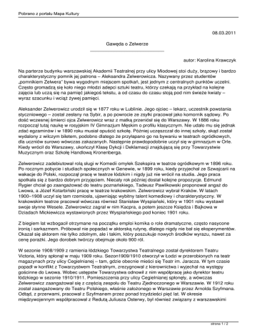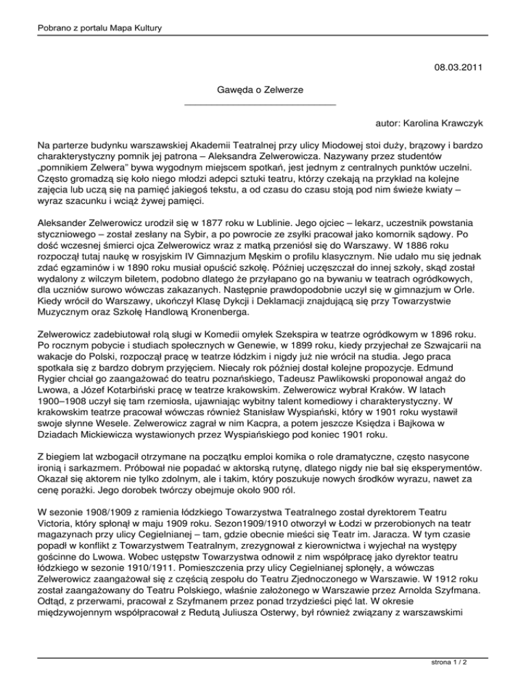 Pobrano z portalu Mapa Kultury 08.03.2011 Gawęda o Zelwerze ____________________________ autor: Karolina Krawczyk Na parterze budynku warszawskiej Akademii Teatralnej przy ulicy Miodowej stoi duży, brązowy i bardzo charakterystyczny pomnik jej patrona – Aleksandra Zelwerowicza. Nazywany przez studentów „pomnikiem Zelwera” bywa wygodnym miejscem spotkań, jest jednym z centralnych punktów uczelni. Często gromadzą się koło niego młodzi adepci sztuki teatru, którzy czekają na przykład na kolejne zajęcia lub uczą się na pamięć jakiegoś tekstu, a od czasu do czasu stoją pod nim świeże kwiaty – wyraz szacunku i wciąż żywej pamięci. Aleksander Zelwerowicz urodził się w 1877 roku w Lublinie. Jego ojciec – lekarz, uczestnik powstania styczniowego – został zesłany na Sybir, a po powrocie ze zsyłki pracował jako komornik sądowy. Po dość wczesnej śmierci ojca Zelwerowicz wraz z matką przeniósł się do Warszawy. W 1886 roku rozpoczął tutaj naukę w rosyjskim IV Gimnazjum Męskim o profilu klasycznym. Nie udało mu się jednak zdać egzaminów i w 1890 roku musiał opuścić szkołę. Później uczęszczał do innej szkoły, skąd został wydalony z wilczym biletem, podobno dlatego że przyłapano go na bywaniu w teatrach ogródkowych, dla uczniów surowo wówczas zakazanych. Następnie prawdopodobnie uczył się w gimnazjum w Orle. Kiedy wrócił do Warszawy, ukończył Klasę Dykcji i Deklamacji znajdującą się przy Towarzystwie Muzycznym oraz Szkołę Handlową Kronenberga. Zelwerowicz zadebiutował rolą sługi w Komedii omyłek Szekspira w teatrze ogródkowym w 1896 roku. Po rocznym pobycie i studiach społecznych w Genewie, w 1899 roku, kiedy przyjechał ze Szwajcarii na wakacje do Polski, rozpoczął pracę w teatrze łódzkim i nigdy już nie wrócił na studia. Jego praca spotkała się z bardzo dobrym przyjęciem. Niecały rok później dostał kolejne propozycje. Edmund Rygier chciał go zaangażować do teatru poznańskiego, Tadeusz Pawlikowski proponował angaż do Lwowa, a Józef Kotarbiński pracę w teatrze krakowskim. Zelwerowicz wybrał Kraków. W latach 1900–1908 uczył się tam rzemiosła, ujawniając wybitny talent komediowy i charakterystyczny. W krakowskim teatrze pracował wówczas również Stanisław Wyspiański, który w 1901 roku wystawił swoje słynne Wesele. Zelwerowicz zagrał w nim Kacpra, a potem jeszcze Księdza i Bajkowa w Dziadach Mickiewicza wystawionych przez Wyspiańskiego pod koniec 1901 roku. Z biegiem lat wzbogacił otrzymane na początku emploi komika o role dramatyczne, często nasycone ironią i sarkazmem. Próbował nie popadać w aktorską rutynę, dlatego nigdy nie bał się eksperymentów. Okazał się aktorem nie tylko zdolnym, ale i takim, który poszukuje nowych środków wyrazu, nawet za cenę porażki. Jego dorobek twórczy obejmuje około 900 ról. W sezonie 1908/1909 z ramienia łódzkiego Towarzystwa Teatralnego został dyrektorem Teatru Victoria, który spłonął w maju 1909 roku. Sezon1909/1910 otworzył w Łodzi w przerobionych na teatr magazynach przy ulicy Cegielnianej – tam, gdzie obecnie mieści się Teatr im. Jaracza. W tym czasie popadł w konflikt z Towarzystwem Teatralnym, zrezygnował z kierownictwa i wyjechał na występy gościnne do Lwowa. Wobec ustępstw Towarzystwa odnowił z nim współpracę jako dyrektor teatru łódzkiego w sezonie 1910/1911. Pomieszczenia przy ulicy Cegielnianej spłonęły, a wówczas Zelwerowicz zaangażował się z częścią zespołu do Teatru Zjednoczonego w Warszawie. W 1912 roku został zaangażowany do Teatru Polskiego, właśnie założonego w Warszawie przez Arnolda Szyfmana. Odtąd, z przerwami, pracował z Szyfmanem przez ponad trzydzieści pięć lat. W okresie międzywojennym współpracował z Redutą Juliusza Osterwy, był również związany z warszawskimi strona 1 / 2 Pobrano z portalu Mapa Kultury Teatrami Miejskimi (1919–1920, 1926–1929), a od 1934 roku – ze wszystkimi teatrami Towarzystwa Krzewienia Kultury Teatralnej oraz z Teatrem Wielkim. Sztuka aktorska Zelwerowicza nie poddaje się jednoznacznym definicjom. Był nie tylko wybitnym realistą, czerpał również inspiracje z rozmaitych stylów i kierunków –naturalizmu, modernizmu, ekspresjonizmu. Zelwerowicz był także cenionym reżyserem, głównie komedii (Fredry i Blizińskiego) – łącznie przygotował około 280 przedstawień. Co więcej, był dyrektorem kilku scen – w Łodzi i Wilnie, a także dyrektorem Teatru Narodowego w Warszawie. Bardzo wcześnie, bo jeszcze w okresie pracy w teatrze krakowskim, objawiły się talenty pedagogiczne Zelwerowicza. Młody aktor otrzymał wówczas propozycję udzielania lekcji recytacji i gry scenicznej. Od 1918 roku wykładał w Warszawskiej Szkole Dramatycznej, a od 1921 roku – w Szkole Dramatycznej przy Konserwatorium Warszawskim. Dwa lata później został jej kierownikiem i przeprowadził gruntowne reformy nauczania. Szkołę prowadził do 1929 roku, a później ponownie od 1931 roku. W 1932 roku doprowadził do powstania Państwowego Instytutu Sztuki Teatralnej – pierwszej polskiej nowoczesnej uczelni kształcącej aktorów i reżyserów. Był dyrektorem PIST-u w latach 1932–1936 i reaktywował Instytut w Łodzi po wojnie. Podczas drugiej wojny światowej ukrywał działacza Bundu i prezesa Rady Pomocy Żydom „Żegota” Leona Feinera, za co w 1977 roku został odznaczony, wraz z córką Leną, medalem Sprawiedliwego wśród Narodów Świata. Zmarł w 1955 roku, został pochowany w alei Zasłużonych na Cmentarzu Wojskowym na Powązkach w Warszawie. Również w 1955 roku jego imię otrzymała PWST w Warszawie, obecnie Akademia Teatralna im. Aleksandra Zelwerowicza. Od 1985 roku redakcja miesięcznika „Teatr” przyznaje nagrodę im. Aleksandra Zelwerowicza dla najlepszej aktorki i najlepszego aktora sezonu. *** O Zelwerze: „Zelwerowicz nie cenił »gry na zimno« – pisała Barbara Osterloff. – Odwro