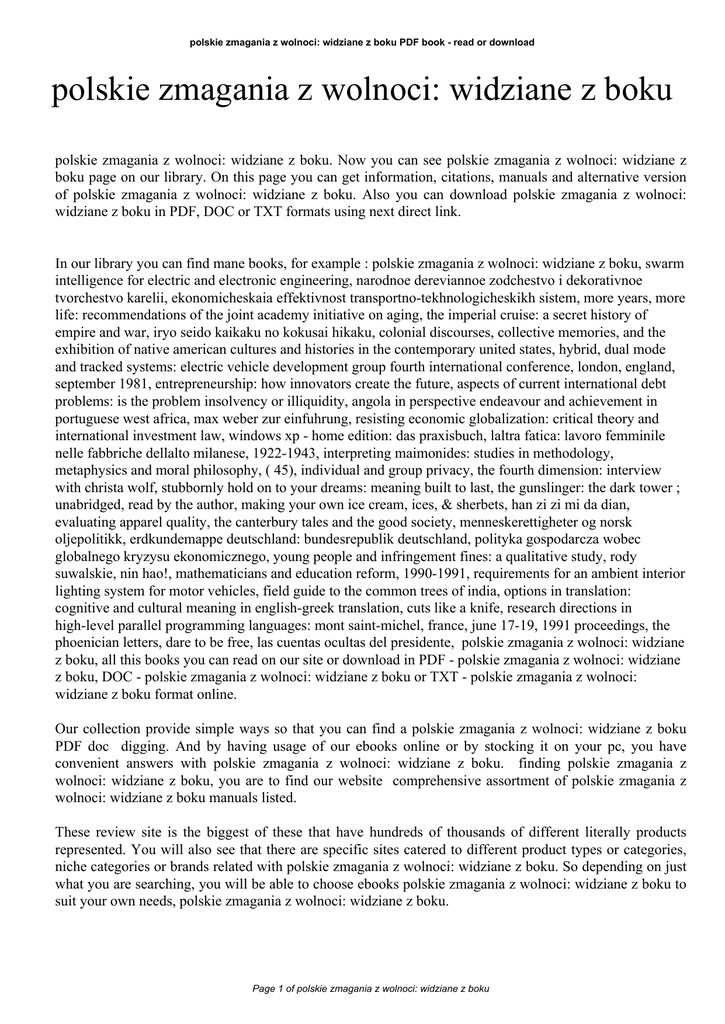 polskie zmagania z wolnoci: widziane z boku PDF book - read or download polskie zmagania z wolnoci: widziane z boku polskie zmagania z wolnoci: widziane z boku. Now you can see polskie zmagania z wolnoci: widziane z boku page on our library. On this page you can get information, citations, manuals and alternative version of polskie zmagania z wolnoci: widziane z boku. Also you can download polskie zmagania z wolnoci: widziane z boku in PDF, DOC or TXT formats using next direct link. In our library you can find mane books, for example : polskie zmagania z wolnoci: widziane z boku, swarm intelligence for electric and electronic engineering, narodnoe dereviannoe zodchestvo i dekorativnoe tvorchestvo karelii, ekonomicheskaia effektivnost transportno-tekhnologicheskikh sistem, more years, more life: recommendations of the joint academy initiative on aging, the imperial cruise: a secret history of empire and war, iryo seido kaikaku no kokusai hikaku, colonial discourses, collective memories, and the exhibition of native american cultures and histories in the contemporary united states, hybrid, dual mode and tracked systems: electric vehicle development group fourth international conference, london, england, september 1981, entrepreneurship: how innovators create the future, aspects of current international debt problems: is the problem insolvency or illiquidity, angola in perspective endeavour and achievement in portuguese west africa, max weber zur einfuhrung, resisting economic globalization: critical theory and international investment law, windows xp - home edition: das praxisbuch, laltra fatica: lavoro femminile nelle fabbriche dellalto milanese, 1922-1943, interpreting maimonides: studies in methodology, metaphysics and moral philosophy, ( 45), individual and group privacy, the fourth dimension: interview with christa wolf, stubbornly hold on to your dreams: meaning built to last, the gunslinger: the dark tower ; unabridged, read by the author, making your own ice cream, ices, & sherbets, han zi zi mi da dian, evaluating apparel quality, the canterbury tales and the good society, menneskerettigheter og norsk oljepolitikk, erdkundemappe deutschland: bundesrepublik deutschland, polityka gospodarcza wobec globalnego kryzysu ekonomicznego, young people and infringement fines: a qualitative study, rody suwalskie, nin hao!, mathematicians and education reform, 1990-1991, requirements for an ambient interior lighting system for motor vehicles, field guide to the common trees of india, options in translation: cognitive and cultural meaning in english-greek translation, cuts like a knife, research directions in high-level parallel programming languages: mont saint-michel, france, june 17-19, 1991 proceedings, the phoenician letters, dare to be free, las cuentas ocultas del presidente, polskie zmagania z wolnoci: widziane z boku, all this books you can read on our site or download in PDF - polskie zmagania z wolnoci: widziane z boku, DOC - polskie zmagania z wolnoci: widziane z boku or TXT - polskie zmagania z wolnoci: widziane z boku format online. Our collection provide simple ways so that you can find a polskie zmagania z wolnoci: widziane z boku PDF doc digging. And by having usage of our ebooks online or by stocking it on your pc, you have convenient answers with polskie zmagania z wolnoci: widziane z boku. finding polskie zmagania z wolnoci: widziane z boku, you are to find our website comprehensive assortment of polskie zmagania z wolnoci: widziane z boku manuals listed. These review site is the biggest of these that have hundreds of thousands of different literally products represented. You will also see that there are specific sites catered to different product types or categories, niche categories or brands related with polskie zmagania z wolnoci: widziane z boku. So depending on just what you are searching, you will be able to choose ebooks polskie zmagania z wolnoci: widziane z boku to suit your own needs, polskie zmagania z wolnoci: widziane z boku. Page 1 of polskie zmagania z wolnoci: widziane z boku