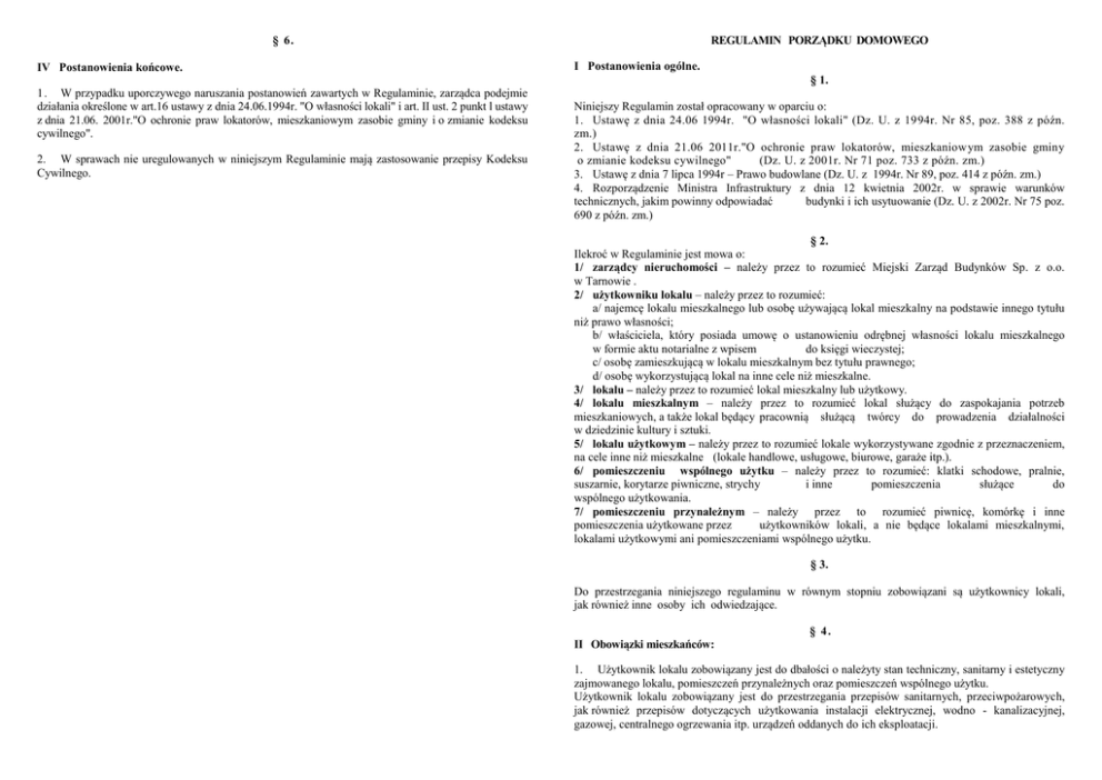 § 6. IV Postanowienia końcowe. 1. W przypadku uporczywego naruszania postanowień zawartych w Regulaminie, zarządca podejmie działania określone w art.16 ustawy z dnia 24.06.1994r. "O własności lokali" i art. II ust. 2 punkt l ustawy z dnia 21.06. 2001r."O ochronie praw lokatorów, mieszkaniowym zasobie gminy i o zmianie kodeksu cywilnego". 2. W sprawach nie uregulowanych w niniejszym Regulaminie mają zastosowanie przepisy Kodeksu Cywilnego. REGULAMIN PORZĄDKU DOMOWEGO I Postanowienia ogólne. § 1. Niniejszy Regulamin został opracowany w oparciu o: 1. Ustawę z dnia 24.06 1994r. "O własności lokali" (Dz. U. z 1994r. Nr 85, poz. 388 z późn. zm.) 2. Ustawę z dnia 21.06 2011r."O ochronie praw lokatorów, mieszkaniowym zasobie gminy o zmianie kodeksu cywilnego" (Dz. U. z 2001r. Nr 71 poz. 733 z późn. zm.) 3. Ustawę z dnia 7 lipca 1994r – Prawo budowlane (Dz. U. z 1994r. Nr 89, poz. 414 z późn. zm.) 4. Rozporządzenie Ministra Infrastruktury z dnia 12 kwietnia 2002r. w sprawie warunków technicznych, jakim powinny odpowiadać budynki i ich usytuowanie (Dz. U. z 2002r. Nr 75 poz. 690 z późn. zm.) § 2. Ilekroć w Regulaminie jest mowa o: 1/ zarządcy nieruchomości – należy przez to rozumieć Miejski Zarząd Budynków Sp. z o.o. w Tarnowie . 2/ użytkowniku lokalu – należy przez to rozumieć: a/ najemcę lokalu mieszkalnego lub osobę używającą lokal mieszkalny na podstawie innego tytułu niż prawo własności; b/ właściciela, który posiada umowę o ustanowieniu odrębnej własności lokalu mieszkalnego w formie aktu notarialne z wpisem do księgi wieczystej; c/ osobę zamieszkującą w lokalu mieszkalnym bez tytułu prawnego; d/ osobę wykorzystującą lokal na inne cele niż mieszkalne. 3/ lokalu – należy przez to rozumieć lokal mieszkalny lub użytkowy. 4/ lokalu mieszkalnym – należy przez to rozumieć lokal służący do zaspokajania potrzeb mieszkaniowych, a także lokal będący pracownią służącą twórcy do prowadzenia działalności w dziedzinie kultury i sztuki. 5/ lokalu użytkowym – należy przez to rozumieć lokale wykorzystywane zgodnie z przeznaczeniem, na cele inne niż mieszkalne (lokale handlowe, usługowe, biurowe, garaże itp.). 6/ pomieszczeniu wspólnego użytku – należy przez to rozumieć: klatki schodowe, pralnie, suszarnie, korytarze piwniczne, strychy i inne pomieszczenia służące do wspólnego użytkowania. 7/ pomieszczeniu przynależnym – należy przez to rozumieć piwnicę, komórkę i inne pomieszczenia użytkowane przez użytkowników lokali, a nie będące lokalami mieszkalnymi, lokalami użytkowymi ani pomieszczeniami wspólnego użytku. § 3. Do przestrzegania niniejszego regulaminu w równym stopniu zobowiązani są użytkownicy lokali, jak również inne osoby ich odwiedzające. § 4. II Obowiązki mieszkańców: 1. Użytkownik lokalu zobowiązany jest do dbałości o należyty stan techniczny, sanitarny i estetyczny zajmowanego lokalu, pomieszczeń przynależnych oraz pomieszczeń wspólnego użytku. Użytkownik lokalu zobowiązany jest do przestrzegania przepisów sanitarnych, przeciwpożarowych, jak również przepisów dotyczących użytkowania instalacji elektrycznej, wodno - kanalizacyjnej, gazowej, centralnego ogrzewania itp. urządzeń oddanych do ich eksploatacji. 2. Awarie lub inne nagłe przypadki mogące zagrażać bezpieczeństwu budynku, życiu, zdrowiu lub mieniu użytkowników lokali należy zgłaszać niezwłocznie zarządcy nieruchomości, a w razie potrzeby powiadamiać również odpowiednie służby, takie jak; straż pożarna, policja, pogotowie ratunkowe itp. a) w przypadku awarii wywołującej szkodę lub grożącej wywołaniem szkody w nieruchomości lub w lokalach – użytkownik lokalu zobowiązany jest do natychmiastowego udostępnienia lokalu w celu usunięcia przyczyn awarii. Jeżeli użytkownik jest nieobecny albo odmawia wstępu do lokalu, zarządca ma prawo wejść do niego w obecności funkcjonariusza policji lub straży miejskiej, a gdy wymaga to pomocy straży pożarnej, także przy jej udziale; b) jeżeli otwarcie lokalu nastąpiło pod nieobecność użytkownika – zarządca jest zobowiązany zabezpieczyć lokal i znajdujące się w nim rzeczy do czasu przybycia użytkownika. Z czynności tych zarządca sporządza protokół; 5. Zabrania się rozpalania otwartego ognia w pomieszczeniach wspólnego użytku, jak również na balkonach i loggiach. 6. Zabrania się użytkowania w lokalach, pomieszczeniach przynależnych oraz w pomieszczeniach wspólnego użytku, urządzeń zasilanych z butli gazowych. 7. Zabrania się przechowywania w pomieszczeniach przynależnych, w pomieszczeniach wspólnego użytku, oraz na balkonach i loggiach motorowerów, motocykli, oraz materiałów łatwopalnych, żrących i cuchnących środków chemicznych, materiałów wybuchowych, gazu w butlach oraz innych rzeczy niebezpiecznych. 8. 9. 3. Użytkownik lokalu zobowiązany jest do udostępnienia lokalu i pomieszczeń przynależnych służbom techniczno - remontowym, jeżeli jest to konieczne do przeprowadzenia remontu lub konserwacji urządzeń wspólnych, jak również - celem przeprowadzania kontroli wynikających z przepisów prawa budowlanego oraz dokonania odczytów urządzeń pomiarowych. 4. Użytkownik lokalu jest zobowiązany do naprawienia na własny koszt wszelkich szkód powstałych z jego winy na terenie nieruchomości, a w przypadku naprawienia takiej szkody na zlecenie zarządcy pokrycia kosztów usunięcia tej szkody. 5. Użytkownik lokalu zobowiązany jest do oszczędnego gospodarowania energią elektryczną i cieplną w pomieszczeniach wspólnego użytku. Zabrania się podłączania prywatnych odbiorników energii elektrycznej w pomieszczeniach przynależnych i pomieszczeniach wspólnego użytku. 6. Użytkownik lokalu, który w zajmowanym lokalu mieszkalnym chce prowadzić działalność gospodarczą winien uzyskać zgodę zarządcy. Zabrania się umieszczania na terenie nie