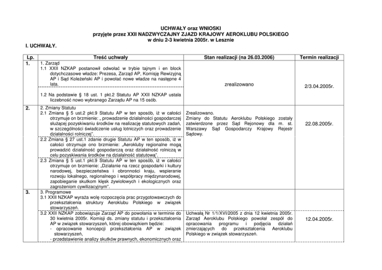 UCHWAŁY oraz WNIOSKI przyjęte przez XXII NADZWYCZAJNY ZJAZD KRAJOWY AEROKLUBU POLSKIEGO w dniu 2-3 kwietnia 2005r. w Lesznie I. UCHWAŁY. Lp. 1. Treść uchwały Stan realizacji (na 26.03.2006) Termin realizacji 1. Zarząd 1.1 XXII NZKAP postanowił odwołać w trybie tajnym i en block dotychczasowe władze: Prezesa, Zarząd AP, Komisję Rewizyjną AP i Sąd Koleżeński AP i powołać nowe władze na następne 4 lata. zrealizowano 2/3.04.2005r. Zrealizowano. Zmiany do Statutu Aeroklubu Polskiego zostały zatwierdzone przez Sąd Rejonowy dla m. st. Warszawy Sąd Gospodarczy Krajowy Rejestr Sądowy. 22.08.2005r. 1.2 Na podstawie § 18 ust. 1 pkt.2 Statutu AP XXII NZKAP ustala liczebność nowo wybranego Zarządu AP na 15 osób. 2. 3. 2. Zmiany Statutu 2.1 Zmiana § 5 ust.2 pkt.9 Statutu AP w ten sposób, iż w całości otrzymuje on brzmienie: „ prowadzenie działalności gospodarczej służącej pozyskiwaniu środków na realizację statutowych zadań, w szczególności świadczenie usług lotniczych oraz prowadzenie działalności rolniczej”. 2.2 Zmiana § 27 ust.1 zdanie drugie Statutu AP w ten sposób, iż w całości otrzymuje ono brzmienie: „Aerokluby regionalne mogą prowadzić działalność gospodarczą oraz działalność rolniczą w celu pozyskiwania środków na działalność statutową”. 2.3 Zmiana § 5 ust.1 pkt.9 Statutu AP w ten sposób, iż w całości otrzymuje on brzmienie: „Działanie na rzecz gospodarki i kultury narodowej, bezpieczeństwa i obronności kraju, wspieranie rozwoju lokalnego, regionalnego i współpracy międzynarodowej, zapobieganie skutkom klęsk żywiołowych i ekologicznych oraz zagrożeniom cywilizacyjnym”. 3. Programowe 3.1 XXII NZKAP wyraża wolę rozpoczęcia prac przygotowawczych do przekształcenia struktury Aeroklubu Polskiego w związek stowarzyszeń. 3.2 XXII NZKAP zobowiązuje Zarząd AP do powołania w terminie do 30 kwietnia 2005r. Komisji ds. zmiany statutu i przekształcenia AP w związek stowarzyszeń, której obowiązkiem będzie: - opracowanie koncepcji przekształcenia AP w związek stowarzyszeń, - przedstawienie analizy skutków prawnych, ekonomicznych oraz Uchwałą Nr 1/1/XVI/2005 z dnia 12 kwietnia 2005r. Zarząd Aeroklubu Polskiego powołał zespół do opracowania programu i podjęcia działań zmierzających do przekształcenia Aeroklubu Polskiego w związek stowarzyszeń. 12.04.2005r. organizacyjnych opracowanych koncepcji, - przedstawienie harmonogramu przekształcenia, - przygotowanie projektów koniecznych do przekształcenia AP w związek stowarzyszeń. 3.3 XXII NZKAP zobowiązuje Zarząd AP do przedstawienia aeroklubom regionalnym w terminie do 30 września 2005r. wyników prac Komisji ds. zmiany statutu i przekształcenia AP w związek stowarzyszeń, jak również ich opublikowania na stronie internetowej AP, w celu ich konsultacji z członkami AP i umożliwienia aeroklubom regionalnym przesłania uwag do Zarządu AP do dnia 15 listopada 2005r. 3.4 XXII NZKAP zobowiązuje Zarząd AP do przedstawienia aeroklubom regionalnym w terminie do 15 grudnia 2005r. wyników pracy Komisji ds. zmiany statutu i przekształcenia AP w związek stowarzyszeń, uwzględniających wyniki przeprowadzonej konsultacji, jak również ich opublikowanie na stronie internetowej AP. 3.5 XXII NKZAP zobowiązuje Zarząd AP do zwołania NZKAP z terminem obrad do dnia 31 stycznia 2006r., którego celem będzie podjęcie uchwał zmierzających do zmian statutu i przekształcenie AP w związek stowarzyszeń. XXII NZKAP zobowiązuje Zarząd AP do kontynuacji i doprowadzenia do jak najszybszego sfinalizowania starań o upoważnienie Aeroklubu Polskiego do wykonywania czynności nadzoru i kontroli na podstawie z art.22 ust.3 ustawy Prawo Lotnicze w odniesieniu do statków powietrznych wymienionych w art.33 ust.2 tej ustawy. 3.7 Zjazd zobowiązuje Zarząd AP do podjęcia działań celem umożliwienia działalności lotniczej lotnictwa ultralekkiego w okresie przejściowym do chwili wydania regulacji prawnych. 3.8 XXII NZKAP zobowiązuje Zarząd AP do powołania Wyniki prac Komisji zostały opublikowane na stronie internetowej AP w formie Komunikatu nr 1 w dniu 1.10.2005 i rozesłane przez Biuro ZAP do aeroklubów regionalnych. Konsultacje są w toku. W tym celu zwołano również na dzień 27.11.2005 roku spotkanie z Dyrektorami i Prezesami aeroklubów regionalnych w Warszawie. W toku przeprowadzonych konsultacji nie wniesiono uwag do koncepcji opracowanej i przedstawionej przez Komisję w Komunikacie nr 1. W związku z tym projekt ten pozostał zachowany bez zmian i był nadal dostępny na stronie internetowej AP. W związku z przypadającym na koniec pierwszego kwartał 2006 roku terminem zwołania Zjazdu Krajowego Aeroklubu Polskiego zwyczajnego – sprawozdawczego zgodnie z § 13 ust.3 Statutu Aeroklubu Polskiego, a co za tym idzie, brakiem celowości zwoływania dwóch zjazdów w zbliżonym terminie, biorąc pod uwagę względy ekonomiczne i organizacyjne - Zarząd Aeroklubu Polskiego postanowił cele postawione przed Nadzwyczajnym Zjazdem Krajowym połączyć z zadaniami Zjazdu Krajowego sprawozdawczego. Uchwałą Nr 81/17/XVI/2005 z dnia 21 grudnia 2005r. został zwołany XXIII Zjazd Krajowy AP w dniu 25 marca 2006r. 3.6 Uchwałą Nr 4/1/XVI/2005 z dnia 12.04.2005r. Zarząd 01.10.2005 r. 27.11.2005r. 25.03.2006r. odpowiedniego zespołu w terminie do 30.04.2005r. Aeroklubu Polskiego powołał zespół w celu opracowania szczegółowego programu i podjęcia działań zmierzających do objęcia nadzoru nad lotnictwem ultralekkim i innymi formami działalności lotniczej przez Aeroklub Polski. 3.9 Zjazd zdecydował o przekazaniu wniosków, które wpłynęły do Komisji Uchwał i Wniosków do rozpatrzenia przez przyszły Zarząd AP. II. WNIOSKI. Lp. 1. 2. 3. 4. 5. 6. 7. 8. 9. 10. 11. 12. 13. Treść wniosku Niżej podpisani wnioskują by przewodniczący i cały skład komisji specjalnościowych przy Aeroklubie Polskim był wybierany przez