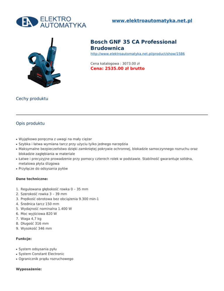 www.elektroautomatyka.net.pl Bosch GNF 35 CA Professional Brudownica http://www.elektroautomatyka.net.pl/product/show/1586 Cena katalogowa : 3073.00 zł Cena: 2535.00 zł brutto Cechy produktu Opis produktu ● ● ● ● ● Wyjątkowo poręczna z uwagi na mały ciężar Szybka i łatwa wymiana tarcz przy użyciu tylko jednego narzędzia Maksymalne bezpieczeństwo dzięki zamkniętej pokrywie ochronnej, blokadzie samoczynnego rozruchu oraz blokadzie zagłębiania w materiale Łatwe i precyzyjne prowadzenie przy pomocy czterech rolek w podstawie. Stabilność gwarantuje solidna, metalowa płyta ślizgowa Przyłącze do odsysania pyłów Dane techniczne: 1. 2. 3. 4. 5. 6. 7. 8. 9. Regulowana głębokość rowka 0 – 35 mm Szerokość rowka 3 – 39 mm Prędkość obrotowa bez obciążenia 9.300 min-1 Średnica tarcz 150 mm Wydajność nominalna 1.400 W Moc wyjściowa 820 W Waga 4,7 kg Długość 316 mm Wysokość 346 mm Funkcje: ● ● ● System odsysania pyłu System Constant Electronic Ogranicznik prądu rozruchowego Wyposażenie: ● ● ● ● ● ● ● ● Kołnierz mocujący Nakrętka okrągła 3 x podkładka dystansowa 4 mm 4 podkładki dystansowe 6 mm Dłuto/nóż odłamujący Klucz oczkowy wygięty Walizka narzędziowa Klucz oczkowy wygięty ELEKTRO-AUTOMATYKA Sprzedaż elektronarzędzi, urządzeń spawalniczych, maszyn budowlanych, pneumatyki, narzędzi warsztatowych, firmowych ubrań roboczych oraz maszyn ogrodowo leśnych. Sklep Bochnia ul. Brzeska 50 32-700 Bochnia Sklep Brzesko ul. Szarych Szeregów 23 32-800 Brzesko Serwis, Magazyn ul. Św. Brata Alberta 4 32-800 Brzesko tel. 691 572 333 e-mail: [email protected] tel. 609 523 230 e-mail: [email protected] tel. 609 523 645 e-mail: [email protected]