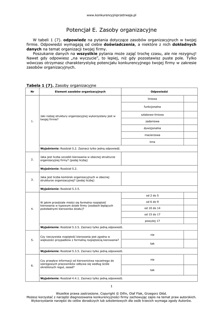 www.konkurencyjniprzetrwaja.pl Potencjał E. Zasoby organizacyjne W tabeli 1 (7). odpowiedz na pytania dotyczące zasobów organizacyjnych w twojej firmie. Odpowiedzi wymagają od ciebie doświadczenia, a niektóre z nich dokładnych danych na temat organizacji twojej firmy. Poszukanie danych na wszystkie pytania może zająć trochę czasu, ale nie rezygnuj! Nawet gdy odpowiesz „na wyczucie”, to lepiej, niż gdy pozostawisz puste pole. Tylko wówczas otrzymasz charakterystykę potencjału konkurencyjnego twojej firmy w zakresie zasobów organizacyjnych. Tabela 1 (7). Zasoby organizacyjne Nr Element zasobów organizacyjnych Odpowiedzi liniowa funkcjonalna 1. Jaki rodzaj struktury organizacyjnej wykorzystany jest w twojej firmie? sztabowo-liniowa zadaniowa dywizjonalna macierzowa inna Wyjaśnienie: Rozdział 5.2. Zaznacz tylko jedną odpowiedź. 2. Jaka jest liczba szczebli kierowania w obecnej strukturze organizacyjnej firmy? (podaj liczbę) Wyjaśnienie: Rozdział 5.2. 3. Jaka jest liczba komórek organizacyjnych w obecnej strukturze organizacyjnej? (podaj liczbę) Wyjaśnienie: Rozdział 5.3.5. od 2 do 5 4. W jakim przedziale mieści się formalna rozpiętość kierowania w typowym dziale firmy (osobach będących podwładnymi kierownika działu)? od 6 do 9 od 10 do 14 od 15 do 17 powyżej 17 Wyjaśnienie: Rozdział 5.3.5. Zaznacz tylko jedną odpowiedź. 5. Czy rzeczywista rozpiętość kierowania jest zgodna w większości przypadków z formalną rozpiętością kierowania? nie tak Wyjaśnienie: Rozdział 5.3.5. Zaznacz tylko jedną odpowiedź. 6. Czy przepływ informacji od kierownictwa naczelnego do szeregowych pracowników odbywa się według ściśle określonych reguł, zasad? nie tak Wyjaśnienie: Rozdział 4.4.1. Zaznacz tylko jedną odpowiedź. 1 Wszelkie prawa zastrzeżone. Copyright © Difin, Olaf Flak, Grzegorz Głód. Możesz korzystać z narzędzi diagnozowania konkurencyjności firmy zachowując zapis na temat praw autorskich. Wykorzystanie narzędzi do celów doradczych lub szkoleniowych dla osób trzecich wymaga zgody Autorów. www.konkurencyjniprzetrwaja.pl bardzo niska niska 7. Jak oceniasz kompletność (zakres obowiązków, uprawnień i odpowiedzialności) opisu stanowisk pracy? średnia wysoka bardzo wysoka Wyjaśnienie: Rozdział 5.2. Zaznacz tylko jedną odpowiedź. bardzo niska niska Jak oceniasz przydatność opisu stanowiska pracy? średnia 8. wysoka bardzo wysoka Wyjaśnienie: Rozdział 5.3.5. Zaznacz tylko jedną odpowiedź. zbyt szczegółowe szczegółowe Jak oceniasz istniejące w firmie regulaminy i instrukcje? 9. odpowiednie ogólne zbyt ogólne Wyjaśnienie: Rozdział 5.1. Zaznacz tylko jedną odpowiedź. bardzo szczegółowo szczegółowo 10. W jakim stopniu określony jest w opisie stanowiska pracy zakres obowiązków pojedynczego pracownika? ogólne bardzo ogólne nie jest określony Wyjaśnienie: Rozdział 5.3.5. Zaznacz tylko jedną odpowiedź. bardzo szczegółowo szczegółowo 11. W jakim stopniu określony jest w opisie stanowiska pracy zakres uprawnień pojedynczego pracownika? ogólne bardzo ogólne nie jest określony Wyjaśnienie: Rozdział 5.3.5. Zaznacz tylko jedną odpowiedź. nie może za zgodą przełożonego 12. W jakim stopniu pojedynczy pracownik może podejmować decyzje niosące za sobą ryzyko niepowodzenia? po poinformowaniu przełożonego wyjątkowo samodzielnie zawsze samodzielnie Wyjaśnienie: Rozdział 5.3.5. Zaznacz tylko jedną odpowiedź. 13. Jaką część procesów celowo dokumentuje się w przedsiębiorstwie oprócz tych wymaganych prawem (niezbędnych do prowadzenia działalności)? nic mniejszość 2 Wszelkie prawa zastrzeżone. Copyright © Difin, Olaf Flak, Grzegorz Głód. Możesz korzystać z narzędzi diagnozowania konkurencyjności firmy zachowując zapis na temat praw autorskich. Wykorzystanie narzędzi do celów doradczych lub szkoleniowych dla osób trzecich wymaga zgody Autorów. www.konkurencyjniprzetrwaja.pl odpowiednią część większość wszystkie Wyjaśnienie: Rozdział 5.3.5. Zaznacz tylko jedną odpowiedź. nie ma dowolności w niewielkim 14. W jakim stopniu pracownik ma dowolność w wyborze sposobu wykonywania zadań? zależnym od zadania w znacznym całkowicie Wyjaśnienie: Rozdział 5.1. Zaznacz tylko jedną odpowiedź. co kilka lat 15. co rok Jak często formalna struktura organizacyjna ulega drobnym zmianom lub uaktualnieniom (szczegóły opisu stanowiska pracy, liczby stanowisk w dziale itp.)? co miesiąc co tydzień codziennie Wyjaśnienie: Rozdział 5.3.5. Zaznacz tylko jedną odpowiedź. co kilkanaście lat 16. Jak często formalna struktura organizacyjna ulega dużym zmianom lub uaktualnieniom (znaczące zmiany liczby stanowisk w dziale, masowe redukcje personelu, łączenie lub dzielenie komórek organizacyjnych itp.)? co kilka lat co rok co kilka miesięcy co miesiąc Wyjaśnienie: Rozdział 5.3.5. Zaznacz tylko jedną odpowiedź. w ogóle są informowani po fakcie W jakim stopniu pracownicy przygotowywani są na duże zmiany struktury organizacyjnej? uczestniczą biernie w ustaleniach 17. zasięga się ich rady są głównymi inicjatorami zmian Wyjaśnienie: Rozdział 5.3.5. Zaznacz tylko jedną odpowiedź. na dysku komputera lub serwerze 18. w wersji papierowej W jaki sposób określona jest strategia rozwoju przedsiębiorstwa? w pojedynczych dokumentach w plotkach powtarzanych przez pracowników w głowie kierownictwa lub właściciela Wyjaśnienie: Rozdział 5.3.5. 19. Jak szczegółowo strategia przedsiębiorstwa została przetłumaczona na plany operacyjne poszczególnych komórek organizacyjnych lub stanowisk pracy? w ogóle w nielicznych wytycznych w licznych wytycznych w postaci harmonogramów 3 Wszelkie prawa zastrzeżone. Copyright © Difin, Olaf Flak, Grzegorz Głód. Możesz korzystać z narzędzi diagnozowania konkurencyjności firmy zachowując zapis na temat praw autorskich. Wykorzystanie narzędzi do celów doradczych lub szkoleniowych dla osób trzecich wymaga 