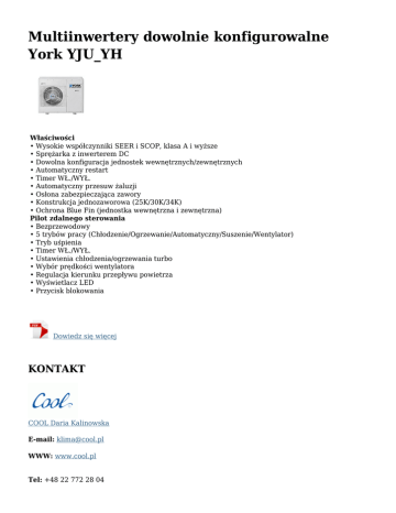 Multiinwertery dowolnie konfigurowalne York YJU_YH Właściwości • Wysokie współczynniki SEER i SCOP, klasa A i wyższe • Sprężarka z inwerterem DC • Dowolna konfiguracja jednostek wewnętrznych/zewnętrznych • Automatyczny restart • Timer WŁ./WYŁ. • Automatyczny przesuw żaluzji • Osłona zabezpieczająca zawory • Konstrukcja jednozaworowa (25K/30K/34K) • Ochrona Blue Fin (jednostka wewnętrzna i zewnętrzna) Pilot zdalnego sterowania • Bezprzewodowy • 5 trybów pracy (Chłodzenie/Ogrzewanie/Automatyczny/Suszenie/Wentylator) • Tryb uśpienia • Timer WŁ./WYŁ. • Ustawienia chłodzenia/ogrzewania turbo • Wybór prędkości wentylatora • Regulacja kierunku przepływu powietrza • Wyświetlacz LED • Przycisk blokowania Dowiedz się więcej KONTAKT COOL Daria Kalinowska E-mail: [email protected] WWW: www.cool.pl Tel: +48 22 772 28 04 Fax: +48 22 772 65 02 Adres: Lipowa 10 05-123 Chotomów