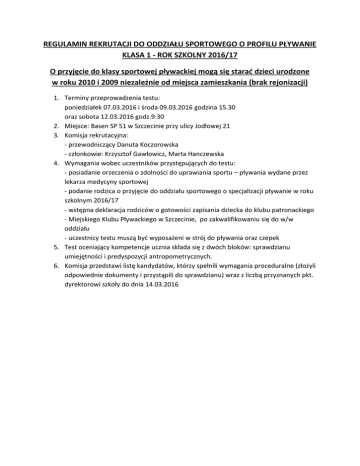REGULAMIN REKRUTACJI DO ODDZIAŁU SPORTOWEGO O PROFILU PŁYWANIE KLASA 1 - ROK SZKOLNY 2016/17 O przyjęcie do klasy sportowej pływackiej mogą się starać dzieci urodzone w roku 2010 i 2009 niezależnie od miejsca zamieszkania (brak rejonizacji) 1. Terminy przeprowadzenia testu: poniedziałek 07.03.2016 i środa 09.03.2016 godzina 15.30 oraz sobota 12.03.2016 godz.9:30 2. Miejsce: Basen SP 51 w Szczecinie przy ulicy Jodłowej 21 3. Komisja rekrutacyjna: - przewodniczący Danuta Koczorowska - członkowie: Krzysztof Gawłowicz, Marta Hanczewska 4. Wymagania wobec uczestników przystępujących do testu: - posiadanie orzeczenia o zdolności do uprawiania sportu – pływania wydane przez lekarza medycyny sportowej - podanie rodzica o przyjęcie do oddziału sportowego o specjalizacji pływanie w roku szkolnym 2016/17 - wstępna deklaracja rodziców o gotowości zapisania dziecka do klubu patronackiego - Miejskiego Klubu Pływackiego w Szczecinie, po zakwalifikowaniu się do w/w oddziału - uczestnicy testu muszą być wyposażeni w strój do pływania oraz czepek 5. Test oceniający kompetencje ucznia składa się z dwóch bloków: sprawdzianu umiejętności i predyspozycji antropometrycznych. 6. Komisja przedstawi listę kandydatów, którzy spełnili wymagania proceduralne (złożyli odpowiednie dokumenty i przystąpili do sprawdzianu) wraz z liczbą przyznanych pkt. dyrektorowi szkoły do dnia 14.03.2016 Test sprawności fizycznej oceniający kompetencje dziecka i kwalifikujący do oddziału sportowego -klasy 1 o specjalizacji pływanie Test ma za zadanie określić predyspozycje do podjęcia treningu pływackiego na etapie wstępnym: stopień oswojenia z wodą, umiejętność adaptacji w środowisku wodnym (wykonywanie prostych ćwiczeń), predyspozycje antropometrychne (wzrost, smukła sylwetka, gibkość) 1. Elementy składowe sprawdzianu predyspozycji anropometrycznych i punktacja: a. wzrost – 10pkt otrzymuje pierwsza 10 dziewcząt i chłopców, druga 10 – 5 pkt, trzecia 10 – 2pkt. b. smukła budowa ciała – typ budowy I i V – 10 pkt, typ budowy H – 5pkt, typ budowy A – 2 pkt c. skłon do przodu o prostych nogach – zasięg (-10 do 0)-5pkt, (+1 do + 5)- 2 pkt , (+6 do …+)- 0 pkt Maksymalna ilość punktów do uzyskania w części 1. – 25pkt 2. Elementy składowe sprawdzianu umiejętności w środowisku wodnym: a) swobodne brodzenie – 1 pkt b) podskoki obunóż – 2 pkt c) obrót wokół osi ciała – 2pkt d) swobodny wydech przy ścianie 5 wydechów – 5pkt e) marsz z deską z regularnym wydechem – 5 pkt f) poślizg na piersiach – 10 pkt g) poślizg na plecach – 10 pkt h) praca nóg do kraula w poślizgu z wydechem – 15 pkt Maksymalna ilość punktów do uzyskania w części 2. – 50 pkt. 3. Podsumowanie sprawdzianu odbywa się po zsumowaniu pkt. z części 1 i 2 oraz ustaleniu rankingu osobno w kategorii chłopców i dziewcząt. 4. Do klasy sportowej 1 wstępnie ustala się liczbę 12 chłopców i 12 dziewcząt. Komisja w szczególnych przypadkach może zdecydować o zmianie tej proporcji.