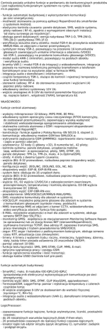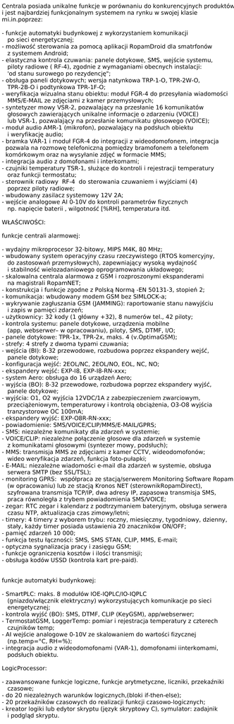 Centrala posiada unikalne funkcje w porównaniu do konkurencyjnych produktów i jest najbardziej funkcjonalnym systemem na rynku w swojej klasie mi.in.poprzez: - funkcje automatyki budynkowej z wykorzystaniem komunikacji po sieci energetycznej; - możliwość sterowania za pomocą aplikacji RopamDroid dla smatrfonów z systemem Android; - elastyczna kontrola czuwania: panele dotykowe, SMS, wejście systemu, piloty radiowe ( RF-4), zgodnie z wymaganiami obecnych instalacji: 'od stanu surowego po rezydencję"; - obsługa paneli dotykowych; wersja natynkowa TRP-1-O, TPR-2W-O, TPR-2B-O i podtynkowa TPR-1F-O; - weryfikacja wizualna stanu obiektu: moduł FGR-4 do przesyłania wiadomości MMS/E-MAIL ze zdjęciami z kamer przemysłowych; - syntetyzer mowy VSR-2, pozwalający na przesłanie 16 komunikatów głosowych zawierających unikalne informacje o zdarzeniu (VOICE) lub VSR-1, pozwalający na przesłanie komunikatu głosowego (VOICE); - moduł audio AMR-1 (mikrofon), pozwalający na podsłuch obiektu i weryfikację audio; - bramka VAR-1 i moduł FGR-4 do integracji z wideodomofonem, integracja pozwala na rozmowę telefoniczną pomiędzy bramofonem a telefonem komórkowym oraz na wysyłanie zdjęć w formacie MMS; - integracja audio z domofonami i interkomami; - czujniki temperatury TSR-1, służące do kontroli i rejestracji temperatury oraz funkcji termostatu; - sterownik radiowy RF-4 do sterowania czuwaniem i wyjściami (4) poprzez piloty radiowe; - wbudowany zasilacz systemowy 12V 2A; - wejście analogowe AI 0-10V do kontroli parametrów fizycznych np. napięcie baterii , wilgotność [%RH], temperatura itd. WŁAŚCIWOŚCI: funkcje centrali alarmowej: - wydajny mikroprocesor 32-bitowy, MIPS M4K, 80 MHz; - wbudowany system operacyjny czasu rzeczywistego (RTOS komercyjny, do zastosowań przemysłowych), zapewniający wysoką wydajność i stabilność wielozadaniowego oprogramowania układowego; - skalowalna centrala alarmowa z GSM i rozproszonymi ekspanderami na magistrali RopamNET; - konstrukcja i funkcje zgodne z Polską Normą -EN 50131-3, stopień 2; - komunikacja: wbudowany modem GSM bez SIMLOCK-a; - wykrywanie zagłuszania GSM (JAMMING): raportowanie stanu nawyjściu i zapis w pamięci zdarzeń; - użytkownicy: 32 kody (1 główny +32), 8 numerów tel., 42 piloty; - kontrola systemu: panele dotykowe, urządzenia mobilne (app, webserwer– w opracowaniu), piloty, SMS, DTMF, I/O; - panele dotykowe: TPR-1x, TPR-2x, maks. 4 (v.OptimaGSM); - strefy: 4 strefy z dwoma typami czuwania; - wejścia (BI): 8-32 przewodowe, rozbudowa poprzez ekspandery wejść, panele dotykowe; - konfiguracja wejść: 2EOL/NC, 2EOL/NO, EOL, NC, NO; - ekspandery wejść: EXP-I8, EXP-I8-RN-xxx; - system Aero: obsługa do 16 urządzeń Aero; - wyjścia (BO): 8-32 przewodowe, rozbudowa poprzez ekspandery wyjść, panele dotykowe; - wyjścia: O1, O2 wyjścia 12VDC/1A z zabezpieczeniem zwarciowym, przeciążeniowym, temperaturowy i kontrolą obciążenia, O3-O8 wyjścia tranzystorowe OC 100mA; - ekspandery wyjść: EXP-O8R-RN-xxx; - powiadomienie: SMS/VOICE/CLIP/MMS/E-MAIL/GPRS; - SMS: niezależne komunikaty dla zdarzeń w systemie; - VOICE/CLIP: niezależne połączenie głosowe dla zdarzeń w systemie z komunikatami głosowymi (syntezer mowy, podsłuch); - MMS: transmisja MMS ze zdjęciami z kamer CCTV, wideodomofonów; wideo weryfikacja zdarzeń, funkcja foto-pułapki; - E-MAIL: niezależne wiadomości e-mail dla zdarzeń w systemie, obsługa serwera SMTP (bez SSL/TSL); - monitoring GPRS: współpraca ze stacją/serwerem Monitoring Software Ropam (w opracowaniu) lub ze stacją Kronos NET (sterownikRopamDirect), szyfrowana transmisja TCP/IP, dwa adresy IP, zapasowa transmisja SMS, praca równoległa z trybem powiadomienia SMS/VOICE; - zegar: RTC zegar i kalendarz z podtrzymaniem bateryjnym, obsługa serwera czasu NTP, aktualizacja czas zimowy/letni; - timery: 4 timery z wyborem trybu: roczny, miesięczny, tygodniowy, dzienny, stały, każdy timer posiada ustawienia 20 znaczników ON/OFF; - pamięć zdarzeń 10 000; - funkcja testu łączności: SMS, SMS STAN, CLIP, MMS, E-mail; - optyczna sygnalizacja pracy i zasięgu GSM; - funkcje ograniczenia kosztów i ilości transmisji; - obsługa kodów USSD (kontrola kart pre-paid). funkcje automatyki budynkowej: - SmartPLC: maks. 8 modułów IOE-IQPLC/IO-IQPLC (gniazdo/włącznik elektryczny) wykorzystujących komunikacje po sieci energetycznej; - kontrola wyjść (BO): SMS, DTMF, CLIP (KeyGSM), app/webserwer; - TermostatGSM, LoggerTemp: pomiar i rejestracja temperatury z czterech czujników temp; - AI wejście analogowe 0-10V ze skalowaniem do wartości fizycznej (np.temp=°C, RH=%); - integracja audio z wideodomofonami (VAR-1), domofonami iinterkomami, podsłuch obiektu. LogicProcessor: - zaawansowane funkcje logiczne, funkcje arytmetyczne, liczniki, przekaźniki czasowe; - do 20 niezależnych warunków logicznych,(bloki if-then-else); - 20 przekaźników czasowych do realizacji funkcji czasowo-logicznych; - kreator logiki lub edytor skryptu (język skryptowy C), symulator: zadajnik i podgląd skryptu.