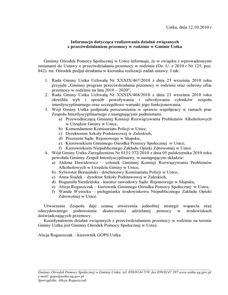 Ustka, dnia 12.10.2010 r Informacja dotycząca realizowania działań związanych z przeciwdziałaniem przemocy w rodzinie w Gminie Ustka Gminny Ośrodek Pomocy Społecznej w Ustce informuje, Ŝe w związku z wprowadzonymi zmianami do Ustawy o przeciwdziałaniu przemocy w rodzinie (Dz. U. z 2010 r Nr 125, poz. 842) tut. Ośrodek podjął działania w kierunku realizacji zadań ustawy. I tak: 1. Rada Gminy Ustka Uchwałą Nr XXXIX/467/2010 z dnia 23 września 2010 roku przyjęła „Gminny program przeciwdziałania przemocy w rodzinie oraz ochrony ofiar przemocy w rodzinie na lata 2010 – 2020”, 2. Rada Gminy Ustka Uchwałą Nr XXXIX/468/2010 z dnia 23 września 2010 roku określiła tryb i sposób powoływania i odwoływania członków zespołu interdyscyplinarnego oraz szczegółowe warunki jego funkcjonowania, 3. Wójt Gminy Ustka podpisała porozumienia w sprawie współpracy w ramach prac Zespołu Interdyscyplinarnego z następującymi podmiotami: a) Przewodniczącą Gminnej Komisji Rozwiązywania Problemów Alkoholowych w Urzędzie Gminy w Ustce, b) Komendantem Komisariatu Policji w Ustce, c) Dyrektorem Szkoły Podstawowej w Zaleskich, d) Prezesem Sądu Rejonowego w Słupsku, e) Kierownikiem Gminnego Ośrodka Pomocy Społecznej w Ustce, f) Kierownikiem Niepublicznego Zakładu Opieki Zdrowotnej w Ustce. 4. Wójt Gminy Ustka Zarządzeniem Nr 0151/372/2010 z dnia 05 października 2010 roku powołała Gminny Zespół Interdyscyplinarny, w następującym składzie: a) Aldona Dawidowicz – członek Gminnej Komisji Rozwiązywania Problemów Alkoholowych w Urzędzie Gminy w Ustce, b) Sylwester Borusiński - dzielnicowy Komisariatu Policji w Ustce, c) Anna Siudek – dyrektor Szkoły Podstawowej w Zaleskich, d) Bogumiła Sierdzińska - kurator zawodowy Sądu Rejonowego w Słupsku, e) Alicja Roguszczak – kierownik Gminnego Ośrodka Pomocy Społecznej w Ustce, f) Wanda Wysocka – pielęgniarka środowiskowa Niepublicznego Zakładu Opieki Zdrowotnej w Ustce. Utworzenie Zespołu daje szansę stworzenia jednolitej strategii wsparcia oraz zdecydowanego podniesienia skuteczności udzielanej pomocy w środowiskach doświadczających przemocy. Koordynatorem działań związanych z przeciwdziałaniem przemocy w rodzinie na terenie Gminy Ustka jest Gminny Ośrodek Pomocy Społecznej w Ustce. Alicja Roguszczak – kierownik GOPS Ustka __________________________________________________________________________________________ Gminny Ośrodek Pomocy Społecznej w Gminie Ustka: tel. 059/8144 578 fax 059/8147 197 www.ustka.ug.gov.pl e-mail: [email protected] Sporządziła: Alicja Roguszczak