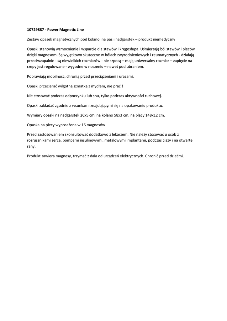 10729887 - Power Magnetic Line Zestaw opasek magnetycznych pod kolano, na pas i nadgarstek – produkt niemedyczny Opaski stanowią wzmocnienie i wsparcie dla stawów i kręgosłupa. Uśmierzają ból stawów i pleców dzięki magnesom. Są wyjątkowo skuteczne w bólach zwyrodnieniowych i reumatycznych - działają przeciwzapalnie - są niewielkich rozmiarów - nie szpecą – mają uniwersalny rozmiar – zapięcie na rzepy jest regulowane - wygodne w noszeniu – nawet pod ubraniem. Poprawiają mobilność, chronią przed przeciążeniami i urazami. Opaski przecierać wilgotną szmatką z mydłem, nie prać ! Nie stosować podczas odpoczynku lub snu, tylko podczas aktywności ruchowej. Opaski zakładać zgodnie z rysunkami znajdującymi się na opakowaniu produktu. Wymiary opaski na nadgarstek 26x5 cm, na kolano 58x3 cm, na plecy 148x12 cm. Opaska na plecy wyposażona w 16 magnesów. Przed zastosowaniem skonsultować dodatkowo z lekarzem. Nie należy stosować u osób z rozrusznikami serca, pompami insulinowymi, metalowymi implantami, podczas ciąży i na otwarte rany. Produkt zawiera magnesy, trzymać z dala od urządzeń elektrycznych. Chronić przed dziećmi.