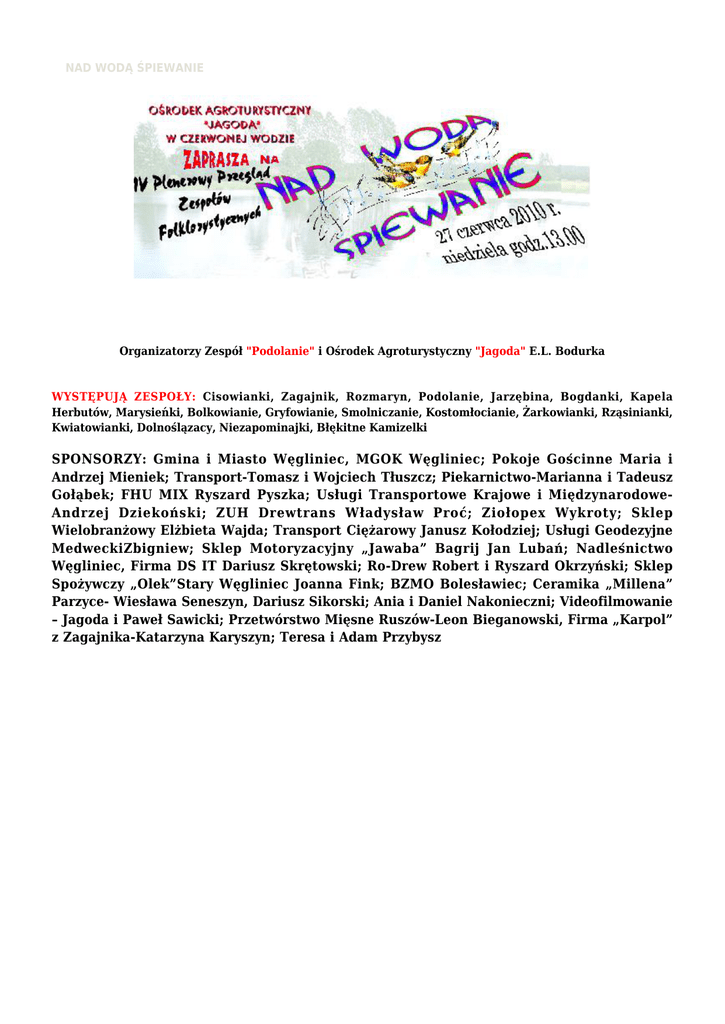 NAD WODĄ ŚPIEWANIE Organizatorzy Zespół "Podolanie" i Ośrodek Agroturystyczny "Jagoda" E.L. Bodurka WYSTĘPUJĄ ZESPOŁY: Cisowianki, Zagajnik, Rozmaryn, Podolanie, Jarzębina, Bogdanki, Kapela Herbutów, Marysieńki, Bolkowianie, Gryfowianie, Smolniczanie, Kostomłocianie, Żarkowianki, Rząsinianki, Kwiatowianki, Dolnoślązacy, Niezapominajki, Błękitne Kamizelki SPONSORZY: Gmina i Miasto Węgliniec, MGOK Węgliniec; Pokoje Gościnne Maria i Andrzej Mieniek; Transport-Tomasz i Wojciech Tłuszcz; Piekarnictwo-Marianna i Tadeusz Gołąbek; FHU MIX Ryszard Pyszka; Usługi Transportowe Krajowe i MiędzynarodoweAndrzej Dziekoński; ZUH Drewtrans Władysław Proć; Ziołopex Wykroty; Sklep Wielobranżowy Elżbieta Wajda; Transport Ciężarowy Janusz Kołodziej; Usługi Geodezyjne MedweckiZbigniew; Sklep Motoryzacyjny „Jawaba” Bagrij Jan Lubań; Nadleśnictwo Węgliniec, Firma DS IT Dariusz Skrętowski; Ro-Drew Robert i Ryszard Okrzyński; Sklep Spożywczy „Olek”Stary Węgliniec Joanna Fink; BZMO Bolesławiec; Ceramika „Millena” Parzyce- Wiesława Seneszyn, Dariusz Sikorski; Ania i Daniel Nakonieczni; Videofilmowanie – Jagoda i Paweł Sawicki; Przetwórstwo Mięsne Ruszów-Leon Bieganowski, Firma „Karpol” z Zagajnika-Katarzyna Karyszyn; Teresa i Adam Przybysz