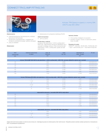 CONNECT TRI-CLAMP FITTING 245 FOOD Assembly Króciec TRI-Clamp w oparciu o normy DIN 32676 oraz ISO 2852 Zastosowania • dostosowany do przepisów dyrektywy RoHS • przemysł spożywczy, farmaceutyczny: artykuły spożywcze, farmaceutyki • transportery podciśnieniowe, urządzenia do transportu podciśnieniowego, systemy dozujące • prasy do tabletek Zakres temperatur • -40°C do 90°C Właściwości śred. średnica znamionowa w calach znamionowa mm warianty dostaw Konstrukcja, materiał armatura: stal szlachetna 1.4404 (z próbą stali) = AISI 316L; odpowiednie akcesoria składające się z: uszczelki (z białego silikonu, FDA), króćca (ze stali szlachetnej 1.4404, z próbą stali), opaski (ze stali szlachetnej) zewn. Ø kołnierza mm • inne wymiary dostępne na życzenie • szczelny na gazy i ciecze, w wykonaniu zatopionym na stałe Pasująca do węża AIRDUC® : 350 (AS / AS BLACK / FOOD-AS); 351 + 355 + 356 (FOOD); 351 + 355 INOX FOOD-AS masa kg / szt. odpowiedni do wewn. Ø węża mm Nr zam. xxx króciec TRI-CLAMP DIN 32676; stal szlachetna 1.4404 (z próbą stali) = AISI 316L; (proszę oddzielnie wybrać wąż i montaż) 25 - 50,5 0,090 ø 25 245-0025-2914 32 - 50,5 0,090 ø 32 245-0032-2914 40 - 50,5 0,080 ø 40 245-0040-2914 50 - 64,0 0,160 ø 50 245-0050-2914 65 - 91,0 0,180 ø 65 245-0065-2914 80 - 106,0 0,380 ø 80 245-0080-2914 100 - 119,0 0,420 ø 100 245-0100-2914 xxx króciec TRI-Clamp ISO 2852; stal szlachetna 1.4404 (z próbą stali) = AISI 316L; (proszę oddzielnie wybrać wąż i montaż) - 1" 50,5 0,090 ø 25 245-0025-2923 - 1 1/2" 50,5 0,110 ø 40 245-0040-2923 - 2" 64,0 0,160 ø 50 245-0050-2923 - 2 1/2" 77,5 0,170 ø 65 245-0065-2923 - 3" 91,0 0,350 Ø 75 245-0075-2923 - 4" 119,0 0,420 ø 100 245-0100-2923 xxx odpowiednie akcesoria ; uszczelka DIN 32676; biały silikon 25 - 50,5 - ø 25 245-0025-8912 32 - 50,5 - ø 32 245-0032-8912 40 - 50,5 - ø 40 245-0040-8912 50 - 64,0 - ø 50 245-0050-8912 65 - 91,0 - ø 65 245-0065-8912 80 - 106,0 - ø 80 245-0080-8912 100 - 119,0 - ø 100 245-0100-8912 xxx odpowiednie akcesoria ; uszczelka ISO 2852; biały silikon - 1" 50,5 - ø 25 245-0025-8916 - 1 1/2" 50,5 - ø 40 245-0040-8916 - 2" 64,0 - ø 50 245-0050-8916 - 2 1/2" 77,5 - ø 65 245-0065-8916 20161123 Dalsze dane techniczne podano na stronie www.norres.com. Zastrzega się prawo do dokonywania zmian technicznych. Wszystkie podane wartości zostały wyznaczone w temperaturze 20°C i są wartościami przybliżonymi. www.norres.com 1 CONNECT TRI-CLAMP FITTING 245 śred. znamionowa mm średnica znamionowa w calach FOOD zewn. Ø kołnierza mm masa kg / szt. Assembly odpowiedni do wewn. Ø węża mm Nr zam. - 3" 91,0 - Ø 75 245-0075-8916 - 4" 119,0 - ø 100 245-0100-8916 xxx odpowiednie akcesoria ; króciec do przyspawania DIN 32676 25 - 50,5 - ø 25 245-0025-8913 32 - 50,5 - ø 32 245-0032-8913 40 - 50,5 - ø 40 245-0040-8913 50 - 64,0 - ø 50 245-0050-8913 65 - 91,0 - ø 65 245-0065-8913 80 - 106,0 - ø 80 245-0080-8913 100 - 119,0 - ø 100 245-0100-8913 xxx odpowiednie akcesoria ; króciec do przyspawania ISO 2852 - 1" 50,5 - ø 25 245-0025-8917 - 1 1/2" 50,5 - ø 40 245-0040-8917 - 2" 64,0 - ø 50 245-0050-8917 - 2 1/2" 77,5 - ø 65 245-0065-8917 - 3" 91,0 - Ø 75 245-0075-8917 - 4" 119,0 - ø 100 245-0100-8917 xxx odpowiednie akcesoria ; opaska zaciskowa; stal szlachetna 25 / 32 / 38 / 40 1" 50,5 - 25 245-0025-8914 50 2" 64,0 - 50 245-0050-8914 - 2 1/2" 77,5 - 55 245-0055-8914 65 3" 91,0 - 65 245-0065-8914 80 - 106,0 - 80 245-0080-8914 100 4" 119,0 - 100 245-0100-8914 Wszystkie dane podane w przybliżeniu i mierzone przy 20°C . Dane techniczne zastrzeżone. Prosimy przestrzegać informacji z dodatku technicznego. Inne wymiary dostępne na życzenie Dodatki CONNECT SAFETY CLAMP ASSEMBLY 231 CONNECT PRESS ASSEMBLY 232 CONNECT MOULD ASSEMBLY 233 20161123 Dalsze dane techniczne podano na stronie www.norres.com. Zastrzega się prawo do dokonywania zmian technicznych. Wszystkie podane wartości zostały wyznaczone w temperaturze 20°C i są wartościami przybliżonymi. www.norres.com 2