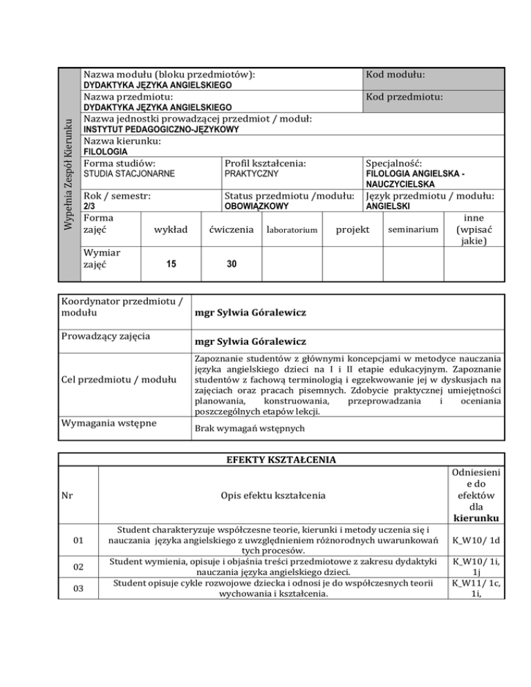 Nazwa modułu (bloku przedmiotów): Kod modułu: Nazwa przedmiotu: Kod przedmiotu: DYDAKTYKA JĘZYKA ANGIELSKIEGO Wypełnia Zespół Kierunku DYDAKTYKA JĘZYKA ANGIELSKIEGO Nazwa jednostki prowadzącej przedmiot / moduł: INSTYTUT PEDAGOGICZNO-JĘZYKOWY Nazwa kierunku: FILOLOGIA Forma studiów: Profil kształcenia: Specjalność: Rok / semestr: Status przedmiotu /modułu: Język przedmiotu / modułu: STUDIA STACJONARNE 2/3 Forma zajęć PRAKTYCZNY FILOLOGIA ANGIELSKA NAUCZYCIELSKA OBOWIĄZKOWY wykład ćwiczenia 15 30 Wymiar zajęć Koordynator przedmiotu / modułu Prowadzący zajęcia Cel przedmiotu / modułu Wymagania wstępne laboratorium ANGIELSKI projekt seminarium inne (wpisać jakie) mgr Sylwia Góralewicz mgr Sylwia Góralewicz Zapoznanie studentów z głównymi koncepcjami w metodyce nauczania języka angielskiego dzieci na I i II etapie edukacyjnym. Zapoznanie studentów z fachową terminologią i egzekwowanie jej w dyskusjach na zajęciach oraz pracach pisemnych. Zdobycie praktycznej umiejętności planowania, konstruowania, przeprowadzania i oceniania poszczególnych etapów lekcji. Brak wymagań wstępnych EFEKTY KSZTAŁCENIA Nr 01 02 03 Opis efektu kształcenia Student charakteryzuje współczesne teorie, kierunki i metody uczenia się i nauczania języka angielskiego z uwzględnieniem różnorodnych uwarunkowań tych procesów. Student wymienia, opisuje i objaśnia treści przedmiotowe z zakresu dydaktyki nauczania języka angielskiego dzieci. Student opisuje cykle rozwojowe dziecka i odnosi je do współczesnych teorii wychowania i kształcenia. Odniesieni e do efektów dla kierunku K_W10/ 1d K_W10/ 1i, 1j K_W11/ 1c, 1i, 12 Student zdobywa, utrwala i posługuje się wiedzą z zakresu dydaktyki języka angielskiego w celu diagnozowania, analizowania, i prognozowania sytuacji pedagogicznych oraz kierowania nimi i dobierania strategii realizowania działań praktycznych (np. rozwijanie autonomii ucznia). Student samodzielnie zdobywa wiedzę i rozwija swoje profesjonalne umiejętności związane z własną działalnością dydaktyczną, korzystając z różnych źródeł i nowoczesnych technologii (np. angielskie biblioteki wirtualne). Student potrafi planować i kierować procesem kształcenia, określając cele i sposoby ich realizacji oraz organizując pracę zespołu klasowego Student posiada rozwinięte kompetencje komunikacyjne; potrafi porozumiewać się z osobami pochodzącymi z różnych środowisk, będącymi w różnej kondycji emocjonalnej, dialogowo rozwiązywać konflikty i konstruować dobrą atmosferę dla komunikacji w klasie języka angielskiego. Student ocenia przydatność typowych metod, procedur i dobrych praktyk do realizacji własnych zadań dydaktycznych. Student dobiera i wykorzystuje dostępne materiały, środki i metody pracy w celu efektywnego nauczania języka angielskiego. Student dostosowuje treści kształcenia oraz metody i techniki pracy do wieku, potrzeb i możliwości uczniów (w tym uczniów ze specjalnymi potrzebami edukacyjnymi) Student buduje wypowiedzi ustne i pisemne, uzasadniające wybór metod i technik pracy z uczniem, posługując się profesjonalnym językiem angielskim. Student ocenia poprawność językową wypowiedzi własnych oraz uczniów 13 Student pracuje nad projektem, planując i koordynując pracę swoją i innych. 14 Student zbiera i porównuje informacje na temat strategii nauczania i uczenia się języków obcych, dyskutuje z innymi, formułuje pytania i wnioski. 15 Student projektuje działania dydaktyczne mające na celu zapoznanie uczniów z różnymi aspektami kultury angloamerykańskiej. 04 05 06 07 08 09 10 11 K_U03/ 2c K_U02/ 2d K_U13/ 2i K_K04/ 2m K_U13/ 2f K_U12/ 2g K_U12 K_U13/ 2h K_U03 K_U11/ 2k K_K05/ 3c K_U07/ 2g K_U12 K_U13 K_K03 K-K04 K_U15 K_K03 K_K05 K_K08 TREŚCI PROGRAMOWE Wykład Psycholingwistyczne podstawy dydaktyki języka angielskiego. Wczesne nauczanie języków obcych: współczesne koncepcje edukacji małego człowieka; rola nauczyciela w edukacji przedszkolnej, wczesnoszkolnej oraz w starszych klasach szkoły podstawowej. Przegląd metod nauczania języka angielskiego pod kątem dostosowania ich do potrzeb i możliwości dziecka. Cechy dobrego nauczyciela języka angielskiego Ćwiczenia Rozwijanie rozumienia ze słuchu w języku angielskim. Nauczanie mówienia w języku angielskim. Nauczanie słownictwa w języku angielskim. Nauczanie wymowy, rytmu i intonacji w języku angielskim. Gry i zabawy w nauczaniu języka angielskiego. Laboratorium nie dotyczy Projekt nie dotyczy Literatura podstawowa Brewster, J., Ellis, G., Girard, D. 1992. The Primary English Teacher’s Guide. Penguin Books Ltd. Brumfit, Ch., Moon, J., Tongue, R. 1984. Teaching English to Children. From Practice to Principle. Longman Ltd. Chauvel, D., Champagne, D., Chauvel, C. 2003. Język angielski w przedszkolu I Literatura uzupełniająca Metody kształcenia szkole podstawowej. Warszawa: CODN Dornyei, Z. 2001. Motivational Strategies in the Language Classroom. Cambridge: CUP. Ellis, G., Brewster, J. 1991. The Storytelling handbook for Primary Teachers. Penguin Books Ltd. Cameron, L. 2001. Teaching Languages to Young Learners. Cambridge: Cambridge University Press McKay, P. 2006. Assessing Young Language Learners. Cambridge: Cambridge University Press. Moon, Jayne. 2000. Children Learning English. Macmillan-Heinemann Ltd Moon, J., Nikolov, M. eds. 2000. Research into Teaching English to Young Learners. Pecs: University Press Pecs. Nunan, D. 2011. Teaching English to Young Learners. Anaheim, CA: Anaheim University Press. O’Regan, F.J. 2007. ADHD. London: Continuum International Publishing Group Pinter, A. 2006. Teaching Young Learners. Oxford: Oxford University Press. Reid, G. 2007. Dyslexia. London: Continuum International Publishing Group wykład konwersatoryjny; wykład problemowy; ćwiczenia audytoryjne; dyskusja; praca z tekstem; burza mózgów; praca grupach; metoda problemowa. Nr efektu kształcenia Metody weryfik