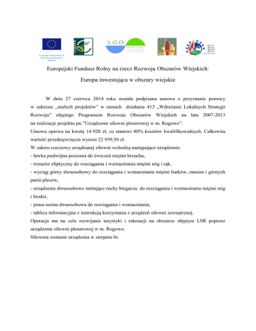 Europejski Fundusz Rolny na Rzecz Rozwoju Obszarów Wiejskich Europejski Fundusz Rolny na rzecz Rozwoju Obszarów Wiejskich: Europa inwestująca w obszary wiejskie W dniu 27 czerwca 2014 roku została podpisana umowa o przyznanie pomocy w zakresie „małych projektów” w ramach działania 413 „Wdrażanie Lokalnych Strategii Rozwoju” objętego Programem Rozwoju Obszarów Wiejskich na lata 2007-2013 na realizacje projektu pn.”Urządzenie siłowni plenerowej w m. Rogowo”. Umowa opiewa na kwotę 14 920 zł, co stanowi 80% kosztów kwalifikowalnych. Całkowita wartość przedsięwzięcia wynosi 22 939,50 zł. W zakres rzeczowy urządzanej siłowni wchodzą następujące urządzenia: - ławka podwójna pozioma do ćwiczeń mięśni brzucha, - trenażer eliptyczny do rozciągania i wzmacniania mięśni nóg i rąk, - wyciąg górny dwuosobowy do rozciągania i wzmacniania mięśni barków, ramion i górnych partii pleców, - urządzenie dwuosobowe imitujące ruchy biegacza do rozciągania i wzmacniania mięśni nóg i bioder, - prasa nożna dwuosobowa do rozciągania i wzmacniania, - tablica informacyjna z instrukcją korzystania z urządzeń siłowni zewnętrznej. Operacja ma na celu rozwijanie turystyki i rekreacji na obszarze objętym LSR poprzez urządzenie siłowni plenerowej w m. Rogowo. Siłownia zostanie urządzona w sierpniu br.