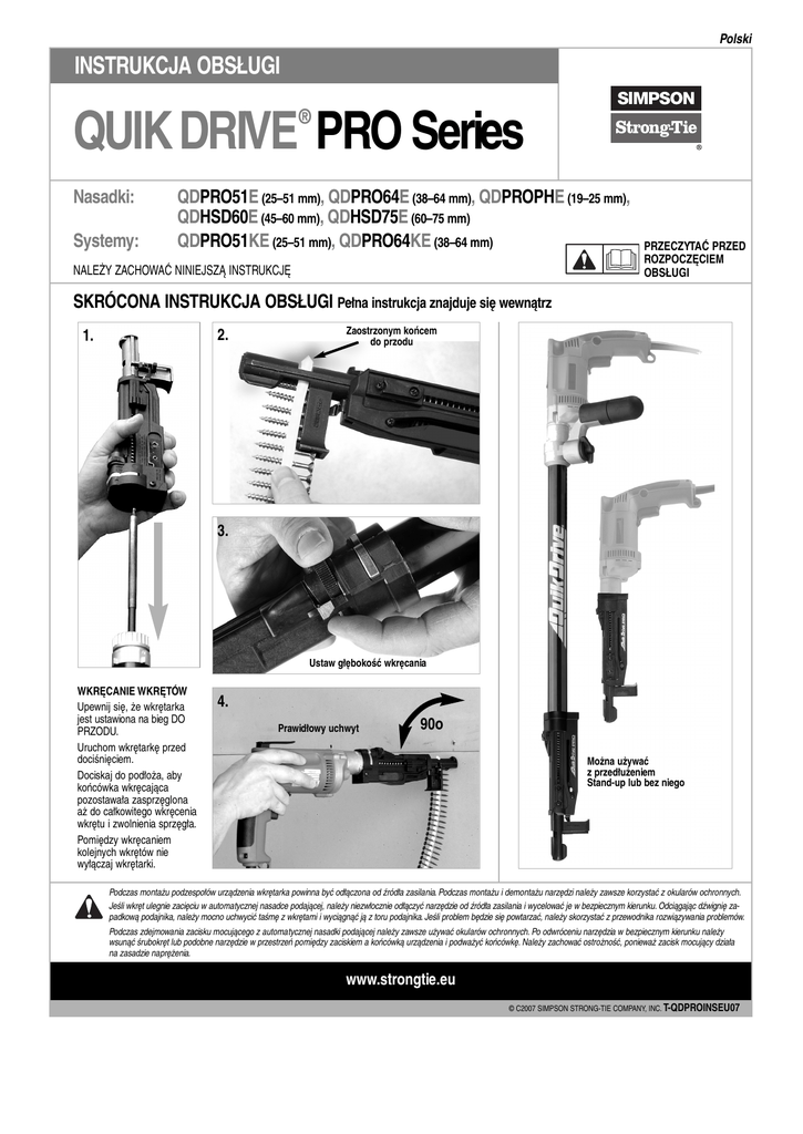 Polski INSTRUKCJA OBSŁUGI QUIK DRIVE PRO Series ® Nasadki: Systemy: QDPRO51E (25–51 mm), QDPRO64E (38–64 mm), QDPROPHE (19–25 mm), QDHSD60E (45–60 mm), QDHSD75E (60–75 mm) QDPRO51KE (25–51 mm), QDPRO64KE (38–64 mm) NALEŻY ZACHOWAĆ NINIEJSZĄ INSTRUKCJĘ PRZECZYTAĆ PRZED ROZPOCZĘCIEM OBSŁUGI SKRÓCONA INSTRUKCJA OBSŁUGI Pełna instrukcja znajduje się wewnątrz 2. 1. Zaostrzonym końcem do przodu 3. Ustaw głębokość wkręcania WKRĘCANIE WKRĘTÓW Upewnij się, że wkrętarka jest ustawiona na bieg DO PRZODU. Uruchom wkrętarkę przed dociśnięciem. Dociskaj do podłoża, aby końcówka wkręcająca pozostawała zasprzęglona aż do całkowitego wkręcenia wkrętu i zwolnienia sprzęgła. Pomiędzy wkręcaniem kolejnych wkrętów nie wyłączaj wkrętarki. 4. Prawidłowy uchwyt 90o Można używać z przedłużeniem Stand-up lub bez niego Podczas montażu podzespołów urządzenia wkrętarka powinna być odłączona od źródła zasilania. Podczas montażu i demontażu narzędzi należy zawsze korzystać z okularów ochronnych. Jeśli wkręt ulegnie zacięciu w automatycznej nasadce podającej, należy niezwłocznie odłączyć narzędzie od źródła zasilania i wycelować je w bezpiecznym kierunku. Odciągając dźwignię zapadkową podajnika, należy mocno uchwycić taśmę z wkrętami i wyciągnąć ją z toru podajnika. Jeśli problem będzie się powtarzać, należy skorzystać z przewodnika rozwiązywania problemów. Podczas zdejmowania zacisku mocującego z automatycznej nasadki podającej należy zawsze używać okularów ochronnych. Po odwróceniu narzędzia w bezpiecznym kierunku należy wsunąć śrubokręt lub podobne narzędzie w przestrzeń pomiędzy zaciskiem a końcówką urządzenia i podważyć końcówkę. Należy zachować ostrożność, ponieważ zacisk mocujący działa na zasadzie naprężenia. www.strongtie.eu © C2007 SIMPSON STRONG-TIE COMPANY, INC. T-QDPROINSEU07 CZĘŚCI — SCHEMAT — ELEMENTY NASADKA KOŃCÓWKA WKRĘTARKA PRZEDŁUŻENIE POKRĘTŁO REGULACJI GŁĘBOKOŚCI WAŁEK montowany fabrycznie wewnątrz przedłużenia UCHWYT KOŃCÓWKA WKRĘCAJĄCA nr kat. MANDREL165E-RC (QDPRO51E, QDPROPHE) MANDREL191E-RC (QDPRO64E) QDPRO51E QDPRO64E QDPROPHE Przycisk zwalniający końcówkę wkręcającą TRZPIEŃ znajduje się wewnątrz nasadki KOD PRODUKTU — NASADKA Dźwignia zapadkowa podajnika (powinna być zaczepiona o szczelinę zespołu zapadki podajnika) Zespół zapadki podajnika Konieczne jest używanie właściwej końcówki wkręcającej. Dodatkowe końcówki wkręcające, znajdujące się w każdym zestawie wkrętów Quik Drive®, powinny wystarczyć do wkręcenia całego zestawu. Różnice pomiędzy materiałami oraz technikami wkręcania mogą powodować nadmierne zużycie, dlatego w sprzedaży dostępne są dodatkowe zestawy końcówek wkręcających. Aby dokonać właściwego wyboru, należy zapoznać się z opisem końcówek wkręcających, znajdującym się na dołączonej do zestawu wkrętów naklejce lub na etykiecie zestawu wkrętów. Kody produktów — zestawy końcówek wkręcających: BIT2SE-RC3 — końcówka kwadratowa nr 2, do stosowania z większością wkrętów z wycięciem nr 2 i powłoką wewnętrzną BIT2SUE-RC3 — końcówka kwadratowa nr 2U (pomniejszona), do stosowania z większością wkrętów z wycięciem nr 2 i powłoką zewnętrzną BIT3SE-RC3 — końcówka kwadratowa nr 3, do stosowania z większością wkrętów z wycięciem nr 3 i powłoką wewnętrzną BIT3SUE-RC3 — końcówka nr 3U (pomniejszona), do stosowania z większością wkrętów z wycięciem nr 3 i powłoką zewnętrzną BIT2PE-RC3 — końcówka krzyżakowa do wszystkich wkrętów Quik Drive® z wycięciem krzyżakowym PRZEWODNIK ROZWIĄZYWANIA PROBLEMÓW Narzędzia Quik Drive są łatwe w użyciu. Jak w przypadku każdego elektronarzędzia, istnieje kilka podstawowych zasad, o których należy pamiętać. PROBLEM ROZWIĄZANIE Wkręty nie są wkręcane. Kręcą się przez chwilę, a potem przewracają na bok. Wkręcają się płytko lub wcale się nie wkręcają. Upewnij się, że wkrętarka nie jest na biegu wstecznym. Wkręty nie są wkręcane do końca. Wkręcają się mniej więcej do połowy, a następnie końcówka wkręcająca ześlizguje się. Upewnij się, że używasz właściwej końcówki wkręcającej, odpowiedniej do typu wkrętu, który chcesz wkręcić. Sprawdź, czy końcówka wkręcająca nie jest zużyta. Możliwe, że należy zamontować nową końcówkę wkręcającą. Podczas wkręcania mocniej dociskaj do podłoża. Wkręty nie są wkręcane do końca. Są prawie zupełnie wkręcone, ale nie wkręcają się całkowicie w otwór. Sprawdź ustawioną w nasadce głębokość wkręcania. W razie konieczności wyreguluj ją. Możliwe, że podczas montażu został pominięty jeden z elementów. Przykład: pominięcie legara podczas montażu podłogi. Wkręty nie wkręcają się prawidłowo, powodując zacinanie się narzędzia. Używaj tylko oryginalnych sortowanych wkrętów marki Quik Drive®. Upewnij się, że taśma z wkrętami została poprawnie założona — zaostrzonym końcem do przodu. Po wkręceniu każdego wkrętu całkowicie odsuń narzędzie od powierzchni roboczej. Nie przeciągaj taśmy z wkrętami po powierzchni roboczej, przesuwając się do następnej pozycji. Upewnij się, że zespół zapadki podajnika jest nienaruszony, a dźwignia podajnika zaczepiona. UK 44 1827 22 255 865 600 Kontakt: 33 (0) 251 28 44 00 DE 49 69 67 737 8900 22FR00, email: [email protected] DK +45 87 81 74 00 INSTRUKCJA OBSŁUGI MONTAŻ PRZEJŚCIÓWKI DO WKRĘTARKI (jeśli posiadasz kompletny system z wkrętarką, pomiń ten krok) Wykręć z wkrętarki końcówkę i uchwyt, stosując się do wskazówek producenta (w większości przypadków demontaż jest prosty). Zamontuj odpowiednią do modelu wkrętarki przejściówkę Quik Drive. Postępuj zgodnie z instrukcjami dołączonymi do przejściówki Quik Drive. MONTAŻ WŁA