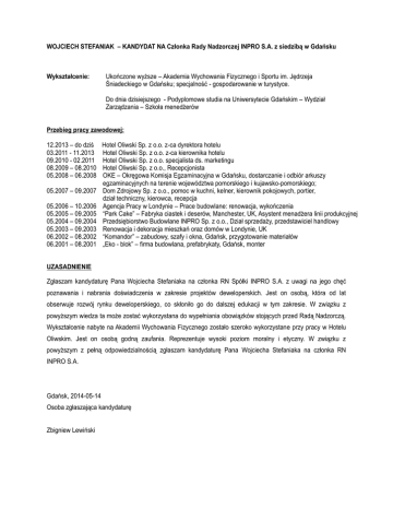 WOJCIECH STEFANIAK – KANDYDAT NA Członka Rady Nadzorczej INPRO S.A. z siedzibą w Gdańsku Wykształcenie: Ukończone wyższe – Akademia Wychowania Fizycznego i Sportu im. Jędrzeja Śniadeckiego w Gdańsku; specjalność - gospodarowanie w turystyce. Do dnia dzisiejszego - Podyplomowe studia na Uniwersytecie Gdańskim – Wydział Zarządzania – Szkoła menedżerów Przebieg pracy zawodowej: 12.2013 – do dziś 03.2011 - 11.2013 09.2010 - 02.2011 08.2009 – 08.2010 05.2008 – 06.2008 05.2007 – 09.2007 05.2006 – 10.2006 05.2005 – 09.2005 05.2004 – 09.2004 05.2003 – 09.2003 06.2002 – 08.2002 06.2001 – 08.2001 Hotel Oliwski Sp. z o.o. z-ca dyrektora hotelu Hotel Oliwski Sp. z o.o. z-ca kierownika hotelu Hotel Oliwski Sp. z o.o. specjalista ds. marketingu Hotel Oliwski Sp. z o.o., Recepcjonista OKE – Okręgowa Komisja Egzaminacyjna w Gdańsku, dostarczanie i odbiór arkuszy egzaminacyjnych na terenie województwa pomorskiego i kujawsko-pomorskiego; Dom Zdrojowy Sp. z o.o., pomoc w kuchni, kelner, kierownik pokojowych, portier, dział techniczny, kierowca, recepcja Agencja Pracy w Londynie – Prace budowlane: renowacja, wykończenia “Park Cake” – Fabryka ciastek i deserów, Manchester, UK, Asystent menadżera linii produkcyjnej Przedsiębiorstwo Budowlane INPRO Sp. z o.o., Dział sprzedaży, przedstawiciel handlowy Renowacja i dekoracja mieszkań oraz domów w Londynie, UK “Komandor” – zabudowy, szafy i okna, Gdańsk, przygotowanie materiałów „Eko - blok” – firma budowlana, prefabrykaty, Gdańsk, monter UZASADNIENIE Zgłaszam kandydaturę Pana Wojciecha Stefaniaka na członka RN Spółki INPRO S.A. z uwagi na jego chęć poznawania i nabrania doświadczenia w zakresie projektów deweloperskich. Jest on osobą, która od lat obserwuje rozwój rynku deweloperskiego, co skłoniło go do dalszej edukacji w tym zakresie. W związku z powyższym wiedza ta może zostać wykorzystana do wypełniania obowiązków stojących przed Radą Nadzorczą. Wykształcenie nabyte na Akademii Wychowania Fizycznego zostało szeroko wykorzystane przy pracy w Hotelu Oliwskim. Jest on osobą godną zaufania. Reprezentuje wysoki poziom moralny i etyczny. W związku z powyższym z pełną odpowiedzialnością zgłaszam kandydaturę Pana Wojciecha Stefaniaka na członka RN INPRO S.A. Gdańsk, 2014-05-14 Osoba zgłaszająca kandydaturę Zbigniew Lewiński