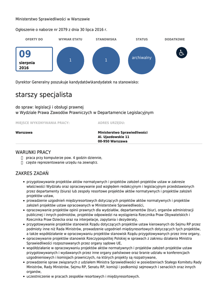 Ministerstwo Sprawiedliwości w Warszawie Ogłoszenie o naborze nr 2079 z dnia 30 lipca 2016 r. OFERTY DO 09 sierpnia 2016 WYMIAR ETATU STANOWISKA 1 1 STATUS DODATKOWE archiwalny Dyrektor Generalny poszukuje kandydatów\kandydatek na stanowisko: starszy specjalista do spraw: legislacji i obsługi prawnej w Wydziale Prawa Zawodów Prawniczych w Departamencie Legislacyjnym MIEJSCE WYKONYWANIA PRACY: ADRES URZĘDU: Warszawa Ministerstwo Sprawiedliwości Al. Ujazdowskie 11 00-950 Warszawa WARUNKI PRACY praca przy komputerze pow. 4 godzin dziennie, częste reprezentowanie urzędu na zewnątrz. ZAKRES ZADAŃ przygotowywanie projektów aktów normatywnych i projektów założeń projektów ustaw w zakresie właściwości Wydziału oraz opracowywanie pod względem redakcyjnym i legislacyjnym przedstawionych przez departamenty (biura) lub zespoły resortowe projektów aktów normatywnych i projektów założeń projektów ustaw, prowadzenie uzgodnień międzyresortowych dotyczących projektów aktów normatywnych i projektów założeń projektów ustaw opracowanych w Ministerstwie Sprawiedliwości, opracowywanie projektów opinii prawnych dla wydziałów, departamentów (biur), organów administracji publicznej i innych podmiotów, projektów odpowiedzi na wystąpienia Rzecznika Praw Obywatelskich i Rzecznika Praw Dziecka oraz na interpelacje, zapytania i dezyderaty, przygotowywanie projektów stanowisk Rządu dotyczących projektów ustaw kierowanych do Sejmu RP przez podmioty inne niż Rada Ministrów, prowadzenie uzgodnień międzyresortowych dotyczących tych projektów, a także współdziałanie w opracowywaniu projektów stanowisk Rządu przygotowywanych przez inne organy, opracowywanie projektów stanowisk Rzeczypospolitej Polskiej w sprawach z zakresu działania Ministra Sprawiedliwości rozpoznawanych przez organy sądowe UE, współdziałanie w opracowywaniu projektów aktów normatywnych i projektów założeń projektów ustaw przygotowywanych i wydawanych przez inne organy państwowe oraz branie udziału w konferencjach uzgodnieniowych i komisjach prawniczych, na których projekty są rozpatrywane, prowadzenie spraw związanych z udziałem Ministra Sprawiedliwości w posiedzeniach Stałego Komitetu Rady Ministrów, Rady Ministrów, Sejmu RP, Senatu RP, komisji i podkomisji sejmowych i senackich oraz innych organów, uczestniczenie w pracach zespołów resortowych i międzyresortowych. WYMAGANIA NIEZBĘDNE Wykształcenie: wyższe prawnicze doświadczenie zawodowe: 1 rok w urzędach organów administracji publicznej, na stanowisku związanym z opracowywaniem i uzgadnianiem projektów aktów prawnych znajomość języka angielskiego na poziomie B1, doskonalenie zawodowe, identyfikacja z misją urzędu, komunikacja, myślenie analityczne, otwartość na zmiany, podejmowanie decyzji i odpowiedzialność, pozytywne podejście do klienta, zorientowanie na osiąganie celów, rzetelność i terminowość, znajomość przepisów Konstytucji RP, ustawy o Radzie Ministrów, Regulaminu pracy Rady Ministrów, Regulaminów Sejmu RP i Senatu RP, znajomość zasad techniki prawodawczej, umiejętność formułowania pism urzędowych oraz opinii prawnych, Posiadanie obywatelstwa polskiego Korzystanie z pełni praw publicznych Nieskazanie prawomocnym wyrokiem za umyślne przestępstwo lub umyślne przestępstwo skarbowe DOKUMENTY I OŚWIADCZENIA NIEZBĘDNE Życiorys/CV i list motywacyjny Kopie dokumentów potwierdzających spełnienie wymagania niezbędnego w zakresie wykształcenia Kopie dokumentów potwierdzających spełnienie wymagania niezbędnego w zakresie doświadczenia zawodowego / stażu pracy Kopia dokumentu określonego w załączniku nr 2 do Rozporządzenia Prezesa Rady Ministrów, z dnia 16 grudnia 2009 r. w sprawie sposobu przeprowadzania postępowania kwalifikacyjnego w służbie cywilnej (Dz. U. Nr 218, poz. 1695), potwierdzająca znajomość języka angielskiego na poziomie B1. W przypadku składania dyplomu ukończenia Krajowej Szkoły Administracji Publicznej należy złożyć dodatkowo zaświadczenie potwierdzające znajomość języka angielskiego wydane przez KSAP, jeśli z treści dyplomu ukończenia KSAP nie wynika, że absolwent Szkoły posiada znajomość tego języka. Kandydatki/kandydaci, którzy nie złożą dokumentów potwierdzających znajomość języka angielskiego na wymaganym poziomie zostaną poddani procedurze sprawdzającej. Oświadczenie o posiadaniu obywatelstwa polskiego albo kopia dokumentu potwierdzającego posiadanie polskiego obywatelstwa Oświadczenie o wyrażeniu zgody na przetwarzanie danych osobowych do celów naboru Oświadczenie o korzystaniu z pełni praw publicznych Oświadczenie o nieskazaniu prawomocnym wyrokiem za umyślne przestępstwo lub umyślne przestępstwo skarbowe DOKUMENTY I OŚWIADCZENIA DODATKOWE kopia dokumentu potwierdzającego niepełnosprawność - w przypadku kandydatek/kandydatów, zamierzających skorzystać z pierwszeństwa w zatrudnieniu w przypadku, gdy znajdą się w gronie najlepszych kandydatek/kandydatów TERMINY I MIEJSCE SKŁADANIA DOKUMENTÓW Dokumenty należy złożyć do: 09 sierpnia 2016 r. Decyduje data: stempla pocztowego / osobistego dostarczenia oferty do urzędu Miejsce składania dokumentów: Ministerstwo Sprawiedliwości Biuro Dyrektora Generalnego Wydział Zarządzania Zasobami Ludzkimi Al. Ujazdowskie 11 00-950 Warszawa Z podaniem na kopercie numeru ogłoszenia INNE INFORMACJE: W miesiącu poprzedzającym datę upublicznienia ogłoszenia wskaźnik zatrudnienia osób niepełnosprawnych w urzędzie, w rozumieniu przepisów o rehabilitacji zawodowej i społecznej oraz zatrudnianiu osób niepełnosprawnych, nie wynosi co najmniej 6%. W miesiącu poprzedzającym datę upublicznienia ogłoszenia wskaźnik zatrudnienia osób niepełnosprawnych w urzędzie, w rozumieniu przepisów o rehabilitacji zawodowej i społecznej oraz zatrudnianiu osób niepełnosprawnych, nie wynosi co najmniej 6%. Nasz urząd jest pracod
