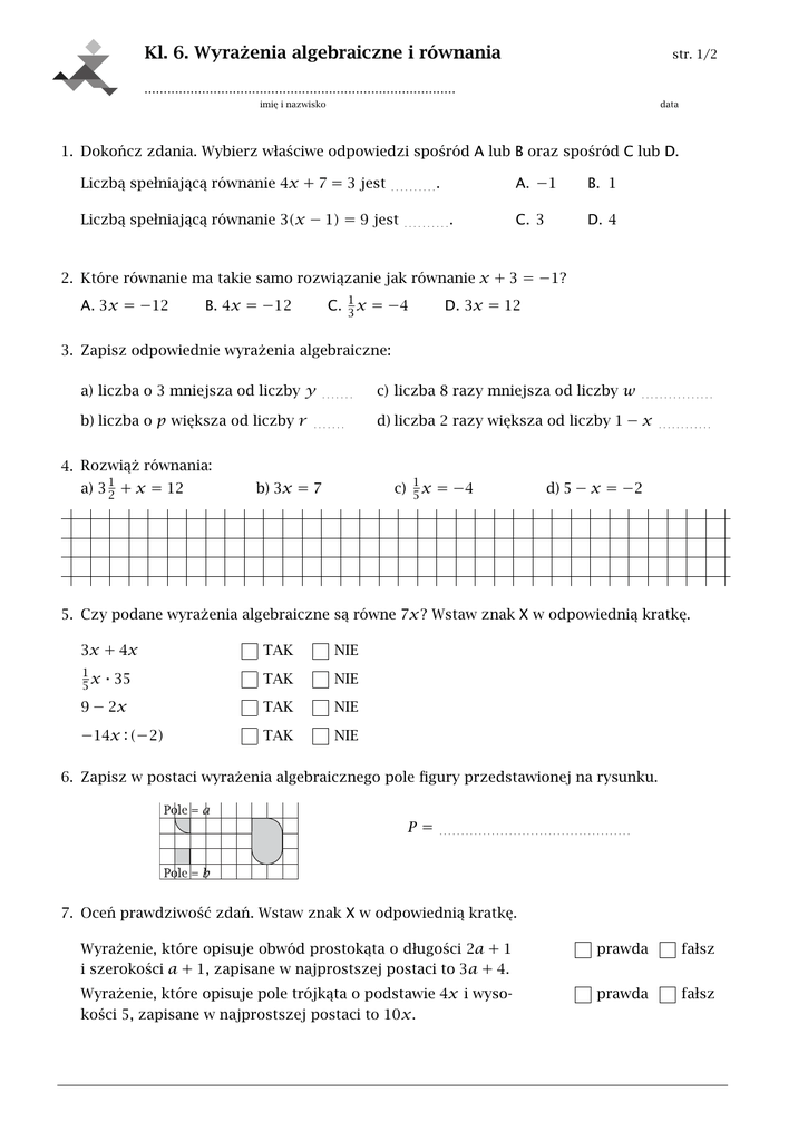 Kl. 6. Wyrażenia algebraiczne i równania str. 1/2 ................................................................................. imię i nazwisko data 1. Dokończ zdania. Wybierz właściwe odpowiedzi spośród A lub B oraz spośród C lub D. Liczbą spełniającą równanie 4𝑥 + 7 = 3 jest . . . . . . . . . . Liczbą spełniającą równanie 3(𝑥 − 1) = 9 jest . . . . . . . . . . . . A. −1 B. 1 C. 3 D. 4 2. Które równanie ma takie samo rozwiązanie jak równanie 𝑥 + 3 = −1? A. 3𝑥 = −12 B. 4𝑥 = −12 C. 1 𝑥 3 = −4 D. 3𝑥 = 12 3. Zapisz odpowiednie wyrażenia algebraiczne: a) liczba o 3 mniejsza od liczby 𝑦 b) liczba o 𝑝 większa od liczby 𝑟 . . . . . . . . . . . . . . c) liczba 8 razy mniejsza od liczby 𝑤 . . . . . . . . . . . . . . . . d) liczba 2 razy większa od liczby 1 − 𝑥 . . . . . . . . . . . . 4. Rozwiąż równania: a) 3 12 + 𝑥 = 12 b) 3𝑥 = 7 c) 1 𝑥 5 = −4 d) 5 − 𝑥 = −2 5. Czy podane wyrażenia algebraiczne są równe 7𝑥? Wstaw znak X w odpowiednią kratkę. 3𝑥 + 4𝑥 TAK NIE 1 𝑥 ⋅ 35 5 TAK NIE 9 − 2𝑥 TAK NIE −14𝑥 : (−2) TAK NIE 6. Zapisz w postaci wyrażenia algebraicznego pole figury przedstawionej na rysunku. 𝑃= . . . . . . . . . . . . . . . . . . . . . . . . . . . . . . . . . . . . . . . . . . . . 7. Oceń prawdziwość zdań. Wstaw znak X w odpowiednią kratkę. Wyrażenie, które opisuje obwód prostokąta o długości 2𝑎 + 1 i szerokości 𝑎 + 1, zapisane w najprostszej postaci to 3𝑎 + 4. prawda fałsz Wyrażenie, które opisuje pole trójkąta o podstawie 4𝑥 i wysokości 5, zapisane w najprostszej postaci to 10𝑥. prawda fałsz str. 2/2 8. Oznacz literą 𝑎 niewiadomą i ułóż równania odpowiadające treści zadań. a) Mały słoik mieści 0,4 kg dżemu, a duży – 0,5 kg. Jola z mamą przygotowały 7,9 kg dżemu i zapełniły nim 11 dużych słoików oraz kilka małych. Ile małych słoików zapełniły? b) W kinie Ekran bilet ulgowy kosztuje 15 zł, a normalny – 19 zł. W ostatni piątek sprzedano aż 303 bilety normalne, a ogółem do kasy wpłynęło tego dnia 9462 zł. Ile biletów ulgowych sprzedano? 9. Do klasy VI a uczęszcza 26 uczniów. Chłopców jest o 2 więcej niż dziewcząt. Ile dziewcząt jest w tej klasie? Zapisz odpowiednie równanie i je rozwiąż. 10. Suma trzech kolejnych liczb nieparzystych wynosi 87. Znajdź te liczby, rozwiązując odpowiednie równanie. *11. Na rysunku obok przedstawiono kształt i sposób układania klocków oraz pewne wymiary w centymetrach. Zapisz za pomocą wyrażenia algebraicznego wysokość wieży zbudowanej z 𝑛 takich klocków. Kl. 6. Wyrażenia algebraiczne i równania str. 1/2 ................................................................................. imię i nazwisko data 1. Dokończ zdania. Wybierz właściwe odpowiedzi spośród A lub B oraz spośród C lub D. Liczbą spełniającą równanie 2𝑥 + 7 = 5 jest . . . . . . . . . . Liczbą spełniającą równanie 5(𝑥 − 1) = 10 jest . . . . . . . . . . . . A. −2 B. −1 C. 3 D. 2 2. Które równanie ma takie samo rozwiązanie jak równanie 𝑥 + 2 = −4? A. 3𝑥 = −3 B. 1 𝑥 2 = −6 C. 2𝑥 = −12 D. 2𝑥 = 12 3. Zapisz odpowiednie wyrażenia algebraiczne: a) liczba o 2 większa od liczby 𝑥 b) liczba o 𝑎 mniejsza od liczby 𝑡 . . . . . . . . . . . . . . c) liczba 6 razy mniejsza od liczby 𝑦 . . . . . . . . . . . . . . . . d) liczba 4 razy większa od liczby 𝑥 + 5 . . . . . . . . . . . . 4. Rozwiąż równania: a) 2 23 + 𝑥 = 12 b) 4𝑥 = 13 c) 1 𝑥 6 = −4 d) 5 − 𝑥 = −4 5. Czy podane wyrażenia algebraiczne są równe 3𝑥? Wstaw znak X w odpowiednią kratkę. 8𝑥 − 5 TAK NIE 1 𝑥 ⋅ (−12) 4 TAK NIE 2𝑥 + 𝑥 TAK NIE −3𝑥 : (−1) TAK NIE 6. Zapisz w postaci wyrażenia algebraicznego pole figury przedstawionej na rysunku. 𝑃= . . . . . . . . . . . . . . . . . . . . . . . . . . . . . . . . . . . . . . . . . . . . 7. Oceń prawdziwość zdań. Wstaw znak X w odpowiednią kratkę. Wyrażenie, które opisuje obwód prostokąta o długości 2𝑎 + 1 i szerokości 𝑎 − 1, zapisane w najprostszej postaci to 6𝑎. prawda fałsz Wyrażenie, które opisuje pole trójkąta o podstawie 3𝑥 i wysokości 8, zapisane w najprostszej postaci to 24𝑥. prawda fałsz str. 2/2 8. Oznacz literą 𝑥 niewiadomą i ułóż równania odpowiadające treści zadań. a) Mały słoik mieści 0,4 kg dżemu, a duży – 0,5 kg. Jola z mamą przygotowały 10,1 kg dżemu i zapełniły nim 19 małych słoików oraz kilka dużych. Ile dużych słoików zapełniły? b) W kinie Ekran bilet ulgowy kosztuje 14 zł, a normalny – 18 zł. W ostatni piątek sprzedano aż 302 bilety normalne, a ogółem do kasy wpłynęło tego dnia 9468 zł. Ile biletów ulgowych sprzedano? 9. Do klasy VI a uczęszcza 25 uczniów. Dziewcząt jest o 5 więcej niż chłopców. Ilu chłopców jest w tej klasie? Zapisz odpowiednie równanie i je rozwiąż. 10. Suma trzech kolejnych liczb nieparzystych wynosi 75. Znajdź te liczby, rozwiązując odpowiednie równanie. *11. Na rysunku obok przedstawiono kształt i sposób układania klocków oraz pewne wymiary w centymetrach. Zapisz za pomocą wyrażenia algebraicznego wysokość wieży zbudowanej z 𝑛 takich klocków.