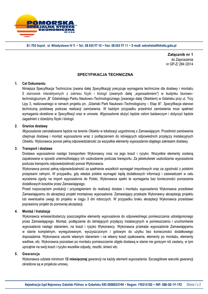 81-703 Sopot, ul. Władysława IV 9, • Tel.: 58 555 97 10 • Fax: 58 555 97 11 • E-mail: [email protected] Załącznik nr 1 do Zaproszenia nr GP-Z/ 284 /2014 SPECYFIKACJA TECHNICZNA 1. Cel Dokumentu Niniejsza Specyfikacja Techniczna (zwana dalej Specyfikacją) precyzuje wymagania techniczne dla dostawy i montażu 5 stanowisk interaktywnych z zakresu fizyki i biologii (zwanych dalej „wyposażeniem”) w budynku biurowo– technologicznym „B” Gdańskiego Parku Naukowo–Technologicznego (zwanego dalej Obiektem) w Gdańsku przy ul. Trzy Lipy 3, realizowanego w ramach projektu pn. „Gdański Park Naukowo–Technologiczny – Etap III”. Specyfikacja stanowi techniczną podstawę podczas realizacji zamówienia. W każdym przypadku przedmiot zamówienia musi spełniać wymagania określone w Specyfikacji oraz w umowie. Wyposażenie służyć będzie celom badawczym i dotyczyć będzie zagadnień z dziedziny fizyki i biologii. 2. Granice dostawy Wyposażenie zainstalowane będzie na terenie Obiektu w lokalizacji uzgodnionej z Zamawiającym. Przedmiot zamówienia obejmuje dostawę i montaż wyposażenia wraz z podłączeniem do istniejących odpowiednich przyłączy instalacyjnych Obiektu. Wykonawca ponosi pełną odpowiedzialność za wszystkie elementy wyposażenia objętego zakresem dostawy. 3. Transport i dostawa Dostawa wyposażenia nastąpi transportem Wykonawcy oraz na jego koszt i ryzyko. Wszystkie elementy zostaną zapakowane w sposób uniemożliwiający ich uszkodzenie podczas transportu. Za jakiekolwiek uszkodzenia wyposażenia podczas transportu odpowiedzialność ponosi Wykonawca. Wykonawca ponosi pełną odpowiedzialność za spełnienie wszelkich wymagań importowych oraz za zgodność z polskimi przepisami celnymi. W przypadku, gdy władze polskie wymagać będą dodatkowych informacji i zaświadczeń w celu wyrażenia zgody na import wyposażenia do Polski, Wykonawca spełni te wymagania bez konieczności ponoszenia dodatkowych kosztów przez Zamawiającego. Przed rozpoczęciem produkcji i przystąpieniem do realizacji dostaw i montażu wyposażenia Wykonawca przedstawi Zamawiającemu do akceptacji projekt montażowy wyposażenia. Zamawiający przekaże Wykonawcy akceptację projektu lub ewentualne uwagi do projektu w ciągu 3 dni roboczych. W przypadku braku akceptacji Wykonawca przedstawi poprawiony projekt do ponownej akceptacji. 4. Montaż / Instalacja Wykonawca wniesie/dostarczy poszczególne elementy wyposażenia do odpowiedniego pomieszczenia udostępnionego przez Zamawiającego. Montaż, podłączenie do istniejących przyłączy instalacyjnych w pomieszczeniu i uruchomienie wyposażenia nastąpi staraniem, na koszt i ryzyko Wykonawcy. Wykonawca przekaże wyposażenie Zamawiającemu w stanie kompletnym, wyregulowanym, wyczyszczonym i gotowym do użytku bez konieczności dodatkowego doposażenia. Wykonawca usunie własnym staraniem i na własny koszt opakowania, elementy po montażu, elementy wadliwe, etc. Wykonawca pozostawi po montażu pomieszczenie objęte dostawą w stanie nie gorszym niż zastany, w tym uprzątnie na swój koszt i ryzyko wszelkie odpady, resztki, śmieci etc. 5. Gwarancja Wykonawca udziela minimum 12 miesięcznej gwarancji na każdy element wyposażenia. Szczegółowe warunki gwarancji określone są w projekcie umowy. Rejestracja Sąd Rejonowy Gdańsk-Północ w Gdańsku KRS 0000033744 • Regon: 190315182 • NIP: 588-00-19-192 Strona 1 z 2 81-703 Sopot, ul. Władysława IV 9, • Tel.: 58 555 97 10 • Fax: 58 555 97 11 • E-mail: [email protected] 6. Specyfikacja szczegółowa dla wyposażenia Lp. Opis wymaganego wyposażenia/funkcji 1. Zakres zagadnień, których dotyczyć ma wyposażenie: a. Budowa ciała człowieka na przykładzie układu szkieletowego do samodzielnej budowy, z rozróżnieniem kości długich i płaskich - wykonane z trwałego tworzywa, łączone na zasadzie magnesów do tablicy magnetycznej; b. Technologia Rentgena – stanowisko do nauki rozpoznawania kości z układu szkieletowego człowieka na podstawie zdjęć rentgenowskich kości pokazanych na dużym ekranie dotykowym; c. Generator elektryczny - Stanowisko przedstawiające zasadę działania generatora elektrycznego na podstawie różnych przetworników poprzez zmianę siły kinetycznej mięśni użytkownika na energię elektryczną; d. Elektromagnes - Stanowisko przedstawiające zasadę działania elektromagnesu, pola magnetycznego oraz generatora; e. Roztocza skóry – prezentacja roztoczy skóry na dużym ekranie 21,5 cali ekran dotykowy z możliwością dopasowania ich do części ludzkiego ciała. 2. Pod względem użytkowym wyposażenie musi być dostosowane do potrzeb dzieci (w szczególności w wieku 4÷12 lat) oraz dorosłych 3. Zadaniem wyposażenie jest przekazywanie wiedzy przez łączenie doświadczeń badawczych z zabawą i manipulacją – każde stanowisko powinno posiadać część przeznaczoną do wprawienia mechanizmu w ruch lub umożliwiającą wykonanie jakiejś czynności rozpoczynającej działanie stanowiska przez oglądającego 4. Wyposażenie powinno być wykonane z materiałów bezpiecznych dla dzieci 5. Wyposażenie powinno być wykonane w sposób estetyczny - minimalna ilość zastosowanych kolorów : 6 6. Stanowiska powinny być mobilne 7. W zestawie: stoły lub/i niezbędne mocowania 8. Powierzchnia użytkowa pojedynczego stanowiska – nie mniejsza niż 50 x 100 cm Projekt współfinansowany ze środków Unii Europejskiej w ramach Europejskiego Funduszu Rozwoju Regionalnego Rejestracja Sąd Rejonowy Gdańsk-Północ w Gdańsku KRS 0000033744 • Regon: 190315182 • NIP: 588-00-19-192 Strona 2 z 2
