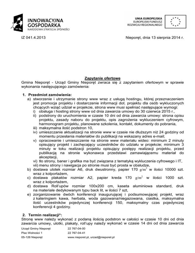 IZ 041.4.2013 Nieporęt, dnia 13 sierpnia 2014 r. Zapytanie ofertowe Gmina Nieporęt - Urząd Gminy Nieporęt zwraca się z zapytaniem ofertowym w sprawie wykonania następującego zamówienia: 1. Przedmiot zamówienia: a) stworzenie i utrzymanie strony www wraz z usługą hostingu, której przeznaczeniem jest promocja projektu i dostarczenie informacji dot. projektu dla osób wykluczonych chcących wziąć udział w projekcie, strona www musi spełniać następujące wymogi: i) obsługa i hosting strony www od dnia zawarcia umowy do 30 czerwca 2015 r., ii) podstrony do uruchomienia w czasie 10 dni od dnia zawarcia umowy: strona opisu projektu, zasady naboru do projektu, opis zagrożenia wykluczeniem cyfrowym, harmonogram projektu, planowane szkolenia, kontakt, dokumenty do pobrania, iii) maksymalna ilość podstron 10, iv) umieszczanie aktualizacji na stronie www w czasie nie dłuższym niż 24 godziny od momentu przesłania materiałów do publikacji na wskazany adres e-mail; v) opracowanie i umieszczenie na stronie www materiału wideo: minimum 2 minuty opisujący projekt i zachęcający uczestników do udziału w projekcie; minimum 3 minuty w toku realizacji projektu opisujący postępy realizacji projektu, przed publikacją na stronie wykonawca przedstawi zamawiającemu materiał do akceptacji, vi) tło strony, baner i grafika ma być związana z tematyką wykluczenia cyfrowego i IT, vii) menu strony i nawigacja po stronie musi być prosta w obsłudze, b) dostawa ulotek rozmiar A6, druk dwustronny, papier 170 g/m2 w ilości 10000 szt. wraz z kolportażem, c) dostawa plakatów rozmiar A2, papier kreda 170 g/m2 w ilości 1000 szt. wraz z kolportażem, d) dostawa Roll’upów rozmiar 100x200 cm, kaseta aluminiowa standard, druk na materiale dedykowanym typu back lit, w ilości 7 szt, e) zorganizowanie dwóch konferencji inaugurującej i podsumowującej projekt, wraz z kateringiem kawa, herbata, woda gazowana/niegazowana, ciastka, maksymalna ilość uczestników pojedynczej konferencji 150, maksymalny czas pojedynczej konferencji 4 godziny. 2. Termin realizacji*: Stronę www należy wykonać z podaną ilością podstron w całości w czasie 10 dni od dnia zawarcia umowy, ulotki, plakaty, roll’upy należy wykonać w czasie 14 dni od dnia zawarcia Urząd Gminy Nieporęt 22 767-04-00 Plac Wolności 1 22 767-04-41 05-126 Nieporęt www.nieporet.pl, [email protected] umowy, następnie w uzgodnieniu z zamawiającym wykonać kolportaż, termin obu konferencji zostanie ustalony z wykonawcą najpóźniej 14 dni przed planowanym terminem konferencji. Pierwszy materiał wideo należy opracować i umieścić na stronie w terminie 45 dni od dnia zawarcia umowy. Drugi materiał wideo - termin opracowania i umieszczenia materiału na stronie zamawiający poda z 7 dniowym wyprzedzeniem od tego momentu wykonawca musi w terminie 30 dni opracować i umieścić na stronie www gotowy materiał wideo. 3. Istotne warunki zamówienia: Kryterium oceny ofert 100% cena. Realizowane zadanie jest częścią projektu inwestycyjnego pn. „CYFROWE OKNO NA eŚWIAT – einclusion w gminie Nieporęt” współfinansowanego ze środków Unii Europejskiej w ramach Europejskiego Funduszu Rozwoju Regionalnego działanie 8.3 POIG. 4. Sposób przygotowania oferty: Wypełniony w języku polskim formularz „Oferta”, według wzoru określonego w załączniku do niniejszego zapytania ofertowego, należy złożyć w kancelarii Urzędu Gminy Nieporęt, (adres: Urząd Gminy Nieporęt, 05-126 Nieporęt, Pl. Wolności 1) lub przesłać na nr faksu 22 767-0441 lub drogą mailową na adres [email protected] do dnia 18 sierpnia 2014 r. do godz. 10.00. 5. Zastrzega się, że niniejsze zapytanie ofertowe nie stanowi zobowiązania do udzielenia zamówienia. 6. Przyjmuję do wiadomości, że umowa nie będzie zawarta w przypadku jeśli Władza Wdrażająca Projekty Unijne nie wyrazi zgody na wymieniony wydatek, zadanie. 7. Wyrażam zgodę na przetwarzanie moich danych osobowych zgodnie z zadaniami projektu. ……………………………………… (Podpis kierownika komórki merytorycznej) W załączeniu wzór oferty Wykonawcy * - jeżeli występuje potrzeba określenia terminu Sporządził: …………………………… Urząd Gminy Nieporęt 22 767-04-00 Plac Wolności 1 22 767-04-41 05-126 Nieporęt www.nieporet.pl, [email protected] ……………………………. (Nazwa/Pieczątka Wykonawcy) ……………………….., dnia ……………….….. Urząd Gminy Nieporęt Pl. Wolności 1 05-126 Nieporęt OFERTA WYKONAWCY w związku z zapytaniem ofertowym Urzędu Gminy Nieporęt z dnia ......................... Nazwa wykonawcy: .................................................................................................................................. Adres/siedziba wykonawcy: ....................................................................................................... Telefon, fax, e-mail wykonawcy: .........…................................................................................... Cena L.p. Przedmiot zamówienia 1 Wykonanie zgodnie z zapytaniem ofertowym strony www, materiałów informacyjnych/promocyjnych i zorganizowanie dwóch konferencji w ramach projektu pn. CYFROWE OKNO NA eŚWIAT – einclusion w gminie Nieporęt” współfinansowanego w ramach Programu Operacyjnego Innowacyjna Gospodarka, VIII Oś Priorytetowa: Społeczeństwo informacyjne – zwiększanie innowacyjności gospodarki, Działanie 8.3 Przeciwdziałanie wykluczeniu cyfrowemu – eInclusion. brutto netto vat UWAGI W cenę brutto zostały wliczone wszystkie koszty wykonania zamówienia. Zapoznałem się z warunkami określonymi w zapytaniu ofertowym i nie wnoszę do nich zastrzeżeń. Przyjmuję do wiadomości, że umowa nie będzie zawarta w przypadku jeśli Władza Wdrażająca Projekty Unijne nie wyrazi zgody na wymieniony wydatek/zadanie. Wyrażam zgodę na przetwarzanie moich danych osobowych zgodnie z zadaniami proj