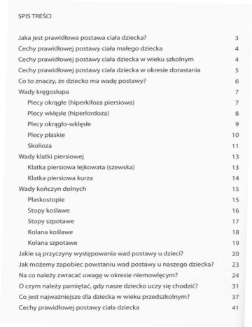 SPIS TREŚCI Jaka jest prawidłowa postawa ciała dziecka? 3 Cechy prawidłowej postawy ciała małego dziecka 4 Cechy prawidłowej postawy ciała dziecka w wieku szkolnym 4 Cechy prawidłowej postawy ciała dziecka w okresie dorastania 5 Co to znaczy, że dziecko ma wadę postawy? 6 Wady kręgosłupa 7 Plecy okrągłe (hiperkifoza piersiowa) 7 Plecy wklęsłe (hiperlordoza) 8 Plecy okrągło-wklęsłe 9 Plecy płaskie 10 Skolioza 11 Wady klatki piersiowej 13 Klatka piersiowa lejkowata (szewska) 13 Klatka piersiowa kurza 14 Wady kończyn dolnych 15 Płaskostopie 15 Stopy koślawe 16 Stopy szpotawe 17 Kolana koślawe 18 Kolana szpotawe 19 Jakie są przyczyny występowania wad postawy u dzieci? 20 Jak możemy zapobiec powstaniu wad postawy u naszego dziecka? 23 Na co należy zwracać uwagę w okresie niemowlęcym? 24 O czym należy pamiętać, gdy nasze dziecko uczy się chodzić? 31 Co jest najważniejsze dla dziecka w wieku przedszkolnym? 37 Cechy prawidłowej postawy ciała dziecka 41