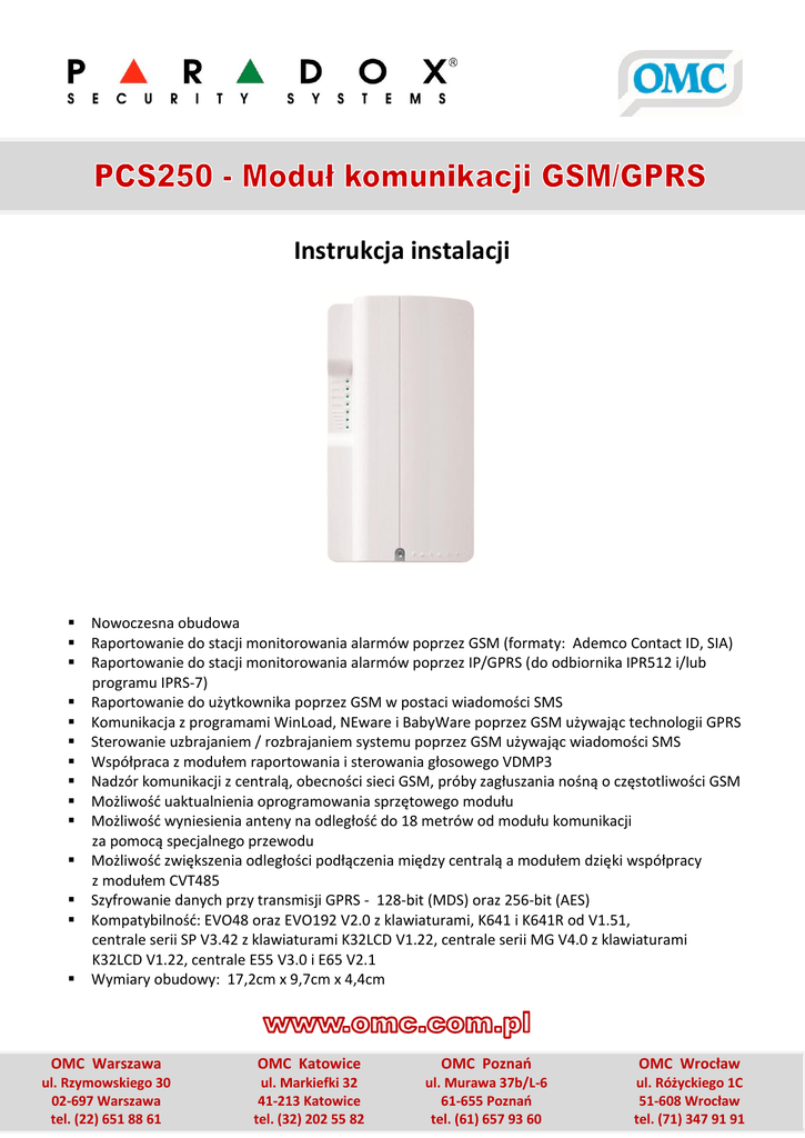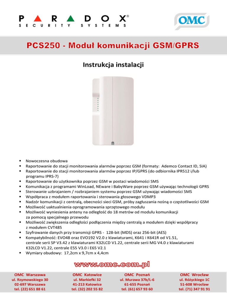 Instrukcja instalacji Nowoczesna obudowa Raportowanie do stacji monitorowania alarmów poprzez GSM (formaty: Ademco Contact ID, SIA) Raportowanie do stacji monitorowania alarmów poprzez IP/GPRS (do odbiornika IPR512 i/lub programu IPRS-7) Raportowanie do użytkownika poprzez GSM w postaci wiadomości SMS Komunikacja z programami WinLoad, NEware i BabyWare poprzez GSM używając technologii GPRS Sterowanie uzbrajaniem / rozbrajaniem systemu poprzez GSM używając wiadomości SMS Współpraca z modułem raportowania i sterowania głosowego VDMP3 Nadzór komunikacji z centralą, obecności sieci GSM, próby zagłuszania nośną o częstotliwości GSM Możliwość uaktualnienia oprogramowania sprzętowego modułu Możliwość wyniesienia anteny na odległość do 18 metrów od modułu komunikacji za pomocą specjalnego przewodu Możliwość zwiększenia odległości podłączenia między centralą a modułem dzięki współpracy z modułem CVT485 Szyfrowanie danych przy transmisji GPRS - 128-bit (MDS) oraz 256-bit (AES) Kompatybilność: EVO48 oraz EVO192 V2.0 z klawiaturami, K641 i K641R od V1.51, centrale serii SP V3.42 z klawiaturami K32LCD V1.22, centrale serii MG V4.0 z klawiaturami K32LCD V1.22, centrale E55 V3.0 i E65 V2.1 Wymiary obudowy: 17,2cm x 9,7cm x 4,4cm OMC Warszawa ul. Rzymowskiego 30 02-697 Warszawa tel. (22) 651 88 61 www.omc.com.pl OMC Katowice ul. Markiefki 32 41-213 Katowice tel. (32) 202 55 82 1 OMC Poznań OMC Wrocław ul. Murawa 37b/L-6 61-655 Poznań tel. (61) 657 93 60 ul. Różyckiego 1C 51-608 Wrocław tel. (71) 347 91 91 Opis Moduł PCS200 firmy Paradox jest nadajnikiem GSM lub GPRS. Może raportować zdarzenia do stacji monitoringu za pośrednictwem sieci komórkowej. Moduł PCS200 może wysyłać informacje o zdarzeniach w postaci wiadomości SMS na prywatne numery telefonów użytkowników. Umożliwia także uzbrajanie/rozbrajanie systemu za pomocą wiadomości SMS oraz programowanie systemu za pomocą programu WinLoad (wersja GPRS). Moduł PCS200 może być instalowany w odległości do 2m od centrali alarmowej. Antena może być zainstalowana w odległości maksymalnie 18m od modułu komunikacji za pomocą specjalnych przewodów przedłużających. Właściwości Raportowanie zdarzeń poprzez GPRS do odbiornika IPR512 GPRS/ IP lub poprzez GSM do stacji monitoringu Połączenie z programami WinLoad i NEware poprzez GPRS Aktualizacja oprogramowania sprzętowego poprzez GPRS lub interfejs 307USB Raportowanie do użytkownika poprzez GSM w postaci wiadomości SMS (maks. 16 numerów telefonów prywatnych) Nadzór komunikacji z centralą. Gdy wystąpi utrata komunikacji, w centrali alarmowej zostanie wygenerowany specjalny raport który będzie wysłany do stacji monitoringu zwykłą linią telefoniczną jeśli jest taka możliwość. Możliwość uzbrajania i rozbrajania systemu wysyłając wiadomość SMS do modułu PCS200 tryb GSM Możliwość odbierania wcześniej nagranych informacji głosowych o alarmach na 8 numerach telefonów prywatnych przy użyciu modułu raportowania i sterowania głosowego VDMP3 Łatwa instalacja za pomocą 4-żyłowego przewodu Możliwość instalacji anteny w odległości do 18m od modułu przy zastosowaniu specjalnych przewodów przedłużających Kodowanie: 128-bit (MD5) i 256-bit (AES) - tryb GPRS Zestaw zawiera: 1) Przewód komunikacyjny z centralą alarmową 2) 4-śruby mocujące przedni panel 3) Antena 4) Złączka zasilania Elementy wymagane/dodatkowe: Karta SIM (wymagana) Moduł raportowania i sterowania głosowego VDMP3 (dodatek) Przedłużenie anteny (dodatek) Zewnętrzne źródło zasilania 12 Vdc (dodatek) Kompatybilność: Centrale EVO48 i EVO192 V2.02 Manipulatory K641 i K641R V1.51 lub wyżej Spectra SP V3.42 z manipulatorem K32LCD V1.22 Centrale E55 V3.0 (etykiety programowalne z WinLoad) Centrale E65 V2.1 (etykiety programowalne z WinLoad) Centrale Magellan MG V4.0 lub wyżej z manipulatorami K32LCD V1.22 lub wyżej Więcej informacji na stronie internetowej www.omc.com.pl www.omc.com.pl 2 Instalacja Opis płyty wewnętrznej modułu PCS250: 1) GPRS14 z dwoma gniazdami kart SIM 2) Gniazdo audio jack 3) Złącze do aktualizowania oprogramowania sprzętowego (InField upgrade) 4) Przycisk funkcyjny (do wykorzystania w przyszłości) 5) Gniazdo zasilania i RS485 6) Gniazdo (dp wykorzystania w przyszłości) 7) Złącze „SERIAL” do podłączenia z centralą alarmową 8) Złącze do podłączenia modułu VDMP3 – raportowania i sterowania głosowego 9) Diody LED informujące o stanie pracy modułu (patrz „Opis diod LED statusu modułu”) Opis diod LED statusu modułu Dioda LED SIM Card 1 Opis Zielona: Karta SIM zainstalowana w gnieździe Zielona migająca szybko: transmisja danych z karty SIM Zielona migająca wolno: szukanie sieci GSM Czerwona: błąd karty SIM Wyłączona: brak karty SIM w gnieździe SIM Card 2 GPRS Do wykorzystania w przyszłości GSM Signal Strength Zielona: tryb pracy GPRS Zielona migająca: transmisja danych GPRS Ważne: Gdy dioda LED GPRS jest włączona to dioda LED GSM jest wyłączona Zielona: tryb pracy GSM Zielona migająca: transmisja danych Ważne: Gdy dioda LED GSM jest włączona to dioda LED GPRS jest wyłączona Moc sygnału GSM. 1 dioda LED włączona: słaby sygnał 3 diody LED włączone: dobry sygnał www.omc.com.pl 3 Informacja w przypadku utraty komunikacji pomiędzy centralą a modułem W przypadku gdy wystąpi utrata komunikacji pomiędzy centralą alarmową a modułem PCS250 diody LED będą zachowywać się w następujący sposób: 1) Dioda GPRS lub GSM będzie wyłączona, natomiast dioda SIM card i Signal strength będą włączone jeszcze przez okres 3 sekund 2) Diody Signal strength będą wyłączone, diody GSM i GPRS włączą się. Wszystkie diody będą się włączać i wyłączać co 20 sekund. Ten proces powtórzy się dwukrotnie. 3) Opisane powyżej akcje będą się powtarzać do chwili uzyskania ponownej komunikacji. Uwaga: mogą wystąpić drobne rozbież