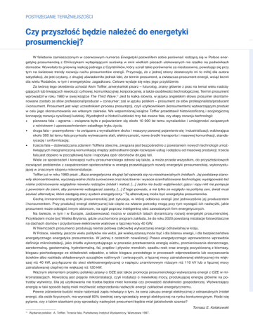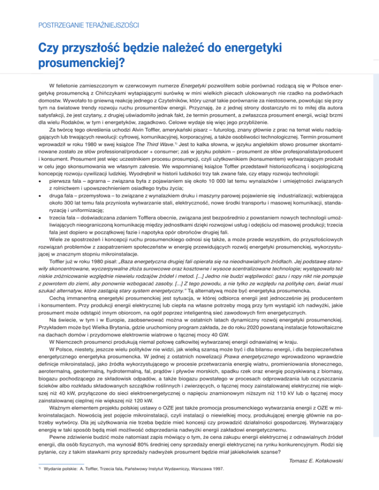 Postrzeganie teraźniejszości Czy przyszłość będzie należeć do energetyki prosumenckiej? W felietonie zamieszczonym w czerwcowym numerze Energetyki pozwoliłem sobie porównać rodzącą się w Polsce energetykę prosumencką z Chińczykami wytapiającymi surówkę w mini wielkich piecach ulokowanych nie rzadko na podwórkach domostw. Wywołało to gniewną reakcję jednego z Czytelników, który uznał takie porównanie za niestosowne, powołując się przy tym na światowe trendy rozwoju ruchu prosumentów energii. Przyznaję, że z jednej strony dostarczyło mi to miłej dla autora satysfakcji, że jest czytany, z drugiej uświadomiło jednak fakt, że termin prosument, a zwłaszcza prosument energii, wciąż brzmi dla wielu Rodaków, w tym i energetyków, zagadkowo. Celowe wydaje się więc jego przybliżenie. Za twórcę tego określenia uchodzi Alvin Toffler, amerykański pisarz – futurolog, znany głównie z prac na temat wielu nadciągających lub trwających rewolucji: cyfrowej, komunikacyjnej, korporacyjnej, a także osobliwości technologicznej. Termin prosument wprowadził w roku 1980 w swej książce The Third Wave.1) Jest to kalka słowna, w języku angielskim słowo prosumer skontaminowane zostało ze słów professional/producer + consumer; zaś w języku polskim – prosument ze słów profesjonalista/producent i konsument. Prosument jest więc uczestnikiem procesu prosumpcji, czyli użytkownikiem (konsumentem) wytwarzającym produkt w celu jego skonsumowania we własnym zakresie. We wspomnianej książce Toffler przedstawił historiozoficzną i socjologiczną koncepcję rozwoju cywilizacji ludzkiej. Wyodrębnił w historii ludzkości trzy tak zwane fale, czy etapy rozwoju technologii: • pierwsza fala – agrarna – związana była z pojawianiem się około 10 000 lat temu wynalazków i umiejętności związanych z rolnictwem i upowszechnieniem osiadłego trybu życia; • druga fala – przemysłowa – to związane z wynalazkiem druku i maszyny parowej pojawienie się industrializacji; wzbierająca około 300 lat temu fala przyniosła wytwarzanie stali, elektryczność, nowe środki transportu i masowej komunikacji, standaryzację i uniformizację; • trzecia fala – doświadczana zdaniem Tofflera obecnie, związana jest bezpośrednio z powstaniem nowych technologii umożliwiających nieograniczoną komunikację między jednostkami dzięki rozwojowi usług i odejściu od masowej produkcji; trzecia fala jest dopiero w początkowej fazie i napotyka opór obrońców drugiej fali. Wiele ze spostrzeżeń i koncepcji ruchu prosumenckiego odnosi się także, a może przede wszystkim, do przyszłościowych rozwiązań problemów z zaopatrzeniem społeczeństw w energię przewidujących rozwój energetyki prosumenckiej, wykorzystującej w znacznym stopniu mikroinstalacje. Toffler już w roku 1980 pisał: „Baza energetyczna drugiej fali opierała się na nieodnawialnych źródłach. Jej podstawę stanowiły skoncentrowane, wyczerpywalne złoża surowcowe oraz kosztowne i wysoce scentralizowane technologie; występowało też niskie zróżnicowanie względnie niewielu rodzajów źródeł i metod. [...] Jedno nie budzi wątpliwości: gazu i ropy nikt nie pompuje z powrotem do ziemi, aby ponownie wzbogacać zasoby. [...] Z tego powodu, a nie tylko ze względu na politykę cen, świat musi szukać alternatyw, które zastąpią stary system energetyczny.” Tą alternatywą może być energetyka prosumencka. Cechą immanentną energetyki prosumenckiej jest sytuacja, w której odbiorca energii jest jednocześnie jej producentem i konsumentem. Przy produkcji energii elektrycznej lub ciepła na własne potrzeby mogą przy tym wystąpić ich nadwyżki, jakie prosument może odstąpić innym obiorcom, na ogół poprzez inteligentną sieć zawodowych firm energetycznych. Na świecie, w tym i w Europie, zaobserwować można w ostatnich latach dynamiczny rozwój energetyki prosumenckiej. Przykładem może być Wielka Brytania, gdzie uruchomiony program zakłada, że do roku 2020 powstaną instalacje fotowoltaiczne na dachach domów i przydomowe elektrownie wiatrowe o łącznej mocy 40 GW. W Niemczech prosumenci produkują niemal połowę całkowitej wytwarzanej energii odnawialnej w kraju. W Polsce, niestety, jeszcze wielu polityków nie widzi, jak wielką szansą może być i dla bilansu energii, i dla bezpieczeństwa energetycznego energetyka prosumencka. W jednej z ostatnich nowelizacji Prawa energetycznego wprowadzono wprawdzie definicje mikroinstalacji, jako źródła wykorzystującego w procesie przetwarzania energię wiatru, promieniowania słonecznego, aerotermalną, geotermalną, hydrotermalną, fal, prądów i pływów morskich, spadku rzek oraz energię pozyskiwaną z biomasy, biogazu pochodzącego ze składowisk odpadów, a także biogazu powstałego w procesach odprowadzania lub oczyszczania ścieków albo rozkładu składowanych szczątków roślinnych i zwierzęcych, o łącznej mocy zainstalowanej elektrycznej nie większej niż 40 kW, przyłączone do sieci elektroenergetycznej o napięciu znamionowym niższym niż 110 kV lub o łącznej mocy zainstalowanej cieplnej nie większej niż 120 kW. Ważnym elementem projektu polskiej ustawy o OZE jest także promocja prosumenckiego wytwarzania energii z OZE w mikroinstalacjach. Nowością jest pojęcie mikroinstalacji, czyli instalacji o niewielkiej mocy, produkującej energię głównie na potrzeby wytwórcy. Dla jej użytkowania nie trzeba będzie mieć koncesji czy prowadzić działalności gospodarczej. Wytwarzający energię w taki sposób będą mieli możliwość odsprzedania nadwyżki energii zakładowi energetycznemu. Pewne zdziwienie budzić może natomiast zapis mówiący o tym, że cena zakupu energii elektrycznej z odnawialnych źródeł energii, dla osób fizycznych, ma wynosić 80% średniej ceny sprzedaży energii elektrycznej na rynku konkurencyjnym. Rodzi się pytanie, czy z takim stawkami przy sp