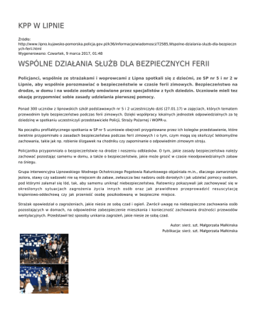 KPP W LIPNIE Źródło: http://www.lipno.kujawsko-pomorska.policja.gov.pl/k36/informacje/wiadomosci/72585,Wspolne-dzialania-sluzb-dla-bezpieczn ych-ferii.html Wygenerowano: Czwartek, 9 marca 2017, 01:48 WSPÓLNE DZIAŁANIA SŁUŻB DLA BEZPIECZNYCH FERII Policjanci, wspólnie ze strażakami i woprowcami z Lipna spotkali się z dziećmi, ze SP nr 5 i nr 2 w Lipnie, aby wspólnie porozmawiać o bezpieczeństwie w czasie ferii zimowych. Bezpieczeństwo na drodze, w domu i na wodzie zostały omówione przez specjalistów z tych dziedzin. Uczniowie mieli tez okazję przypomnieć sobie zasady udzielania pierwszej pomocy. Ponad 300 uczniów z lipnowskich szkół podstawowych nr 5 i 2 uczestniczyło dziś (27.01.17) w zajęciach, których tematem przewodnim było bezpieczeństwo podczas ferii zimowych. Dzięki współpracy lokalnych jednostek odpowiedzialnych za tę dziedzinę w spotkaniu uczestniczyli przedstawiciele Policji, Straży Pożarnej i WOPR-u. Na początku profilaktycznego spotkania w SP nr 5 uczniowie obejrzeli przygotowane przez ich kolegów przedstawienie, które świetnie przypominało o zasadach bezpieczeństwa podczas ferii zimowych i o tym, czym mogą się skończyć lekkomyślne zachowania, takie jak np. robienie ślizgawek na chodniku czy zapominanie o odpowiednim zimowym stroju. Policjantka przypomniała o bezpieczeństwie na drodze i noszeniu odblasków. O tym, jakie zasady bezpieczeństwa należy zachować pozostając samemu w domu, a także o bezpieczeństwie, jakie może grozić w czasie nieodpowiedzialnych zabaw na śniegu. Grupa interwencyjna Lipnowskiego Wodnego Ochotniczego Pogotowia Ratunkowego objaśniała m.in., dlaczego zamarznięte jeziora, stawy czy sadzawki nie są miejscem do zabaw, zwłaszcza bez nadzoru osób dorosłych i jak udzielać pomocy osobom, pod którymi załamał się lód, tak, aby samemu uniknąć niebezpieczeństwa. Ratownicy pokazywali jak zachowywać się w określonych sytuacjach zagrożenia życia innych osób oraz jak prawidłowo przeprowadzić resuscytację krążeniowo-oddechową czy jak przenieść osobę poszkodowaną w bezpieczne miejsce. Strażak opowiedział o zagrożeniach, jakie niesie ze sobą czad i ogień. Zwrócił uwagę na niebezpieczne zachowania osób pozostających w domach, na odpowiednie zabezpieczenie mieszkania i konieczność zachowania drożności przewodów wentylacyjnych. Przedstawił też sposoby unikania zagrożeń, jakie niesie ze sobą czad. Autor: sierż. szt. Małgorzata Małkinska Publikacja: sierż. szt. Małgorzata Małkinska Ocena: 0/5 (0) Tweetnij