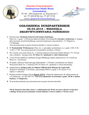 Klasztor Franciszkanów Sanktuarium Matki Bożej Loretańskiej PL 48 – 250 Głogówek, ul. Klasztorna 3 tel. 77/438 00 20; fax: 77 437 33 56 www: glogowek.franciszkanie.pl OGŁOSZENIA DUSZPASTERSKIE 05.04.2015 – NIEDZIELA ZMARTWYCHWSTANIA PAŃSKIEGO 1. Przeżywamy Niedzielę Zmartwychwstania Pańskiego. Mszy św. o godz. 12.00 przewodniczył będzie Prowincjał O. Jarosław Zachariasz w drugim dniu nowenny przed beatyfikacją naszych misjonarzy męczenników: O. Zbigniewa i O Michała. Taca przeznaczona na prace konserwatorskie w naszej świątyni. 2. W Poniedziałek Wielkanocny Msze św. w porządku niedzielnym, tj. o godz. 8.00, 9.30, 12.00 i 17.00. Taca przeznaczona na katolickie uczelnie w Polsce. 3. We wtorek wieczorna Msza św. w intencji papieża Franciszka Radia Maryja i TV Trwam oraz członków naszego koła. Po Mszy św. spotkanie w salce klasztornej. 4. Z racji Świąt najbliższe spotkanie Kręgu Biblijnego będzie jednorazowo we wtorek po Mszy św. wieczornej. 5. W piątek Adoracji Najświętszego Sakramentu w Domku Loretańskim nie będzie. Wieczorna Msza św. w intencji FZŚ. Po Mszy św. spotkanie w salce klasztornej. 6. Organizujemy pielgrzymkę na Odpust Miłosierdzia Bożego do Łagiewnik. Wyjazd w niedzielę 12 kwietnia z przystanku PKS-u o godz. 6.30. Koszt 35 zł. Zapisy w zakrystii. 7. Rozpoczynamy kolejną edycję Kursu ALFA. Chętnych zapraszamy do zapisywania się u O. Bartosza, tel. 603 492 913. Pierwsze spotkanie 16 kwietnia o godz. 18.30 w Domu Kultury w Głogówku. 8. W przyszłą niedzielę taca przeznaczona na prace konserwatorskie. Niech Zmartwychwstały Jezus w codzienności da Wam na nowo odczuć swoją moc i dodaje sił do przezwyciężania swoich słabości i wlewa radość w Wasze serca Pomożesz nam w: akcjach wakacyjnych dla dzieci i młodzieży ratowaniu zabytków w klasztorze i sanktuarium