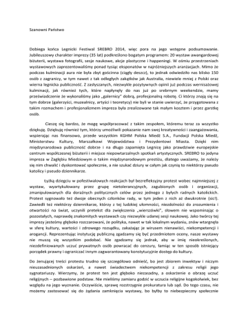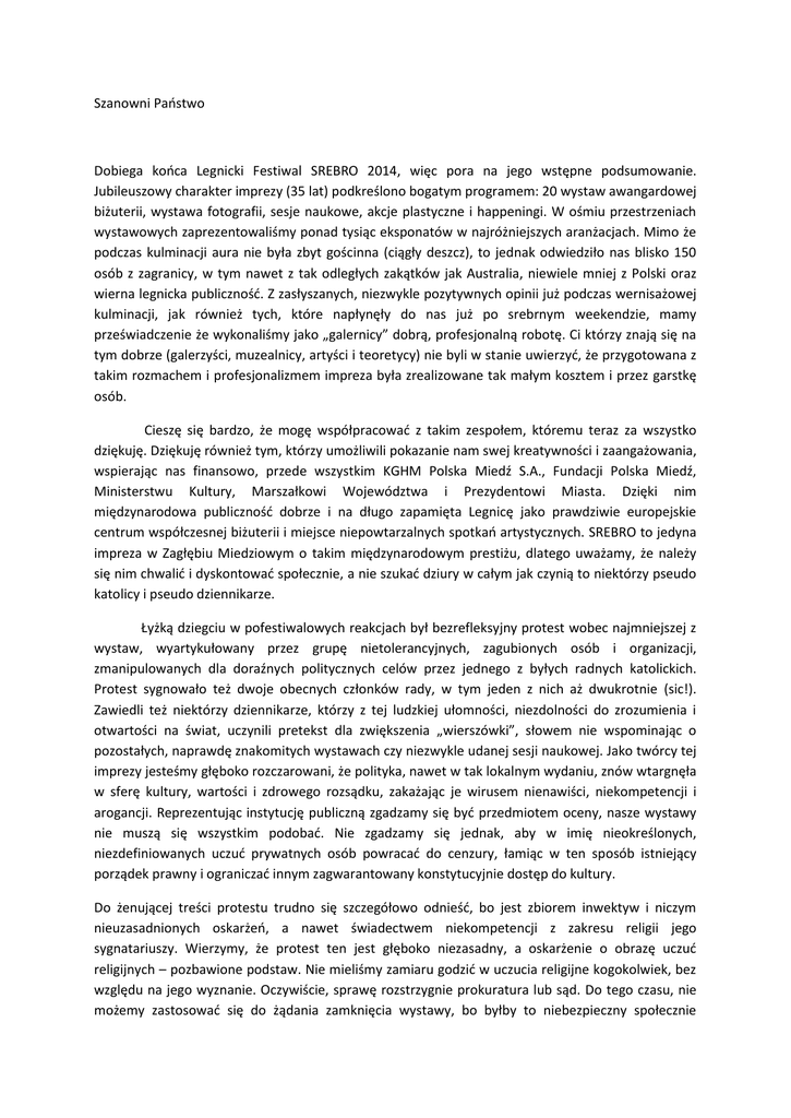 Szanowni Państwo Dobiega końca Legnicki Festiwal SREBRO 2014, więc pora na jego wstępne podsumowanie. Jubileuszowy charakter imprezy (35 lat) podkreślono bogatym programem: 20 wystaw awangardowej biżuterii, wystawa fotografii, sesje naukowe, akcje plastyczne i happeningi. W ośmiu przestrzeniach wystawowych zaprezentowaliśmy ponad tysiąc eksponatów w najróżniejszych aranżacjach. Mimo że podczas kulminacji aura nie była zbyt gościnna (ciągły deszcz), to jednak odwiedziło nas blisko 150 osób z zagranicy, w tym nawet z tak odległych zakątków jak Australia, niewiele mniej z Polski oraz wierna legnicka publiczność. Z zasłyszanych, niezwykle pozytywnych opinii już podczas wernisażowej kulminacji, jak również tych, które napłynęły do nas już po srebrnym weekendzie, mamy przeświadczenie że wykonaliśmy jako „galernicy” dobrą, profesjonalną robotę. Ci którzy znają się na tym dobrze (galerzyści, muzealnicy, artyści i teoretycy) nie byli w stanie uwierzyć, że przygotowana z takim rozmachem i profesjonalizmem impreza była zrealizowane tak małym kosztem i przez garstkę osób. Cieszę się bardzo, że mogę współpracować z takim zespołem, któremu teraz za wszystko dziękuję. Dziękuję również tym, którzy umożliwili pokazanie nam swej kreatywności i zaangażowania, wspierając nas finansowo, przede wszystkim KGHM Polska Miedź S.A., Fundacji Polska Miedź, Ministerstwu Kultury, Marszałkowi Województwa i Prezydentowi Miasta. Dzięki nim międzynarodowa publiczność dobrze i na długo zapamięta Legnicę jako prawdziwie europejskie centrum współczesnej biżuterii i miejsce niepowtarzalnych spotkań artystycznych. SREBRO to jedyna impreza w Zagłębiu Miedziowym o takim międzynarodowym prestiżu, dlatego uważamy, że należy się nim chwalić i dyskontować społecznie, a nie szukać dziury w całym jak czynią to niektórzy pseudo katolicy i pseudo dziennikarze. Łyżką dziegciu w pofestiwalowych reakcjach był bezrefleksyjny protest wobec najmniejszej z wystaw, wyartykułowany przez grupę nietolerancyjnych, zagubionych osób i organizacji, zmanipulowanych dla doraźnych politycznych celów przez jednego z byłych radnych katolickich. Protest sygnowało też dwoje obecnych członków rady, w tym jeden z nich aż dwukrotnie (sic!). Zawiedli też niektórzy dziennikarze, którzy z tej ludzkiej ułomności, niezdolności do zrozumienia i otwartości na świat, uczynili pretekst dla zwiększenia „wierszówki”, słowem nie wspominając o pozostałych, naprawdę znakomitych wystawach czy niezwykle udanej sesji naukowej. Jako twórcy tej imprezy jesteśmy głęboko rozczarowani, że polityka, nawet w tak lokalnym wydaniu, znów wtargnęła w sferę kultury, wartości i zdrowego rozsądku, zakażając je wirusem nienawiści, niekompetencji i arogancji. Reprezentując instytucję publiczną zgadzamy się być przedmiotem oceny, nasze wystawy nie muszą się wszystkim podobać. Nie zgadzamy się jednak, aby w imię nieokreślonych, niezdefiniowanych uczuć prywatnych osób powracać do cenzury, łamiąc w ten sposób istniejący porządek prawny i ograniczać innym zagwarantowany konstytucyjnie dostęp do kultury. Do żenującej treści protestu trudno się szczegółowo odnieść, bo jest zbiorem inwektyw i niczym nieuzasadnionych oskarżeń, a nawet świadectwem niekompetencji z zakresu religii jego sygnatariuszy. Wierzymy, że protest ten jest głęboko niezasadny, a oskarżenie o obrazę uczuć religijnych – pozbawione podstaw. Nie mieliśmy zamiaru godzić w uczucia religijne kogokolwiek, bez względu na jego wyznanie. Oczywiście, sprawę rozstrzygnie prokuratura lub sąd. Do tego czasu, nie możemy zastosować się do żądania zamknięcia wystawy, bo byłby to niebezpieczny społecznie precedens, polegający na ograniczaniu indywidualnej wolności wypowiedzi i instytucjonalnej działalności artystycznej w imię partykularnych interesów grupy i na podstawie subiektywnych, niesprawdzalnych odczuć osób fizycznych. W ten sposób można sparaliżować każdą działalność publiczną, nie tylko artystyczną. Obarczanie winą prawnego organizatora Galerii, którym jest Prezydent Miasta, za treść i kształt wystawy jest całkowicie absurdalne, bo z jednej strony zakłada brak osobowości prawnej instytucji, z drugiej – kreuje nieprzewidziane prawem kompetencje Pana Prezydenta jako cenzora i kuratora sztuki. Nie godzimy się na podcinanie istoty działalności artystycznej każdej galerii sztuki współczesnej poprzez odmawianie im prawa do artystycznych prób i eksperymentów czy poprzez wymuszanie autocenzury. Sztuki nie należy się bać, należy ją kontemplować, bo jak powiada znany artysta „tylko sztuka cię nie oszuka”. Prosimy zatem o poszanowanie podstawowych zasad wolności artystycznej i tolerancji, a nade wszystko o zachowanie zwykłego zdrowego rozsądku. Dyrektor i Pracownicy Galerii Sztuki w Legnicy P.S. Załączamy komentarz do wystawy There will be blood… z nadzieją, że wniesie on trochę potrzebnego wszystkim spokoju i dystansu wobec sztucznie wykreowanego problemu.