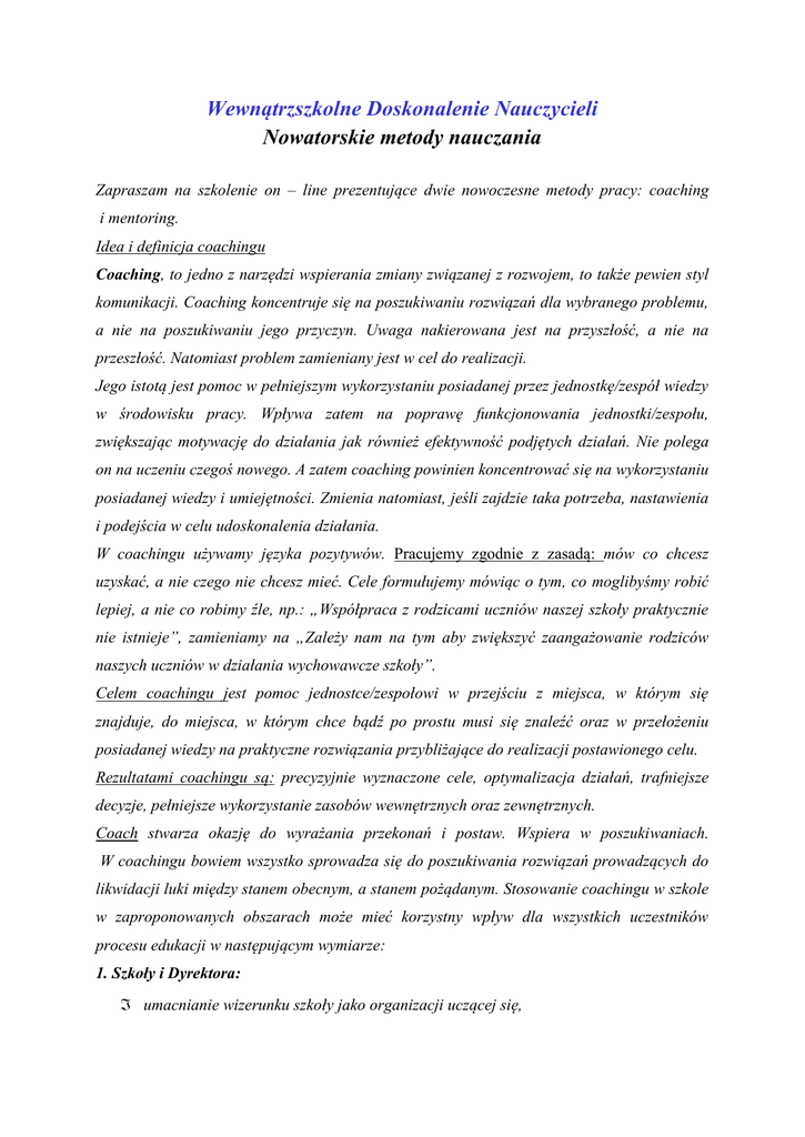 Wewnątrzszkolne Doskonalenie Nauczycieli Nowatorskie metody nauczania Zapraszam na szkolenie on – line prezentujące dwie nowoczesne metody pracy: coaching i mentoring. Idea i definicja coachingu Coaching, to jedno z narzędzi wspierania zmiany związanej z rozwojem, to także pewien styl komunikacji. Coaching koncentruje się na poszukiwaniu rozwiązań dla wybranego problemu, a nie na poszukiwaniu jego przyczyn. Uwaga nakierowana jest na przyszłość, a nie na przeszłość. Natomiast problem zamieniany jest w cel do realizacji. Jego istotą jest pomoc w pełniejszym wykorzystaniu posiadanej przez jednostkę/zespół wiedzy w środowisku pracy. Wpływa zatem na poprawę funkcjonowania jednostki/zespołu, zwiększając motywację do działania jak również efektywność podjętych działań. Nie polega on na uczeniu czegoś nowego. A zatem coaching powinien koncentrować się na wykorzystaniu posiadanej wiedzy i umiejętności. Zmienia natomiast, jeśli zajdzie taka potrzeba, nastawienia i podejścia w celu udoskonalenia działania. W coachingu używamy języka pozytywów. Pracujemy zgodnie z zasadą: mów co chcesz uzyskać, a nie czego nie chcesz mieć. Cele formułujemy mówiąc o tym, co moglibyśmy robić lepiej, a nie co robimy źle, np.: „Współpraca z rodzicami uczniów naszej szkoły praktycznie nie istnieje”, zamieniamy na „Zależy nam na tym aby zwiększyć zaangażowanie rodziców naszych uczniów w działania wychowawcze szkoły”. Celem coachingu jest pomoc jednostce/zespołowi w przejściu z miejsca, w którym się znajduje, do miejsca, w którym chce bądź po prostu musi się znaleźć oraz w przełożeniu posiadanej wiedzy na praktyczne rozwiązania przybliżające do realizacji postawionego celu. Rezultatami coachingu są: precyzyjnie wyznaczone cele, optymalizacja działań, trafniejsze decyzje, pełniejsze wykorzystanie zasobów wewnętrznych oraz zewnętrznych. Coach stwarza okazję do wyrażania przekonań i postaw. Wspiera w poszukiwaniach. W coachingu bowiem wszystko sprowadza się do poszukiwania rozwiązań prowadzących do likwidacji luki między stanem obecnym, a stanem pożądanym. Stosowanie coachingu w szkole w zaproponowanych obszarach może mieć korzystny wpływ dla wszystkich uczestników procesu edukacji w następującym wymiarze: 1. Szkoły i Dyrektora: umacnianie wizerunku szkoły jako organizacji uczącej się, ustawiczne doskonalenie kompetencji kadry pedagogiczne, budowanie/rozwijanie kultury współpracy i wzajemnego uczenia się, wzrost motywacji nauczycieli, ,wzrost motywacji uczniów, zwiększenie zaangażowania rodziców w działania szkoły, możliwość lepszego zgłębienia istoty podejmowanych problemów. 2. Nauczyciela: rozwój kompetencji własnych, wzrost motywacji, nowa postawa wobec ucznia, profilaktyka wypalenia zawodowego, wzrost poczucia koherencji, możliwość pracy w oparciu o nowoczesne narzędzia, wzmacnianie relacji z uczniami, koncentracja na mocnych stronach ucznia, koncentracja na rozwiązaniach, a nie na problemie, możliwość systematycznej autorefleksji nad jakością własnej pracy. 3. Ucznia: wzmocnienie poczucia koherencji, poznanie swoich mocnych stron, wzrost samooceny. 4. Rodziców: zmotywowane do nauki dziecko, budowanie partnerskiej relacji z nauczycielem, lepszy przepływ informacji rodzic – szkoła, zwiększenie zaangażowania w problemy dziecka, zwiększenie zaangażowania w problemy szkoły, rozwój własny w zakresie wspierania dziecka w nauce . Istota mentoringu. Mentoring to metoda szkolenia i adaptacji nauczyciela, ucznia. To relacja partnerska między nim, a przydzielonym mu mentorem – inaczej mówiąc opiekunem, nauczycielem, przewodnikiem. Rolą trenera jest przekazywanie podopiecznemu wiedzy specjalistycznej, związanej z wykonywaną pracą, ale i wspieranie pracownika w rozwiązywaniu codziennych problemów. To osoba, która pomaga zaplanować jego rozwój w organizacji i monitoruje jego postępy. Motywuje, angażuje i zachęca do pracy. Mentoring, oparty na ciągłym wsparciu zapewnia okazję do uczenia i rozwoju, nie tylko dla „ucznia” ale i „trenera”. Pierwszy, dzięki pracy z mentorem poznaje swoje mocne strony, rozwija samoświadomość oraz dąży do realizacji własnego potencjału. Drugi natomiast doskonali umiejętności interpersonalne. Mentor to osoba, która pełni rolę przyjaciela i zaufanego doradcy, jednak cała relacja przebiega na poziomie profesjonalnym. Mentorzy oraz uczniowie spotykają się i komunikują między sobą w sposób regularny, jednak nie do końca sformalizowany. Darzą się wzajemnym zaufaniem, zrozumieniem i empatią. Bardzo ważna jest dla nich poufność. Aby mentoring był skuteczny należy pamiętać o kliku zasadach: 1.Uczeń jest źródłem zasobów. Uczeń posiada umiejętności i potencjał, które wystarczą do pokonania trudności. Choć, to mentor pomaga mu zidentyfikować bariery, tu uczeń podejmuje decyzje, by je przekraczać. 2. Uczeń wybiera temat spotkania. 3. Uczeń i mentor są sobie równi. Obie strony są dla siebie partnerami, a szacunek jest podstawą współpracy. 4. Holistyczne traktowanie. Mentoring nie jest psychoanalizą, ale aby praca była satysfakcjonująca i pełna, należy rozważać sytuację ucznia w szerszym kontekście, często odwołując się nie tylko do teraźniejszości, ale także przeszłości i przyszłości, np. jego dawnych doświadczeń zawodowych. 5. Mentoring ma na celu wydobycie zasobów. Radzenie lub pouczanie nie są wskazane. Mentor powinien wspierać poprzez stawianie nowych wyzwań oraz przenikliwych pytań. 6. Celem mentoringu jest rozwój i działanie. Potrzeba uczestnictwa w mentoringu wynika ze zmiany. Strony wyrażają taką chęć, ponieważ pragną rozwijać swój potencjał, dlatego też niemożliwa jest praca z osobą, która nie jest zmotywowana. Jeżeli jedna ze stron, pomimo deklaracji, nie wywiązuje się z obowiązków, powinien być to sygnał, do ponownego rozważ