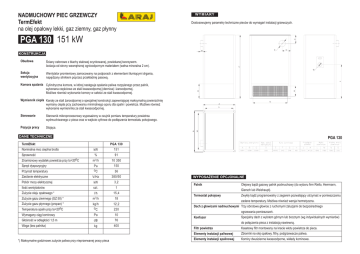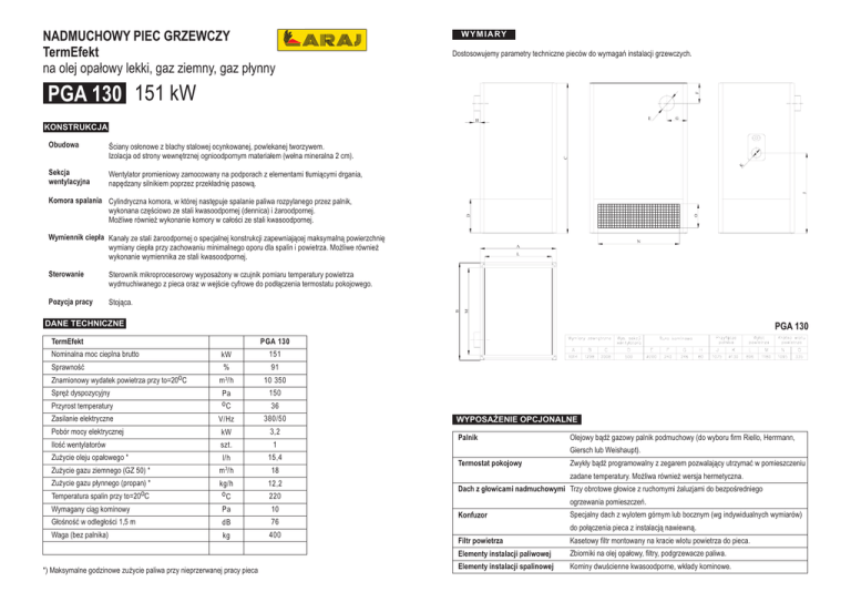 NADMUCHOWY PIEC GRZEWCZY TermEfekt na olej opa³owy lekki, gaz ziemny, gaz p³ynny W Y M I A RY Dostosowujemy parametry techniczne pieców do wymagañ instalacji grzewczych. F PGA 130 151 kW E H Œciany os³onowe z blachy stalowej ocynkowanej, powlekanej tworzywem. Izolacja od strony wewnêtrznej ognioodpornym materia³em (we³na mineralna 2 cm). Sekcja wentylacyjna Wentylator promieniowy zamocowany na podporach z elementami t³umi¹cymi drgania, napêdzany silnikiem poprzez przek³adniê pasow¹. D Komora spalania Cylindryczna komora, w której nastêpuje spalanie paliwa rozpylanego przez palnik, wykonana czêœciowo ze stali kwasoodpornej (dennica) i ¿aroodpornej. Mo¿liwe równie¿ wykonanie komory w ca³oœci ze stali kwasoodpornej. Wymiennik ciep³a Kana³y ze stali ¿aroodpornej o specjalnej konstrukcji zapewniaj¹cej maksymaln¹ powierzchniê wymiany ciep³a przy zachowaniu minimalnego oporu dla spalin i powietrza. Mo¿liwe równie¿ wykonanie wymiennika ze stali kwasoodpornej. Pozycja pracy Stoj¹ca. L B Sterownik mikroprocesorowy wyposa¿ony w czujnik pomiaru temperatury powietrza wydmuchiwanego z pieca oraz w wejœcie cyfrowe do pod³¹czenia termostatu pokojowego. N A M Sterowanie O J K Obudowa G C KONSTRUKCJA DANE TECHNICZNE PGA 130 TermEfekt PGA 130 Nominalna moc cieplna brutto kW Sprawnoœæ % 91 m 3/h 10 350 Pa oC 150 Przyrost temperatury Zasilanie elektryczne V/Hz 380/50 Pobór mocy elektrycznej kW 3,2 Iloœæ wentylatorów szt. 1 Zu¿ycie oleju opa³owego * l/h 15,4 Zu¿ycie gazu ziemnego (GZ 50) * m 3/h 18 Zu¿ycie gazu p³ynnego (propan) * Temperatura spalin przy to=20oC kg/h oC 12,2 Wymagany ci¹g kominowy Pa 10 G³oœnoœæ w odleg³oœci 1,5 m dB 76 Waga (bez palnika) kg 400 Znamionowy wydatek powietrza przy to=20oC Sprê¿ dyspozycyjny *) Maksymalne godzinowe zu¿ycie paliwa przy nieprzerwanej pracy pieca 151 36 220 WYPOSA¯ENIE OPCJONALNE Palnik Olejowy b¹dŸ gazowy palnik podmuchowy (do wyboru firm Riello, Herrmann, Giersch lub Weishaupt). Termostat pokojowy Zwyk³y b¹dŸ programowalny z zegarem pozwalaj¹cy utrzymaæ w pomieszczeniu zadane temperatury. Mo¿liwa równie¿ wersja hermetyczna. Dach z g³owicami nadmuchowymi Trzy obrotowe g³owice z ruchomymi ¿aluzjami do bezpoœredniego ogrzewania pomieszczeñ. Konfuzor Specjalny dach z wylotem górnym lub bocznym (wg indywidualnych wymiarów) do po³¹czenia pieca z instalacj¹ nawiewn¹. Filtr powietrza Kasetowy filtr montowany na kracie wlotu powietrza do pieca. Elementy instalacji paliwowej Zbiorniki na olej opa³owy, filtry, podgrzewacze paliwa. Elementy instalacji spalinowej Kominy dwuœcienne kwasoodporne, wk³ady kominowe. Budowa pieca PGA 130 1. 2. 3. 4. 5. Palnik Wentylator Termostat regulacyjny Komora spalania :\PLHQQLNFLHSáD 6. 7. 8. 9. Czujnik termostatu bezp. Czujnik temp. powietrza Szafa sterownicza Sterownik jednostki grzewczej 10. 11. 12. 13. 14. Przewód paliwowy Filtr paliwa Kratka wlotu powietrza 3U]HZyGHOHNWU\F]Q\]DVLODMF\ Obudowa jednostki grzewczej 15. 16. 17. 18. Wziernik komory spalania Wylot spalin :\áF]QLNJáyZQ\ *áRZLFHVZRERGQHJR wydmuchu