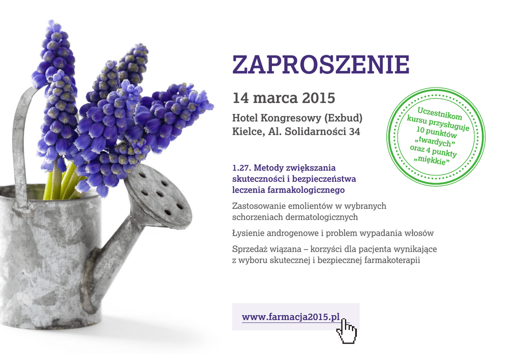 ZAPROSZENIE 14 marca 2015 Hotel Kongresowy (Exbud) Kielce, Al. Solidarności 34 1.27. Metody zwiększania skuteczności i bezpieczeństwa leczenia farmakologicznego Uczest kursu p nikom rzysług uje 10 pun któw „tward ych” oraz 4 punkty „miękk ie” Zastosowanie emolientów w wybranych schorzeniach dermatologicznych Łysienie androgenowe i problem wypadania włosów Sprzedaż wiązana – korzyści dla pacjenta wynikające z wyboru skutecznej i bezpiecznej farmakoterapii www.farmacja2015.pl ZAGADNIENIA MERYTORYCZNE • Postępowanie diagnostyczne i terapeutyczne w wypadaniu włosów • Profilaktyka niektórych schorzeń dermatologicznych w oparciu o stosowanie emolientów • Monitorowanie działań niepożądanych leków • Etapy rozwoju leku – etapy określania działań niepożądanych • Przewidywanie działań niepożądanych interakcji leków • Nowoczesne metody wspomagania czynności wątroby w przypadku wystąpienia działań hepatotoksycznych leków KURS JEST BEZPŁATNY • Różnice pomiędzy farmakoterapią a suplementacją w chorobach układu pokarmowego • Techniki komunikacji z pacjentem Uczestnikom przysługuje 10 punktów edukacyjnych „twardych” oraz 4 punkty „miękkie” przyznane przez Kielecką OIA. • Biopierwiastki a przebieg innych chorób • Ogólna rola składników mineralnych • Preparaty zawierające minerały – rola farmaceuty • Aktywna rola farmaceuty w procesie optymalizacji samoleczenia • Najczęstsze schorzenia, które są leczone bez konsultacji lekarskich • Objawy i rozpoznanie alergicznego nieżytu nosa • Najczęstsze alergeny i metody profilaktyki alergii Warunkiem otrzymania certyfikatu (pkt. „twarde”) w dniu kursu szkoleniowego jest potwierdzenie uczestnictwa na 5 dni przed jego rozpoczęciem. Pozostałe osoby które zaliczą test będą mogły odebrać certyfikat w OIA do których należą. POTWIERDZENIE OBECNOŚCI Prosimy o potwierdzenie swojej obecności na www.farmacja2015.pl, wysyłając e-mail na adres [email protected] lub pod numerem tel. 503 177 903. PROGRAM KURSU 07:30 – 08:30 rejestracja uczestników 08:30 – 10:00 posiedzenie naukowo-szkoleniowe Zastosowanie emolientów w wybranych schorzeniach dermatologicznych Łysienie androgenowe i problem wypadania włosów Sprzedaż wiązana – korzyści dla pacjenta wynikające z wyboru skutecznej i bezpiecznej farmakoterapii od 10:05 kurs: 1.27. Metody zwiększania skuteczności i bezpieczeństwa leczenia farmakologicznego ORGANIZATOR Działania niepożądane leków. Monitorowanie działań niepożądanych Prewencja i profilaktyka zdrowotna na przykładzie suplementacji minerałami Procesy wytwórcze produktów OTC, suplementów diety Bezpieczeństwo samoleczenia schorzeń najczęściej spotykanych u pacjentów. Rola farmaceuty w prewencji zdrowia. Interakcje leków o znaczeniu klinicznym i zapobieganie ich niepożądanym następstwom z uwzględnieniem profilaktyki działań hepatotoksycznych Możliwości farmakoterapii schorzeń pojawiających się ze strony układu gastroenterologicznego Sprzedaż wiązana – korzyści dla apteki i techniki komunikacji z pacjentem GRANT EDUKACYJNY Umiejętność współpracy w celu wyboru skutecznej i bezpiecznej farmakoterapii alergicznego nieżytu nosa 17:30 dyskusja, podsumowanie i test sprawdzający zdobytą wiedzę w trakcie kursu PATRONAT WSPÓŁORGANIZATOR WWW.GRUPANEOART.PL KIEROWNIK KURSU Dr n. med. Piotr Rapiejko z Kliniki Otolaryngologii Wojskowego Instytutu Medycznego, dyrektor Ośrodka Badania Alergenów Środowiskowych w Warszawie. Przewodniczący Przewodu Sekcji Laryngologicznej Polskiego Towarzystwa Alergologicznego. PROWADZĄCY Prof. zw. dr hab. n.med. Wojciech Cichy, em. kierownik I Katedry Pediatrii i Kliniki Gastroenterologii Dziecięcej i Chorób Metabolicznych Uniwersytetu Medycznego im. K. Marcinkowskiego w Poznaniu. Lekarz – specjalista w zakresie pediatrii, gastroenterologii i medycyny sportowej. Dr hab. n. med. Halina Sienkiewicz-Jarosz, ordynator I Kliniki Neurologicznej Instytutu Psychiatrii i Neurologii w Warszawie. Autorka ponad 50 publikacji oryginalnych i poglądowych w czasopismach krajowych i zagranicznych. Łączny współczynnik IF dla w/w publikacji wynosi ponad 70. Dr n. med. Marek Chmielewski, adiunkt w Katedrze i Klinice Katedry Kardiologii, Nadciśnienia Tętniczego i Chorób Wewnętrznych Warszawskiego Uniwersytetu Medycznego. Kierownik Pracowni Hemodynamiki w Mazowieckim Szpitalu Wojewódzkim. Dr n. med. Jolanta Maciejewska, dermatolog, Katedra i Klinika Dermatologii, Szpital Uniwersytecki im. Dr A. Jurasza w Bydgoszczy. Dr n. farm. Grzegorz Dołęga, kierownik Działu Transferu, Utrzymania i Rozwoju Produktów w Zakładzie Produkcyjnym Sanofi w Rzeszowie. Specjalista w zakresie rozwoju formulacji oraz przemysłowych technologii stałych postaci leków. Od 2000 r. związany z Zakładem Produkcyjnym Sanofi w Rzeszowie. Twórca konceptu formulacyjnego Magne B6 Max, Activ oraz No-Spa tabletki powlekane. Współpracuje jako wykładowca z Politechniką Rzeszowską. Zbigniew Kowalski, z wykształcenia jest negocjatorem i specjalistą ds. komunikacji. Jest autorem kilku istotnych badań opinii, jak np. oczekiwania Pacjentów wobec aptek i Farmaceutów czy oczekiwania Pacjentów wobec Lekarzy. Od 2000 roku prowadzi treningi, wykłady motywacyjne, warsztaty i debaty. Z jego wiedzy skorzystało dotychczas ponad 30 000 osób, w tym ponad 17 000 Lekarzy i ponad 4 000 Farmaceutów. Współpracuje jako wykładowca z wyższymi uczelniami i towarzystwami naukowymi.
