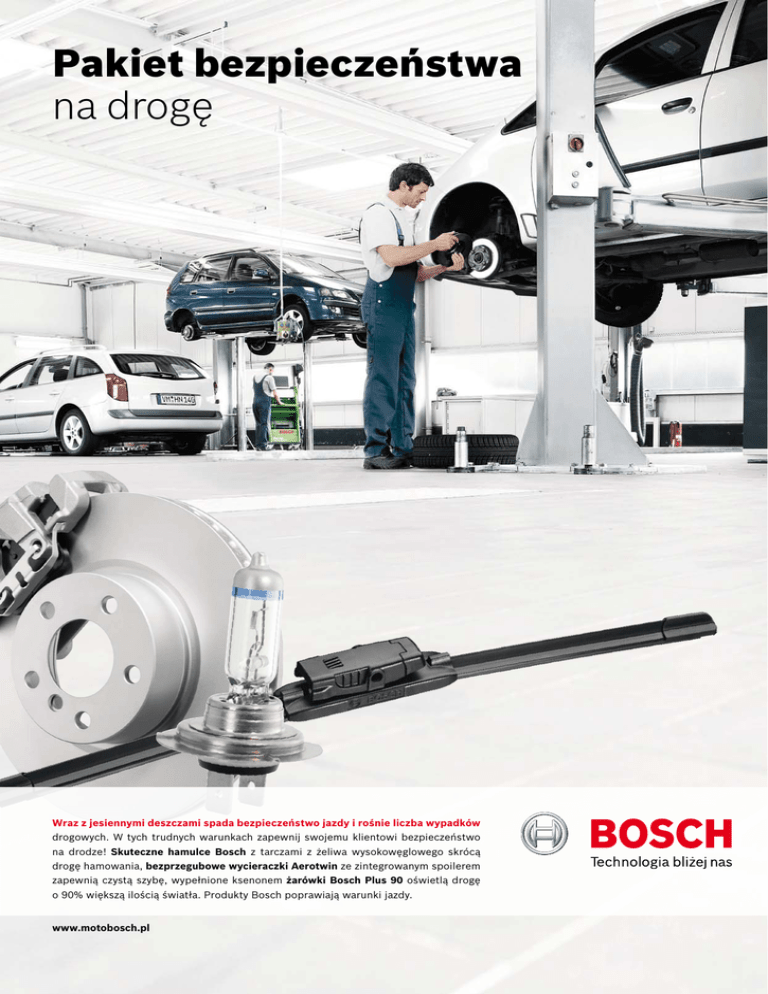 Pakiet bezpieczeństwa na drogę Wraz z jesiennymi deszczami spada bezpieczeństwo jazdy i rośnie liczba wypadków drogowych. W tych trudnych warunkach zapewnij swojemu klientowi bezpieczeństwo na drodze! Skuteczne hamulce Bosch z tarczami z żeliwa wysokowęglowego skrócą drogę hamowania, bezprzegubowe wycieraczki Aerotwin ze zintegrowanym spoilerem zapewnią czystą szybę, wypełnione ksenonem żarówki Bosch Plus 90 oświetlą drogę o 90% większą ilością światła. Produkty Bosch poprawiają warunki jazdy. www.motobosch.pl