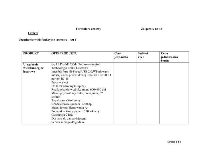 Załącznik nr 4d Formularz cenowy Część 5 Urządzenie wielofunkcyjne laserowe – szt 1 PRODUKT OPIS PRODUKTU Urządzenie wielofunkcyjne laserowe typ LJ Pro M1536dnf lub równoważne Technologia druku Laserowa Interfejs Port Hi-Speed USB 2.0;Wbudowany interfejs sieci przewodowej Ethernet 10/100 z 1 portem RJ-45 Praca w sieci Druk dwustronny (Duplex) Rozdzielczość wydruku mono 600x600 dpi Maks. prędkość wydruku, co najmniej 25 str/min Typ skanera Stolikowy Rozdzielczość skanera 1200 dpi Maks. format skanowania A4 Podajnik arkuszy papieru 250 arkuszy Gwarancja 2 lata Dostawa do zamawiającego Serwis w ciągu 48 godzin Cena jedn.netto Podatek VAT Cena jednostkowa brutto Strona 1 z 2 Wartość ogółem: ………………………………… zł Słownie: ………………………………………………………………………………………………………………………………. ……........................................................................................... (data i podpis upoważnionego przedstawiciela wykonawcy) Strona 2 z 2