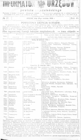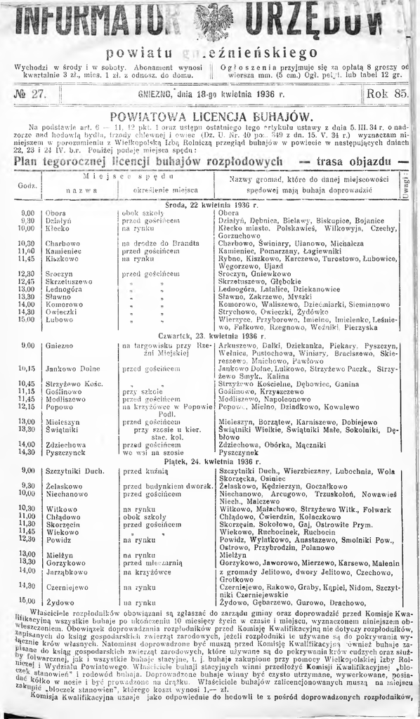 pow iatu W ychodzi w śro d y i w so b o ty . A bonam ent w ynosi k w a rta ln ie 3 zł., m ieś. 1 zł. z odnosz. do dom u. .eź n ie ń sk ie go O g ł o s z e n i a przyjm uje się za o p ła tą 8 g ro szy od mm. (5 cm.) O gł. p e iy t. lub ta b e l 12 gr. GNIEZNO, dnia i8-go kwietnia 1938 r. Rok 85. POWIATOWA LICENCJA BUHAJÓW. Na p o d sta w ie a rt. 6 — 11, 12 p k t. 1 oraz u stę p u o sta tn ieg o tego a rty k u łu u sta w y z dnia 5. III. 34 r. o nad- j | zorze nad h o d o w lą b y d ła, trzo d y chlew nej i ow iec (Dz. U, Nr. 40 p o t. 349 z dn. 15. V. 34 r.) w yznaczam nin iejszem w p o ro zu m ien iu z W ielk o p o lsk ą Izbą R olniczą p rzeg ląd buhajów w pow iecie w n astęp u jący ch dniach 22, 23 i 24 IV. b.r. P oniżej p o daję m iejsca s p ę d u : trasa objazdu — Mi e j Godz. n a z w a 9,00 9,30 10,00 Obora Działy ń K łecko 10,30 11,00 11,45 C harbow o K am ieniec K iszkow o 12,30 12,45 13,00 13,30 14,00 14,30 15,00 Sroczyn S k rzetu szew o L ed n o g ó ra S ław n o . K om orow o O w ieczki Ł ubow o 9,00 G niezno 10,15 Ja n k o w o D olne 10,45 11,15 11,45 12,15 S trzyżew o Kośc. G oślinow o M odliszew o P opow o 13,00 13,30 M ieleszyn Św iątn ik i 14,00 14,30 Zdziechow a P yszczynek 9,00 S zczytniki Duch. 9,30 10,00 Ż elaskow o N iechanow o 10,30 11,00 U ,30 11,45 12,3o W itkow o C hłądow o S korzęcin W iekow o Pow idz 13,00 13,30 14,00 M ielżyn G orzykow o Ja rzą b k o w o 14,30 C zerniejew o 15,00 Ż ydow o s c e s p ę d u o k re śle n ie m iejsca N azw y grom ad, k tó re do danej m iejscow ości spędow ej m ają b u h aja doprow adzić P1 5 Ś roda, 22 k w iein ia 1936 r. O bora obok szkoły przed gościńcem D ziałyń, D ębnica, B ielaw y, B iskupice, B ojanice r,a ry n k u K łecko m iasto, P olskaw ieś, W ilkow yja, Czechy, G orzuchow o na drodze do B randta C harbow o, Ś w iniary, U łanow o, M icnalcza przed gościńcem K am ieniec, P om arzany, Ł agiew niki na ry n k u R ybno, K iszkow o, K arczew o, T urostow o, Ł ubow ice, W ęgorzew o, Ujazd p rzed gościńcem Sroczyn, G niew kow o S krzetuszew o, G łębokie 3 » L ednogóra, L atalice, D ziekanow ice *? S ław no, Z akrzew o, M yszki n » K om orow o, W aliszew o, D ziećm iarki, Siem ianow o D v> S trychow o, Owieczki, Żydów ko •n » W ierzyce, P rzy b o ro w o , Im ielno, Iinielenko, L eśnie» M wo, F ałk o w o , Rzegnow o, W oźniki, P ierzy sk a C zw artek, 23. kw ietnia 1936 r. na ta rg o w isk u przy R ze A rkuszew o, D alki, D ziekanka, P iek ary , Pyszczyn, źni M iejskiej W ełnica, P u sto ch o w a , W in iary , B raciszew o, Skiereszew o, M nichow o, P aw łow o przed gościńcem Jan k o w o D olne, L ulkow o, S trzyżew o Paczk., S trzyżew o Sm yk., K alina S trzyżew o K ościelne, D ębow iec, G anina •ł v przy szkole G oślinow o, K rzyszczew o przed gościńcem M odliszew o, N apoleonow o na krzyżów ce w Popow ie P opow e, M ielno, D ziadkow o, K ow alew o Podl. przed gościńcem M ieleszyn, B orzątew , K arniszew o, D obiejew o p rzy szosie u kier. Św iątniki W ielkie, Ś w iątn ik i M ałe, S okolniki, Dębłow o stac. kol. przed gościńcem Z dziechow a, O bórka, M ączniki we w si na szosie P yszczynek P iątek , 24. kw ietnia 1936 r. przed ku źn ią S zczytniki Duch., W ierzbiczany, L ubochnia, W ola S k o rzęck a, O siniec przed b udynkiem dw orak. Ż ila sk o w o , K ędzierzyn, G oczałkow o przed gościńcem N iechanow o, A rcugow o, T rzuskołoń, N ow aw ieś Niech,, M alczewo na ry n k u W itkow o, M ałachow o, S trzyżew o W itk., F o lw ark o b o k szk o ły C hłądow o, Ć w ierdzin, K ołaczkow o przed gościńcem Skorzęoin, S okołow o, Gaj, O strow ite P rym . W iekow o, R uchocinek, R ucbocin » ^ na ry n k u Powidz, W ylatkow o, A uastazew o, Sm olniki Pow ., O strow o, P rzy b ro d zin , P olanow o na ry n k u M ielżyn przed m leczarnią G orzykow o, Ja w o ro w o , M ierzew o, K arsew o, M alenin na krzyżów ce z g ro m ad y Je lito w o , d w ory Je lito w o , C zechow o, G rotkow o na ry n k u C zerniejew o, R akow o, G raby, K ąpiel, Nidom, S zczyt niki C zern iejew sk ie Żydow o, G ębarzew o, G urow o, D rachow o, na ry n k u ... W łaściciele ro zp ło d n ik ó w obow iązani są zgłaszać do zarząd u gm iny o raz d o p ro w ad zić przed K om isje K w a¡U kacyjną w szy stk ie b u h a je po u k o ń czen iu 10 m iesięcy życia w czasie i m iejscu, w yznaczonem n in iejszem o b r z e z a n i e m . O bow iązek d o p row adzania ro z p ło d n ik ó w przed K om isję K w alifikacyjną nie dotyczy ro zp ło d n ik ó w , ■spisanych do k sią g g o sp o d a rsk ic h zw ierząt zarodow ych, jeżeli ro zp ło d n ik i te u ży w an e są do p o k ry w a n ia wyHCznie k ró w w łasn y ch . N ato m iast d o p ro w ad zo n e by ć m uszą p rz e d K om isję K w alifik acy jn ą -ównież b u h a je zat ,ane do k sią g g o sp o d a rsk ich zw ierząt zaro d o w y ch , k tó re uży w an e są do p o k ry w a n ia k ró w cudzych o raz służni . .'y a re z n e j, ja k i w szy stk ie b u h a je sta cy jn e, t. j. b u h a je zak u p io n e przy p om ocy W ielk o p o lsk iej Izby Rolc i W y d ziału P o w iato w eg o . W łaściciele b u h a ji sta cy jn y ch w inni p rzed ło ży ć K om isji K w alifikacyjnej „blo5j v* s ta n o w ie ń ” i ro d o w ó d b u h aja. D oprow adzone b u h aje w inny być czysto u trzy m an e, w y w erk o w an e, posiazaW ? iko w n o s ‘e ' być p ro w ad zo n e n a d rążk u . W łaściciele b u h ajó w zalicen cjo n o w an y ch m uszą n a m iejscu »bloczek sta n o w ie ń ”, k tó re g o k o sz t w ynosi 1,— zł. k o m isja K w alifik acy jn a u zn aje jak o odpow iednie do h o d o w li te z p o śró d d o p ro w ad zo n y ch ro zp ło d n ik ó w , ji. K w alifikacyjnej słu ż y w łaścicielow i ro zp ło d n ik a o dw ołanie do w łaściw ej Komisji ii wa iiiiK&cyj Hej uuw oiaw czej w ciągu 14 dni, iicz.ąc od dnia n astęp n eg o po dniu o 