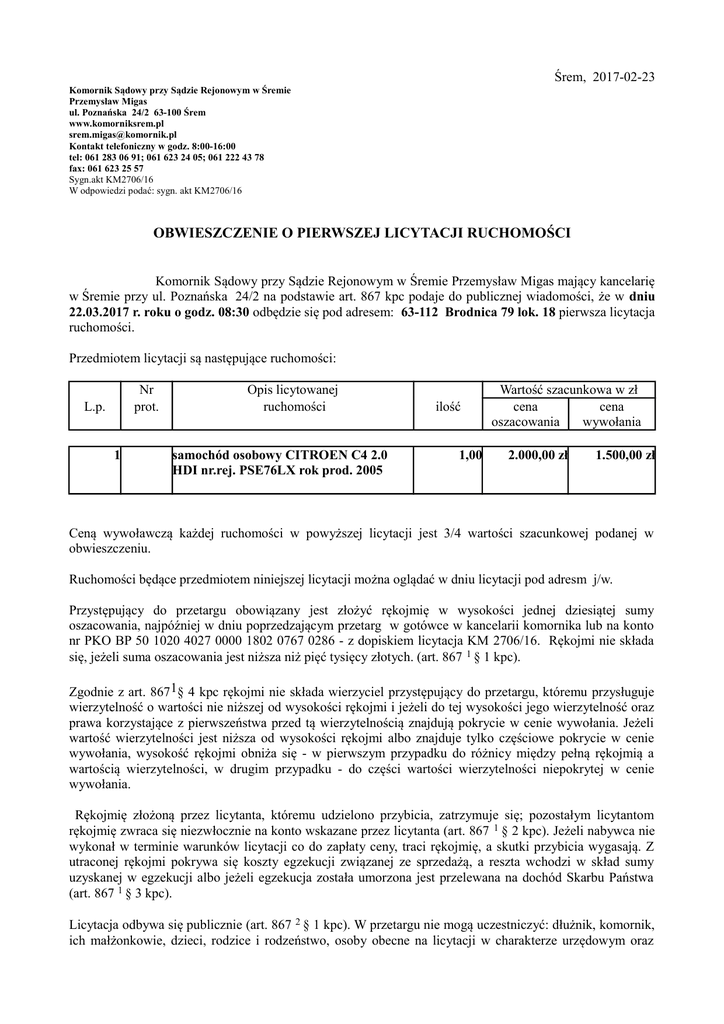 Śrem, 2017-02-23 Komornik Sądowy przy Sądzie Rejonowym w Śremie Przemysław Migas ul. Poznańska 24/2 63-100 Śrem www.komorniksrem.pl [email protected] Kontakt telefoniczny w godz. 8:00-16:00 tel: 061 283 06 91; 061 623 24 05; 061 222 43 78 fax: 061 623 25 57 Sygn.akt KM2706/16 W odpowiedzi podać: sygn. akt KM2706/16 OBWIESZCZENIE O PIERWSZEJ LICYTACJI RUCHOMOŚCI Komornik Sądowy przy Sądzie Rejonowym w Śremie Przemysław Migas mający kancelarię w Śremie przy ul. Poznańska 24/2 na podstawie art. 867 kpc podaje do publicznej wiadomości, że w dniu 22.03.2017 r. roku o godz. 08:30 odbędzie się pod adresem: 63-112 Brodnica 79 lok. 18 pierwsza licytacja ruchomości. Przedmiotem licytacji są następujące ruchomości: Nr prot. L.p. 1 Opis licytowanej ruchomości samochód osobowy CITROEN C4 2.0 HDI nr.rej. PSE76LX rok prod. 2005 ilość 1,00 Wartość szacunkowa w zł cena cena oszacowania wywołania 2.000,00 zł 1.500,00 zł Ceną wywoławczą każdej ruchomości w powyższej licytacji jest 3/4 wartości szacunkowej podanej w obwieszczeniu. Ruchomości będące przedmiotem niniejszej licytacji można oglądać w dniu licytacji pod adresm j/w. Przystępujący do przetargu obowiązany jest złożyć rękojmię w wysokości jednej dziesiątej sumy oszacowania, najpóźniej w dniu poprzedzającym przetarg w gotówce w kancelarii komornika lub na konto nr PKO BP 50 1020 4027 0000 1802 0767 0286 - z dopiskiem licytacja KM 2706/16. Rękojmi nie składa się, jeżeli suma oszacowania jest niższa niż pięć tysięcy złotych. (art. 867 1 § 1 kpc). Zgodnie z art. 8671§ 4 kpc rękojmi nie składa wierzyciel przystępujący do przetargu, któremu przysługuje wierzytelność o wartości nie niższej od wysokości rękojmi i jeżeli do tej wysokości jego wierzytelność oraz prawa korzystające z pierwszeństwa przed tą wierzytelnością znajdują pokrycie w cenie wywołania. Jeżeli wartość wierzytelności jest niższa od wysokości rękojmi albo znajduje tylko częściowe pokrycie w cenie wywołania, wysokość rękojmi obniża się - w pierwszym przypadku do różnicy między pełną rękojmią a wartością wierzytelności, w drugim przypadku - do części wartości wierzytelności niepokrytej w cenie wywołania. Rękojmię złożoną przez licytanta, któremu udzielono przybicia, zatrzymuje się; pozostałym licytantom rękojmię zwraca się niezwłocznie na konto wskazane przez licytanta (art. 867 1 § 2 kpc). Jeżeli nabywca nie wykonał w terminie warunków licytacji co do zapłaty ceny, traci rękojmię, a skutki przybicia wygasają. Z utraconej rękojmi pokrywa się koszty egzekucji związanej ze sprzedażą, a reszta wchodzi w skład sumy uzyskanej w egzekucji albo jeżeli egzekucja została umorzona jest przelewana na dochód Skarbu Państwa (art. 867 1 § 3 kpc). Licytacja odbywa się publicznie (art. 867 2 § 1 kpc). W przetargu nie mogą uczestniczyć: dłużnik, komornik, ich małżonkowie, dzieci, rodzice i rodzeństwo, osoby obecne na licytacji w charakterze urzędowym oraz licytant, który nie wykonał warunków poprzedniej licytacji (art. 867 2 § 2 kpc). Stawienie się jednego licytanta wystarcza do odbycia przetargu (art. 867 2 § 3 kpc). Pełnomocnictwo do udziału w przetargu powinno być stwierdzone dokumentem z podpisem urzędowo poświadczonym, chyba że chodzi o pełnomocnictwo udzielone adwokatowi lub radcy prawnemu (art. 867 2 § 4 kpc). Zgodnie z Rozp. MS z dnia 28.06.2004r. (Dz. U. Nr 156, poz. 1640), przypadku sprzedaży ruchomości, będącej własnością dłużnika, który na podstawie odrębnych przepisów jest przedsiębiorcą, komornik w oparciu o art.18 ustawy z dnia 11 marca 2004r. o podatku od towarów i usług ( Dz. U. z 2011 r. nr 177, poz. 1054 z późn. zm.) wystawia fakturę VAT w imieniu i na jego rzecz. W innym przypadku, dokumentem nabycia ruchomości jest protokół sprzedaży ruchomości. Za zakupione ruchomości nie udzielam gwarancji ani nie odpowiadam za stan techniczny. Zastrzegam prawo odwołania licytacji bez podania przyczyny. Zgodnie z art. 871 kpc nabywca jest obowiązany zapłacić cenę nabycia natychmiast po udzieleniu mu przybicia. Gdy jednak cena nabycia przewyższa pięćset złotych, obowiązek nabywcy ogranicza się do złożenia natychmiast jednej piątej ceny, nie mniej jednak niż pięćset złotych, przy czym resztę ceny, na którą zalicza się złożoną rękojmię, uiszcza się w dniu następnym w godzinach urzędowania kancelarii komorniczej lub na rachunek bankowy komornika do godziny osiemnastej dnia następnego. Jeżeli ten dzień przypada w sobotę lub dzień ustawowo wolny od pracy, cenę uiszcza się w następnym dniu po dniu albo dniach wolnych od pracy. Zgodnie z art. 870 § 1 kpc wierzyciel lub dłużnik mogą zaskarżyć udzielenie przybicia w razie naruszenia przepisów o publicznym charakterze licytacji, o najniższej cenie nabycia i o wyłączeniu od udziału w przetargu. Skarga powinna być zgłoszona do protokołu licytacji. Nie ma skargi na udzielenie przybicia ruchomości ulegających szybkiemu zepsuciu. Zgodnie z art. 870 § 2 kpc na postanowienie sądu przysługuje zażalenie. Zgodnie z art. 870 § 3 kpc jeżeli w ciągu dwóch tygodni skarga nie zostanie rozstrzygnięta, nabywca może w ciągu dalszego tygodnia zrzec się nabycia ruchomości i odebrać zapłaconą sumę. Zgodnie z art. 870 § 4 kpc gdy nabywca skorzysta z uprawnienia przewidzianego w paragrafie poprzedzającym albo gdy sąd odmówi przybicia, licytacja będzie uznana za niedoszłą do skutku. W związku z pojawiającymi się próbami wpływania na licytantów do odstąpienia od udziału w licytacji przez osoby zainteresowane zakupem ruchomości po cenach wywołania, komornik informuje, że każda zgłoszona próba zastraszenia innego licytanta lub próba przekupstwa w zamian za odstąpienie od licytacji będzie zgłaszana organom ścigania na podstawie art. 305 § 1 i 2 kodeksu karnego, który stanowi: Kto, w celu os