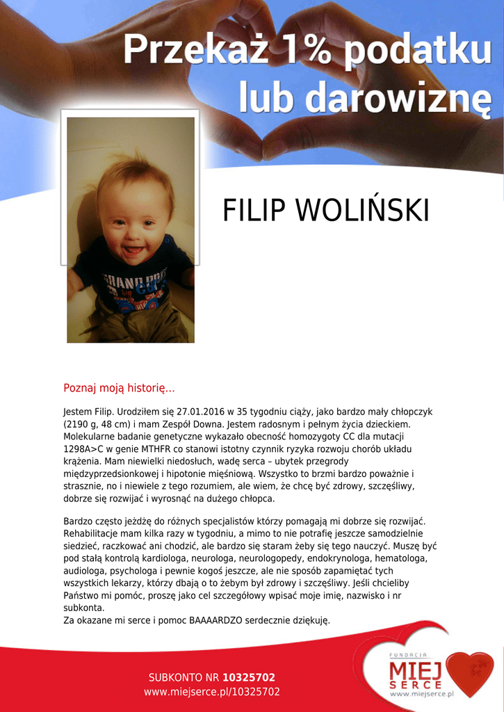 FILIP WOLIŃSKI Poznaj moją historię… Jestem Filip. Urodziłem się 27.01.2016 w 35 tygodniu ciąży, jako bardzo mały chłopczyk (2190 g, 48 cm) i mam Zespół Downa. Jestem radosnym i pełnym życia dzieckiem. Molekularne badanie genetyczne wykazało obecność homozygoty CC dla mutacji 1298A>C w genie MTHFR co stanowi istotny czynnik ryzyka rozwoju chorób układu krążenia. Mam niewielki niedosłuch, wadę serca – ubytek przegrody międzyprzedsionkowej i hipotonie mięśniową. Wszystko to brzmi bardzo poważnie i strasznie, no i niewiele z tego rozumiem, ale wiem, że chcę być zdrowy, szczęśliwy, dobrze się rozwijać i wyrosnąć na dużego chłopca. Bardzo często jeżdżę do różnych specjalistów którzy pomagają mi dobrze się rozwijać. Rehabilitacje mam kilka razy w tygodniu, a mimo to nie potrafię jeszcze samodzielnie siedzieć, raczkować ani chodzić, ale bardzo się staram żeby się tego nauczyć. Muszę być pod stałą kontrolą kardiologa, neurologa, neurologopedy, endokrynologa, hematologa, audiologa, psychologa i pewnie kogoś jeszcze, ale nie sposób zapamiętać tych wszystkich lekarzy, którzy dbają o to żebym był zdrowy i szczęśliwy. Jeśli chcieliby Państwo mi pomóc, proszę jako cel szczegółowy wpisać moje imię, nazwisko i nr subkonta. Za okazane mi serce i pomoc BAAAARDZO serdecznie dziękuję. SUBKONTO NR 10325702 www.miejserce.pl/10325702