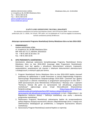 GMIN A MIED ZI AN A GÓR A ul. Urzędnicza 18, 26-085 Miedziana Góra Tel. + 48 41 303 16 26 Fax. + 48 41 303 16 05 [email protected] www.miedziana-gora.pl Miedziana Góra, dn. 15.03.2016 ZAPYTANIE OFERTOWE NR FSR.1.2016/POPT Do udzielenia zamówienia nie stosuje się przepisów ustawy z dnia 29 stycznia 2004r. Prawo zamówień publicznych, (Dz. U. z 2010r., Nr 113 poz. 759 z późn. zm.) na podstawie art. 4 ust 8 ze względu na szacowaną wartość zamówienia poniżej 30 000 euro. dotyczące opracowania Programu Rewitalizacji Gminy Miedziana Góra na lata 2016-2023 I. ZAMAWIAJĄCY: GMINA MIEDZIANA GÓRA ul. Urzędnicza 18, 26-085 Miedziana Góra NIP: 959-167-71-17, REGON: 291010323 Tel. + 48 41 303 16 26 wew. 33 Fax. + 48 41 303 16 05 II. OPIS PRZEDMIOTU ZAMÓWIENIA: Zamówienie obejmuje wykonanie kompleksowego Programu Rewitalizacji Gminy Miedziana Góra na lata 2016-2023 (zwanego dalej Programem Rewitalizacji). Dokument musi być zgodny z aktualnymi dokumentami unijnymi, krajowymi, wojewódzkimi, powiatowymi jak również z lokalnymi dokumentami planistycznymi i strategicznymi, w których ujęta jest Gmina. 1. Program Rewitalizacji Gminy Miedziana Góra na lata 2016-2023 będzie stanowił podstawę do aplikowania o środki finansowe w ramach Regionalnego Programu Operacyjnego Województwa Świętokrzyskiego 2014-2020 i powinien być zgodny z wytycznymi w zakresie rewitalizacji w programach operacyjnych na lata 2014 – 2020 opracowanymi przez Ministerstwo Infrastruktury i Rozwoju oraz z zapisami "Konkursu Dotacji dla gmin na opracowanie lub aktualizację programów rewitalizacji" ogłoszonego przez Urząd Marszałkowski Województwa Świętokrzyskiego (http://www.2014-2020.rposwietokrzyskie.pl/rewitalizacja/item/307-konkurs-dotacji-dla-gmin-naopracowanie-lub-aktualizacje-programow-rewitalizacji), w tym z Załącznikiem 1 do Regulaminu konkursu dotacji – Definicja rewitalizacji oraz cechy i elementy programów rewitalizacji. 2. Wykonawca Programu Rewitalizacji zobowiązany będzie do przeprowadzenia pełnej diagnozy służącej wyznaczeniu obszaru zdegradowanego (wraz z mapą) oraz zdefiniowaniu dotykających go problemów, a następnie wyznaczeniu obszaru rewitalizacji. 3. Opracowany Program Rewitalizacji zawierał będzie co najmniej: 4. 5. 6. 7. a. opis powiązań programu rewitalizacji z dokumentami strategicznymi i planistycznymi gminy; b. diagnozę czynników i zjawisk kryzysowych oraz skalę i charakter potrzeb rewitalizacyjnych; c. zasięgi przestrzenne obszaru/obszarów rewitalizacji tj. określenie, w oparciu o inne dokumenty strategiczne gminy lub diagnozę i identyfikację potrzeb rewitalizacyjnych, terytorium/terytoriów najbardziej wymagających wsparcia; d. wizję stanu obszaru po przeprowadzeniu rewitalizacji (planowany efekt rewitalizacji); e. cele rewitalizacji oraz odpowiadające zidentyfikowanym potrzebom rewitalizacyjnym kierunki działań mających na celu eliminację lub ograniczenie negatywnych zjawisk; f. listę planowanych, podstawowych projektów i przedsięwzięć rewitalizacyjnych wraz z ich opisami zawierającymi, w odniesieniu do każdego projektu/przedsięwzięcia rewitalizacyjnego, co najmniej: nazwę i wskazanie podmiotów go realizujących, zakres realizowanych zadań, lokalizację (miejsce przeprowadzenia danego projektu), szacowaną wartość, prognozowane rezultaty wraz ze sposobem ich oceny i zmierzenia w odniesieniu do celów rewitalizacji; g. charakterystykę pozostałych rodzajów przedsięwzięć rewitalizacyjnych realizujących kierunki działań, mających na celu eliminację lub ograniczenie negatywnych zjawisk powodujących sytuację kryzysową; h. mechanizmy zapewnienia komplementarności między poszczególnymi projektami/przedsięwzięciami rewitalizacyjnymi oraz pomiędzy działaniami różnych podmiotów i funduszy na obszarze objętym programem rewitalizacji; i. indykatywne ramy finansowe w odniesieniu do przedsięwzięć, o których mowa w lit. f oraz g, z indykatywnymi wielkościami środków finansowych z różnych źródeł (także spoza funduszy polityki spójności na lata 2014-2020 – publiczne i prywatne środki krajowe w celu realizacji zasady dodatkowości środków UE); j. mechanizmy włączenia mieszkańców, przedsiębiorców i innych podmiotów i grup aktywnych na terenie gminy w proces rewitalizacji; k. system realizacji (wdrażania) programu rewitalizacji; l. system monitoringu i oceny skuteczności działań i system wprowadzania modyfikacji w reakcji na zmiany w otoczeniu programu. Analiza i diagnoza, o których mowa w pkt. 2, powinna obejmować swoim zakresem wszystkie sołectwa Gminy i opierać się na najnowszych dostępnych danych. W przypadku braku jakichkolwiek danych w określonym temacie Wykonawca będzie zobowiązany do ich zebrania we własnym zakresie. Program Rewitalizacji powinien posiadać następujące cechy: kompleksowość programu rewitalizacji, koncentrację programu rewitalizacji, komplementarność projektów/przedsięwzięć rewitalizacyjnych (komplementarność przestrzenną, komplementarność problemową, komplementarność proceduralnoinstytucjonalną, komplementarność międzyokresową, komplementarność źródeł finansowania). Program Rewitalizacji powinien realizować zasady partnerstwa i partycypacji. Zgodnie z obowiązującymi przepisami prawa Program Rewitalizacji będzie podlegał ocenie Instytucji Zarządzającej RPO WŚ, w związku z czym Wykonawca zobowiązany będzie do dostosowania go do ewentualnych uwag w/w Instytucji. 8. Wykonawca będzie odpowiedzialny za zaangażowanie społeczności lokalnej Gminy Miedziana Góra, w tym szczególnie mieszkańców rewitalizowanych obszarów do tworzenia Programu Rewitalizacji. 9. W ramach zamówienia Wykonawca zobowiązuje się do uczestnictwa w spotkaniach z radnymi Rady Gminy w Miedzianej Górze oraz podmiotami działającymi na obszarach zdegradowanych, a także prezentacji projektu Programu Rewitalizacji podczas uchwalenia na ses