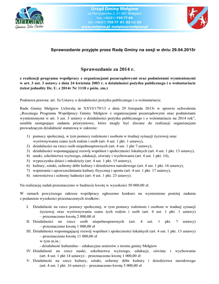Sprawozdanie przyjęte przez Radę Gminy na sesji w dniu 29.04.2015r Sprawozdanie za 2014 r. z realizacji programu współpracy z organizacjami pozarządowymi oraz podmiotami wymienionymi w art. 3 ust. 3 ustawy z dnia 24 kwietnia 2003 r. o działalności pożytku publicznego i o wolontariacie (tekst jednolity Dz. U. z 2014r Nr 1118 z późn. zm.) Podstawa prawna: art. 5a Ustawy o działalności pożytku publicznego i o wolontariacie. Rada Gminy Mełgiew Uchwałą nr XXVI/179/13 z dnia 29 listopada 2013r w sprawie uchwalenia „Rocznego Programu Współpracy Gminy Mełgiew z organizacjami pozarządowymi oraz podmiotami wymienionymi w art. 3 ust. 3 ustawy o działalności pożytku publicznego i o wolontariacie na 2014 rok”, ustaliła następujące zadania priorytetowe, które mogły być zlecane do realizacji organizacjom prowadzącym działalność statutową w zakresie: 1) pomocy społecznej, w tym pomocy rodzinom i osobom w trudnej sytuacji życiowej oraz wyrównywania szans tych rodzin i osób (art. 4 ust. 1 pkt. 1 ustawy), 2) działalności na rzecz osób niepełnosprawnych (art. 4 ust. 1 pkt 7 ustawy), 3) działalności wspomagającej rozwój wspólnot i społeczności lokalnych (art. 4 ust. 1 pkt. 13 ustawy), 4) nauki, szkolnictwa wyższego, edukacji, oświaty i wychowania (art. 4 ust. 1 pkt. 14), 5) wypoczynku dzieci i młodzieży (art. 4 ust. 1 pkt. 15 ustawy), 6) kultury, sztuki, ochrony dóbr kultury i dziedzictwa narodowego (art. 4 ust. 1 pkt. 16 ustawy), 7) wspierania i upowszechniania kultury fizycznej i sportu (art. 4 ust. 1 pkt. 17 ustawy), 8) ratownictwa i ochrony ludności (art. 4 ust. 1 pkt. 23 ustawy). Na realizację zadań przeznaczono w budżecie kwotę w wysokości 50 000,00 zł. W ramach powyższego zakresu współpracy ogłoszono konkurs na wymienione poniżej zadania z podaniem wysokości przeznaczonych środków: I. Działalność na rzecz pomocy społecznej, w tym pomocy rodzinom i osobom w trudnej sytuacji życiowej oraz wyrównywania szans tych rodzin i osób (art. 4 ust. 1 pkt. 1 ustawy) – przeznaczono kwotę 2 000,00 zł II. Działalności na rzecz osób niepełnosprawnych (art. 4 ust. 1 pkt. 7 ustawy) – przeznaczono kwotę 1 000,00 zł III. Działalności wspomagającej rozwój wspólnot i społeczności lokalnych (art. 4 ust. 1 pkt. 13 ustawy) – przeznaczono kwotę 11 000,00 zł w tym m.in.: - działalność kulturalno – edukacyjna seniorów z terenu gminy Mełgiew IV. Działalność na rzecz nauki, szkolnictwa wyższego, edukacji, oświaty i wychowania (art. 4 ust. 1 pkt 14 ustawy) – przeznaczono kwotę 1 000,00 zł V. Działalność na rzecz kultury, sztuki, ochrony dóbr kultury i dziedzictwa narodowego (art. 4 ust. 1 pkt. 16 ustawy) – przeznaczono kwotę 5 000,00 zł VI. Działalność na rzecz wspierania i upowszechniania kultury fizycznej i sportu (art. 4 ust. 1 pkt. 17 ustawy) – przeznaczono kwotę 28 000,00 zł w tym m.in.: - prowadzenie szkolenia sportowego dzieci i młodzieży, zakup sprzętu i modernizacja bazy sportowej, organizacja turnieju piłki nożnej na nowopowstałych boiskach wielofunkcyjnych VII. Działalność na rzecz ratownictwa i ochrony ludności (art. 4 ust. 1 pkt. 23 ustawy) – przeznaczono kwotę 2 000,00 zł Na konkurs, który odbył się w dniu 9 kwietnia 2014r swoje oferty złożyło 13 organizacji – łącznie wpłynęło 18 ofert. W ramach otwartego konkursu ofert nie złożono oferty na zadanie z zakresu działalności na rzecz osób niepełnosprawnych. W wyniku rozstrzygnięcia konkursowego zawarto umowy z następującymi organizacjami: 1. Stowarzyszeniu Pomocy Szkole i Ekorozwoju Wsi w Krzesimowie powierzono do realizacji następujące zadania: a) zadanie pt. „Wsparcie dzieci i rodzin w trudnej sytuacji życiowej poprzez prowadzenie zajęć opiekuńczo – wychowawczych i specjalistycznych dla dzieci ze Świetlicy Środowiskowej w Krzesimowie” - w zakresie działalności na rzecz pomocy rodzinom i osobom w trudnej sytuacji życiowej oraz wyrównywaniu szans tych rodzin i osób. Przyznano dotację w wysokości 2 000,00 zł. Termin realizacji 12.05.2014 – 30.12.2014r. Prowadzono następujące działania: Organizację zajęć opiekuńczo - wychowawczych oraz zajęć rozwijająco – terapeutycznych pod hasłem „Jestem ważny”. Rezultaty: wspieranie wychowawczej roli rodziny w integralnym rozwoju dziecka w jej naturalnym środowisku, wyrównanie dysproporcji edukacyjnych i wychowawczych u podopiecznych, rozwinięcie u wychowanków umiejętności radzenia sobie w trudnych sytuacjach życia codziennego i rozwiązywanie konfliktów, wzmacnianie u wychowanków poczucia własnej wartości, profilaktyka uzależnień, wyrabianie i utrwalanie u wychowanków prawidłowych nawyków higieny, dożywianie dzieci, świadome i aktywne przygotowanie dziecka do życia w społeczeństwie aby mimo problemów osobistych i rodzinnych mogło stać się pełnowartościowym człowiekiem, pełnym poczucia własnej wartości, zdolnym do podejmowania dojrzałych decyzji. Udział własny wykazano w wysokości: 1580,00 zł, praca społeczna członków stowarzyszenia wyceniona została na kwotę 600,00 zł. b) zadanie pt. „Edukacja ekologiczna dzieci i młodzieży z terenu Gminy Mełgiew poprzez organizację Gminnego Przeglądu Piosenki Ekologicznej oraz Wiosennych Spotkań Ekologicznych” w zakresie działalności na rzecz nauki, szkolnictwa wyższego, edukacji, oświaty i wychowania. Termin realizacji zadania: 08.05.2014 r do 30.11.2014r . Udzielono dotacji w wysokości 1 000,00 zł. Zorganizowany został Gminny Przegląd Piosenki Ekologicznej, IV Wiosenne Spotkania Ekologiczne w ramach których przeprowadzono zbiórkę surowców wtórnych, zorganizowano: Ekologiczną Grę Terenową pod hasłem „ZNAM, PODZIWIAM, CHRONIĘ I SEGREGUJĘ ODPADY”, wystawę pokonkursową prac konkursu „Gdy segregujesz – Ziemię ratujesz” oraz piknik ekologiczny. Dotację wykorzystano na: organizację poczęstunku: 1 000,00 zł. Praca