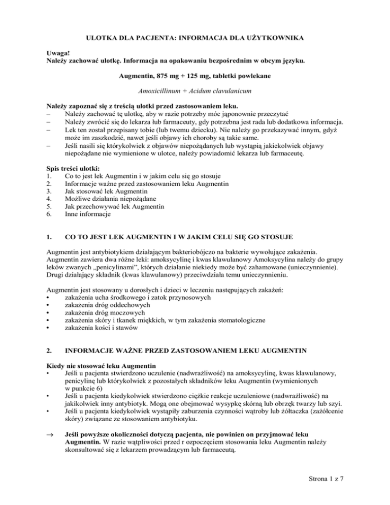 ULOTKA DLA PACJENTA: INFORMACJA DLA UŻYTKOWNIKA Uwaga! Należy zachować ulotkę. Informacja na opakowaniu bezpośrednim w obcym języku. Augmentin, 875 mg + 125 mg, tabletki powlekane Amoxicillinum + Acidum clavulanicum Należy zapoznać się z treścią ulotki przed zastosowaniem leku. Należy zachować tę ulotkę, aby w razie potrzeby móc jąponownie przeczytać Należy zwrócić się do lekarza łub farmaceuty, gdy potrzebna jest rada lub dodatkowa informacja. Lek ten został przepisany tobie (lub twemu dziecku). Nie należy go przekazywać innym, gdyż może im zaszkodzić, nawet jeśli objawy ich choroby są takie same. Jeśli nasili się którykolwiek z objawów niepożądanych lub wystąpią jakiekolwiek objawy niepożądane nie wymienione w ulotce, należy powiadomić lekarza lub farmaceutę. Spis treści ulotki: 1. Co to jest lek Augmentin i w jakim celu się go stosuje 2. Informacje ważne przed zastosowaniem leku Augmentin 3. Jak stosować lek Augmentin 4. Możliwe działania niepożądane 5. Jak przechowywać lek Augmentin 6. Inne informacje 1. CO TO JEST LEK AUGMENTIN I W JAKIM CELU SIĘ GO STOSUJE Augmentin jest antybiotykiem działającym bakteriobójczo na bakterie wywołujące zakażenia. Augmentin zawiera dwa różne leki: amoksycylinę i kwas klawulanowy Amoksycylina należy do grupy leków zwanych „penicylinami”, których działanie niekiedy może być zahamowane (unieczynnienie). Drugi działający składnik (kwas klawulanowy) przeciwdziała temu unieczynnieniu. Augmentin jest stosowany u dorosłych i dzieci w leczeniu następujących zakażeń: • zakażenia ucha środkowego i zatok przynosowych • zakażenia dróg oddechowych • zakażenia dróg moczowych • zakażenia skóry i tkanek miękkich, w tym zakażenia stomatologiczne • zakażenia kości i stawów 2. INFORMACJE WAŻNE PRZED ZASTOSOWANIEM LEKU AUGMENTIN Kiedy nie stosować leku Augmentin • Jeśli u pacjenta stwierdzono uczulenie (nadwrażliwość) na amoksycylinę, kwas klawulanowy, penicylinę lub którykolwiek z pozostałych składników leku Augmentin (wymienionych w punkcie 6) • Jeśli u pacjenta kiedykolwiek stwierdzono ciężkie reakcje uczuleniowe (nadwrażliwość) na jakikolwiek inny antybiotyk. Mogą one obejmować wysypkę skórną lub obrzęk twarzy lub szyi. • Jeśli u pacjenta kiedykolwiek wystąpiły zaburzenia czynności wątroby lub żółtaczka (zażółcenie skóry) związane ze stosowaniem antybiotyku. Jeśli powyższe okoliczności dotyczą pacjenta, nie powinien on przyjmować leku Augmentin. W razie wątpliwości przed r ozpoczęciem stosowania leku Augmentin należy skonsultować się z lekarzem prowadzącym lub farmaceutą. Strona 1 z 7 Kiedy zachować szczególną ostrożność stosując lek Augmentin Przed rozpoczęciem stosowania leku Augmentin należy skonsultować się z lekarzem prowadzącym lub farmaceutą jeśli pacjent: • choruje na mononukleozę zakaźną • jest leczony w związku z chorobą wątroby lub nerek • nieregularnie oddaje mocz W razie wątpliwości czy powyższe okoliczności dotyczą pacjenta, należy skonsultować się z lekarzem prowadzącym lub farmaceutą przed rozpoczęciem przyjmowania leku Augmentin. W niektórych przypadkach lekarz może badać jaki rodzaj bakterii wywołał u pacjenta zakażenie. W zależności od wyników pacjent może otrzymać Augmentin w innej dawce lub inny lek. Dolegliwości, na które należy zwrócić uwagę Stosowanie leku Augmentin może pogorszyć przebieg niektórych chorób lub spowodować ciężkie działania niepożądane, w tym reakcje alergiczne, drgawki i zapalenie jelita grubego. Należy zwracać uwagę, czy w czasie stosowania leku Augmentin u pacjenta nie występują określone objawy, aby zmniejszyć ryzyko wystąpienia wszelkich problemów. Patrz ‘Dolegliwości na które należy zwrócić uwagę’ w punkcie 4. Badania krwi i moczu Jeśli pacjent ma mieć wykonywane badania krwi (takie jak badanie krwinek czerwonych lub badania czynności wątroby) lub badania moczu (na glukozę), należy poinformować lekarza lub pielęgniarkę, że pacjent przyjmuje lek Augmentin. Augmentin może bowiem wpływać na wyniki tego typu badań. Stosowanie leku Augmentin z innymi lekami Należy powiedzieć lekarzowi prowadzącemu lub farmaceucie o wszystkich przyjmowanych ostatnio lekach, również tych, które wydawane są bez recepty i o lekach ziołowych. Jeśli jednocześnie z lekiem Augmentin pacjent przyjmuje allopurynol (stosowany w dnie moczanowej), bardziej prawdopodobne może być wystąpienie u pacjenta skórnych reakcji alergicznych. Jeśli pacjent przyjmuje probenecyd (stosowany w dnie moczanowej), lekarz prowadzący może zdecydować o modyfikacji dawki leku Augmentin. Jeśli równocześnie z lekiem Augmentin pacjent stosuje leki zmniejszające krzepliwość krwi (takie jak warfaryna), może być konieczne wykonanie dodatkowych badań krwi. Augmentin może wpływać na działanie metotreksatu (lek stosowany w leczeniu nowotworów lub chorób reumatycznych). Ciąża i karmienie piersią Jeśli pacjentka wie lub przypuszcza, że jest w ciąży, albo jeżeli karmi piersią powinna powiedzieć o tym lekarzowi prowadzącemu lub farmaceucie. Przed zastosowaniem każdego leku należy poradzić się lekarza lub farmaceuty. Prowadzenie pojazdów i obsługa maszyn Augmentin może powodować działania niepożądane i wywoływać objawy zaburzające zdolność prowadzenia pojazdów. Nie należy prowadzić pojazdów ani obsługiwać maszyn, chyba że pacjent czuje się dobrze. 3. JAK STOSOWAĆ LEK AUGMENTIN Augmentin należy zawsze stosować zgodnie z zaleceniami lekarza. W przypadku wątpliwości należy ponownie skontaktować się z lekarzem prowadzącym lub farmaceutą. Strona 2 z 7 Dorośli i dzieci o masie ciała 40 kg lub większej • Zwykle stosowana dawka - 1 tabletka dwa razy na dobę • Większa dawka - 1 tabletka trzy razy na dobę Dzieci o masie ciała mniejszej niż 40 kg Dzieci w wieku 