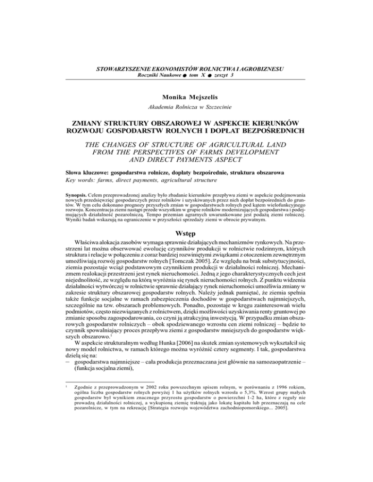 386 Monika Mejszelis STOWARZYSZENIE EKONOMISTÓW ROLNICTWA I AGROBIZNESU Roczniki Naukowe ● tom X ● zeszyt 3 Monika Mejszelis Akademia Rolnicza w Szczecinie ZMIANY STRUKTURY OBSZAROWEJ W ASPEKCIE KIERUNKÓW ROZWOJU GOSPODARSTW ROLNYCH I DOP£AT BEZPOREDNICH THE CHANGES OF STRUCTURE OF AGRICULTURAL LAND FROM THE PERSPECTIVES OF FARMS DEVELOPMENT AND DIRECT PAYMENTS ASPECT S³owa kluczowe: gospodarstwa rolnicze, dop³aty bezporednie, struktura obszarowa Key words: farms, direct payments, agricultural structure Synopsis. Celem przeprowadzonej analizy by³o zbadanie kierunków przep³ywu ziemi w aspekcie podejmowania nowych przedsiêwziêæ gospodarczych przez rolników i uzyskiwanych przez nich dop³at bezporednich do gruntów. W tym celu dokonano prognozy przysz³ych zmian w gospodarstwach rolnych pod k¹tem wielofunkcyjnego rozwoju. Koncentracja ziemi nast¹pi przede wszystkim w grupie rolników modernizuj¹cych gospodarstwa i podejmuj¹cych dzia³alnoæ pozarolnicz¹. Tempo przemian agrarnych uwarunkowane jest poda¿¹ ziemi rolniczej. Wyniki badañ wskazuj¹ na ograniczenie w przysz³oci sprzeda¿y ziemi w obrocie prywatnym. Wstêp W³aciwa alokacja zasobów wymaga sprawnie dzia³aj¹cych mechanizmów rynkowych. Na przestrzeni lat mo¿na obserwowaæ ewolucjê czynników produkcji w rolnictwie rodzinnym, których struktura i relacje w po³¹czeniu z coraz bardziej rozwiniêtymi zwi¹zkami z otoczeniem zewnêtrznym umo¿liwiaj¹ rozwój gospodarstw rolnych [Tomczak 2005]. Ze wzglêdu na brak substytucyjnoci, ziemia pozostaje wci¹¿ podstawowym czynnikiem produkcji w dzia³alnoci rolniczej. Mechanizmem realokacji przestrzeni jest rynek nieruchomoci. Jedn¹ z jego charakterystycznych cech jest niejednolitoæ, ze wzglêdu na któr¹ wyró¿nia siê rynek nieruchomoci rolnych. Z punktu widzenia dzia³alnoci wytwórczej w rolnictwie sprawnie dzia³aj¹cy rynek nieruchomoci umo¿liwia zmiany w zakresie struktury obszarowej gospodarstw rolnych. Nale¿y jednak pamiêtaæ, ¿e ziemia spe³nia tak¿e funkcje socjalne w ramach zabezpieczenia dochodów w gospodarstwach najmniejszych, szczególnie na tzw. obszarach problemowych. Ponadto, pozostaje w krêgu zainteresowañ wielu podmiotów, czêsto niezwi¹zanych z rolnictwem, dziêki mo¿liwoci uzyskiwania renty gruntowej po zmianie sposobu zagospodarowania, co czyni j¹ atrakcyjn¹ inwestycj¹. W przypadku zmian obszarowych gospodarstw rolniczych obok spodziewanego wzrostu cen ziemi rolniczej bêdzie to czynnik spowalniaj¹cy proces przep³ywu ziemi z gospodarstw mniejszych do gospodarstw wiêkszych obszarowo.1 W aspekcie strukturalnym wed³ug Hunka [2006] na skutek zmian systemowych wykszta³ci³ siê nowy model rolnictwa, w ramach którego mo¿na wyró¿niæ cztery segmenty. I tak, gospodarstwa dziel¹ siê na: – gospodarstwa najmniejsze ca³a produkcja przeznaczana jest g³ównie na samozaopatrzenie (funkcja socjalna ziemi), 1 Zgodnie z przeprowadzonym w 2002 roku powszechnym spisem rolnym, w porównaniu z 1996 rokiem, ogólna liczba gospodarstw rolnych powy¿ej 1 ha u¿ytków rolnych wzros³a o 5,3%. Wzrost grupy ma³ych gospodarstw by³ wynikiem znacznego przyrostu gospodarstw o powierzchni 1-2 ha, które z regu³y nie prowadz¹ dzia³alnoci rolniczej, a wykupion¹ ziemiê traktuj¹ jako lokatê kapita³u lub przeznaczaj¹ na cele pozarolnicze, w tym na rekreacjê [Strategia rozwoju województwa zachodniopomorskiego... 2005]. Zmiany struktury obszarowej w aspekcie kierunków rozwoju ... 387 – gospodarstwa tradycyjne produkcja rolnicza trafia g³ównie na lokalny rynek (zasoby alokowane s¹ g³ównie w dzia³alnoæ pozarolnicz¹), – gospodarstwa wysokotowarowe intensywna produkcja i rozwiniête powi¹zania rynkowe, – gospodarstwa domowe pomimo posiadania ziemi rolniczej nie prowadz¹ produkcji rolniczej. W ka¿dym z przedstawionych segmentów czynnik ziemi jest w ró¿nym stopniu wykorzystywany. Z uwagi na mo¿liwoci poprawy struktury obszarowej gospodarstw rolniczych znaczenie maj¹ zasoby ziemi w grupach drugiej i czwartej, tj. gospodarstwach tradycyjnych i gospodarstwach nieprowadz¹cych produkcji rolniczej. Podzia³ ten mo¿na uzupe³niæ jeszcze o gospodarstwa niskotowarowe, których w³aciciele utrzymuj¹ siê wy³¹cznie z rolnictwa. Po wejciu Polski w struktury UE rolnicy mog¹ korzystaæ z dodatkowego wsparcia finansowego, jakim s¹ dop³aty bezporednie do gruntów rolnych. Warunkiem uzyskania pomocy publicznej jest uzyskanie wpisu do ewidencji producentów (posiada numer identyfikacyjny nadany przez ARiMR), posiadanie gospodarstwa rolnego, w sk³ad którego wchodz¹ dzia³ki rolne o ³¹cznej powierzchni nie mniejszej ni¿ 1 ha oraz utrzymywanie gospodarstwa rolnego w dobrej kulturze rolnej. Do otrzymania p³atnoci bezporednich do gruntów rolnych uprawniony jest w³aciciel gospodarstwa rolnego, a tak¿e osoba, która w³ada nim z innego tytu³u, np. dzier¿awy, u¿ytkowania, u¿yczenia. O p³atnoæ na dan¹ dzia³kê roln¹ mo¿e ubiegaæ siê tylko jeden wnioskodawca, tj. w³aciciel lub u¿ytkownik. Niew¹tpliwie najwiêksze korzyci z tytu³u p³atnoci obszarowych uzyskuj¹ w³aciciele najwiêkszych gospodarstw, co wcale nie oznacza, ¿e w przypadku gospodarstw o niewielkiej powierzchni ich w³aciciele bêd¹ sk³onni z nich zrezygnowaæ. Dodatkowo przy niskich kosztach przetrzymywania ziemi i praktykach spekulacyjnych na rynku ziemi dop³aty w takim kszta³cie prawdopodobnie spowolni¹ proces dalszej poprawy struktury obszarowej gospodarstw w Polsce. Cel i metoda badañ Bior¹c pod uwagê zmiany, zachodz¹ce na obszarach wiejskich województwa zachodniopomorskiego, mo¿na skonstatowaæ, ¿e rolnictwo nadal pozostaje wa¿n¹ funkcj¹ i anga¿uje znaczne zasoby ludnoci wiejskiej. Tym niemniej nie mo¿na ju¿ stawiaæ znaku równoci pomiêdzy rozwojem wsi i rolnictwa. Równie wa¿ne jest ró¿nicowanie dzia³alnoci gospodarczej w kierunku tworzenia alternatywnych róde³ dochodów, a tym samym tworzenia warunków do polepsze