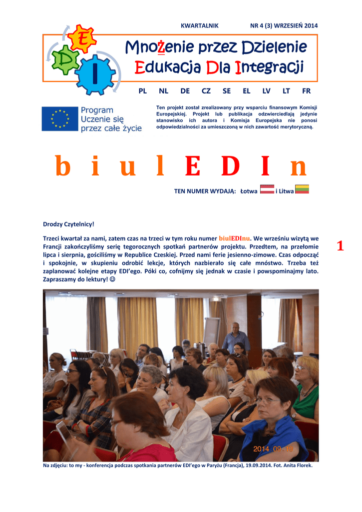 D KWARTALNIK E I NR 4 (3) WRZESIEŃ 2014 MnoŻenie przez Dzielenie Edukacja Dla Integracji PL NL DE CZ SE EL LV LT FR Ten projekt został zrealizowany przy wsparciu finansowym Komisji Europejskiej. Projekt lub publikacja odzwierciedlają jedynie stanowisko ich autora i Komisja Europejska nie ponosi odpowiedzialności za umieszczoną w nich zawartość merytoryczną. b i u l E D I n TEN NUMER WYDAJĄ: Łotwa i Litwa Drodzy Czytelnicy! Trzeci kwartał za nami, zatem czas na trzeci w tym roku numer biulEDInu. We wrześniu wizytą we Francji zakończyliśmy serię tegorocznych spotkań partnerów projektu. Przedtem, na przełomie lipca i sierpnia, gościliśmy w Republice Czeskiej. Przed nami ferie jesienno-zimowe. Czas odpocząć i spokojnie, w skupieniu odrobić lekcje, których nazbierało się całe mnóstwo. Trzeba też zaplanować kolejne etapy EDI’ego. Póki co, cofnijmy się jednak w czasie i powspominajmy lato. Zapraszamy do lektury! Na zdjęciu: to my - konferencja podczas spotkania partnerów EDI’ego w Paryżu (Francja), 19.09.2014. Fot. Anita Florek. 1 Miniony kwartał… odbyliśmy dwa spotkania partnerów projektu („mobilności”): do Czech (przełom lipca i sierpnia, gospodarz: Miejscowe Koło Polskiego Związku Kulturalno-Oświatowego w Jabłonkowie, i do Francji (wrzesień, gdzie gospodarzem było Stowarzyszenie Florek&Entertainment). Na zdjęciu: start pochodu początkującego doroczne Gorolski Święto w Jabłonkowie. Fot. J. Zarychta. nasze raporty postępów, które złożyliśmy w swoich Agencjach Narodowych Programu – sprawozdania z pierwszego roku działania projektu i osiągniętych w tym czasie efektów, zostały zaakceptowane. na bieżąco redagowana jest publikacja „Lekcje Integracji”, w której opisujemy to, czego się od siebie podczas mobilności uczymy, a także staramy dzielić osobistymi wrażeniami. Fragmenty można śledzić na naszym blogu: http://lekcjeintegracji.blogspot.com. Blog miał już ponad 1500 wyświetleń. Byliśmy czytani już w 32 krajach na świecie! lubiany przez prawie 250 osób profil EDI’ego na Facebook’u wciąż tętni życiem dzień po dniu: https://www.facebook.com/pages/Edukacja-dla-Integracji/301654026623745. mamy za sobą kolejne 3 comiesięczne, realizowane za pośrednictwem komunikatora internetowego, konferencje krajowych koordynatorów projektu, podczas których omawiamy sprawy bieżące i planujemy kolejne działania. wciąż na bieżąco aktualizujemy informacje o projekcie na naszych stronach internetowych. Adresy na przedostatniej stronie tego biulEDInu. w minionym kwartale ponownie ukazało się wiele publikacji nt. EDI’ego przygotowanych bądź zainicjowanych przez partnerów. O projekcie pisały serwisy internetowe i prasa w kilku krajach; Następny kwartał… Będzie dużo, dużo spokojniejszy niż ostatnie dwa. Należy nam się odpoczynek. Trzeba wreszcie schować walizki i poukładać rzeczy w szafach. Skupimy się na podsumowaniu tego, co wypracowaliśmy, uporządkowaniu dokumentów, przygotowaniu wkładu do publikacji. Poza tym - codzienność: trzy kolejne konferencje koordynatorów lokalnych; na bieżąco: blog, Facebook, publikacje…; co tylko jeszcze wpadnie nam do głowy, a posłuży realizacji celów projektu. 2 Obrazki Niech obrazki przemówią. Mobilność do Jabłonkowa/Czechy, 29.07. – 04.08. Spotkanie partnerów realizowane było przy okazji 67. Międzynarodowych Spotkań Folklorystycznych „Gorolski Święto”. Pomogliśmy przygotować tę imprezę naszym partnerom z Czech, a następnie wzięliśmy czynny udział w bardzo bogatym programie. Więcej: www.gorolskiswieto.cz. Konferencję nt. tożsamości Zaolzian zainaugurował Leszek/CZ w najbardziej ze stosownych strojów. Fot. J. Zarychta 3 Gorolski Święto jest fajne, ale najpierw trzeba je… zbudować. Na zdjęciu Ryszard/LV i Jarek/PL w akcji. Sytuacja PRZED i PO. Fot. B. Tyrna/Zwrot i J. Zarychta A potem można już świętować. Właśnie rusza korowód do lasku miejskiego, który w ciągu 3 dni odwiedzi kilkanaście tysięcy ludzi podziwiając góralski folklor z wielu krajów. Fot. W. Przeczek/Zwrot Mobilność do Paryża/Francja, 18 – 22.09. Międzynarodowa konferencja "Wizerunek Polski za granicą" z panelami dyskusyjnymi połączona z warsztatami w zakresie edukacji przez kulturę i sport oraz współpracy z mediami w zakresie sposobów budowania korzystnego wizerunku. Prelegenci gotowi, konferencję czas zacząć. Spotkanie było okazją do obejrzenia drugiej wystawy nt. działań projektu EDI. Fot. J. Zarychta 4 Doświadczamy Francji od kuchni. Na zdjęciu 1. ekipy ze Szwecji, Holandii, Litwy i Francji. Na fotografii 2. - Ela i Zbyszek (EL) oraz Jagoda (PL), dalej Janusz (SE) i Mariusz (NL). Fot. J. Zarychta Skoro Paryż, to i zwiedzanie. Pod fontanną St. Michel ekipy z Łotwy, Holandii i Polski. A pod bazyliką Sacre Coeur w nocnej scenerii – chyba z Grecji i Polski… Fot. NN i J. Zarychta Hymn? Podczas konferencji w Paryżu Panie z partnerskiej organizacji niemieckiej zrobiły wszystkim zgromadzonym niespodziankę. Brawurowo wykonały Marsyliankę w oryginale, a następnie, na tę sama melodię, pieśń, którą chyba możemy nazwać hymnem projektu? 5 Dziewczyny z Niemiec w swoim występie. Alina zwraca się bezpośrednio do EDI’ego. Fot. A. Florek Poniżej słowa. Można nucić: I naprzód marsz, my EDI dzieci Nadeszły nam paryskie dnie. Już Brudnoskryba wiersze kleci Jagoda z wprawą dynię tnie. Jagoda z wprawą dynię tnie. Już z Elizejskich Pól niesiony Rozbrzmiewa nas, mobilnych, ryk. Z Czech, Szwecji, Łotwy, zewsząd, w myk Mkną, pędzą z Wami na spotkanie. Do dyni, bracia dziś Zewrzyjcie szyki wraz I marsz i marsz By polskość nieść Mobilny nadszedł czas! To już drugi utwór słowno-muzyczny, który powstał w ramach EDI’ego i dla EDI’ego. Obu można posłuchać i obejrzeć po tym adresem: http://1drv.ms/1iVTvuG. Gospodarzem tego wydania są… Związek Polaków na Łotwie powsta