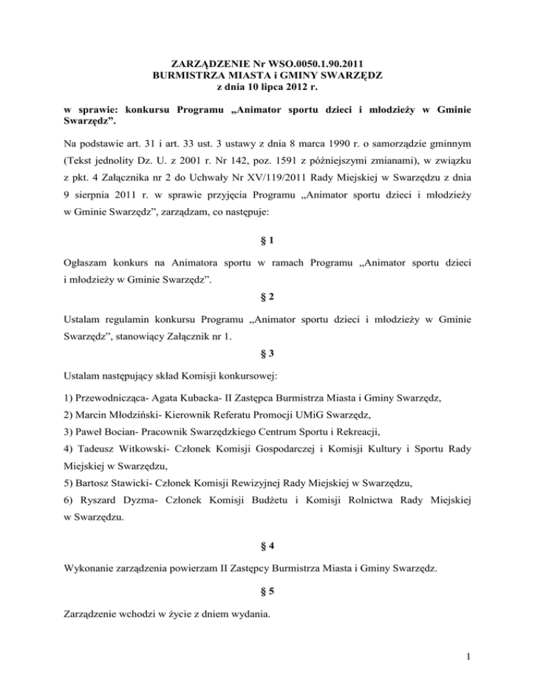 ZARZĄDZENIE Nr WSO.0050.1.90.2011 BURMISTRZA MIASTA i GMINY SWARZĘDZ z dnia 10 lipca 2012 r. w sprawie: konkursu Programu „Animator sportu dzieci i młodzieży w Gminie Swarzędz”. Na podstawie art. 31 i art. 33 ust. 3 ustawy z dnia 8 marca 1990 r. o samorządzie gminnym (Tekst jednolity Dz. U. z 2001 r. Nr 142, poz. 1591 z późniejszymi zmianami), w związku z pkt. 4 Załącznika nr 2 do Uchwały Nr XV/119/2011 Rady Miejskiej w Swarzędzu z dnia 9 sierpnia 2011 r. w sprawie przyjęcia Programu „Animator sportu dzieci i młodzieży w Gminie Swarzędz”, zarządzam, co następuje: §1 Ogłaszam konkurs na Animatora sportu w ramach Programu „Animator sportu dzieci i młodzieży w Gminie Swarzędz”. §2 Ustalam regulamin konkursu Programu „Animator sportu dzieci i młodzieży w Gminie Swarzędz”, stanowiący Załącznik nr 1. §3 Ustalam następujący skład Komisji konkursowej: 1) Przewodnicząca- Agata Kubacka- II Zastępca Burmistrza Miasta i Gminy Swarzędz, 2) Marcin Młodziński- Kierownik Referatu Promocji UMiG Swarzędz, 3) Paweł Bocian- Pracownik Swarzędzkiego Centrum Sportu i Rekreacji, 4) Tadeusz Witkowski- Członek Komisji Gospodarczej i Komisji Kultury i Sportu Rady Miejskiej w Swarzędzu, 5) Bartosz Stawicki- Członek Komisji Rewizyjnej Rady Miejskiej w Swarzędzu, 6) Ryszard Dyzma- Członek Komisji Budżetu i Komisji Rolnictwa Rady Miejskiej w Swarzędzu. §4 Wykonanie zarządzenia powierzam II Zastępcy Burmistrza Miasta i Gminy Swarzędz. §5 Zarządzenie wchodzi w życie z dniem wydania. 1 Załącznik nr 1 do ZARZĄDZENIA Nr WSO.0050.1.90.2011 BURMISTRZA MIASTA i GMINY SWARZĘDZ z dnia 10 lipca 2012 r. Regulamin konkursu Programu „Animator sportu dzieci i młodzieży w Gminie Swarzędz”. I. Regulamin konkursu Programu „Animator sportu dzieci i młodzieży w Gminie Swarzędz”, zwany dalej regulaminem, określa: 1. Zasady zgłaszania kandydatów, 2. Warunki, jakie powinien spełniać Animator sportu, 3. Sposób wyboru kandydatów i zakres działania Komisji konkursowej, zwanej dalej Komisją, 4. Sposób działania Animatorów sportu w trakcie realizacji Programu, 5. Sposób ogłoszenia wyników konkursu. II. Zasady zgłaszania kandydatów: 1. Zgłoszeń kandydatów na Animatorów sportu mogą dokonywać kluby sportowe, Swarzędzkie Centrum Sportu i Rekreacji, stowarzyszenia kultury fizycznej lub uczniowskie kluby sportowe, których zakres działania obejmuje rozwijanie sportu wśród dzieci i młodzieży. 2. Wymienione w punkcie 1 podmioty w dalszej części zwane są Wnioskodawcą. 3. Zgłoszenia kandydatów w formie WNIOSKU, którego wzór stanowi integralną część regulaminu, podpisane przez upoważnionych przedstawicieli Wnioskodawcy, należy składać w terminie do 10 sierpnia 2012 r. w Urzędzie Miasta i Gminy Swarzędz. Do wniosku kandydat zobowiązany jest dołączyć swój życiorys oraz kopie dokumentów dotyczących kwalifikacji. 4. W przypadku konieczności ponownego wyboru Animatorów kultury Burmistrz może ogłosić kolejne konkursy, każdorazowo wskazując przy tym terminy przyjmowania wniosków konkursowych. 2 III. Warunki, jakie powinien spełniać Animator sportu: 1. Kandydatami na Animatorów sportu mogą być nauczyciele wychowania fizycznego, instruktorzy i trenerzy pracujący z dziećmi i młodzieżą w klubach sportowych, stowarzyszeniach kultury fizycznej, uczniowskich klubach sportowych lub innych organizacjach, posiadający do tego uprawnienia (minimum instruktorskie) na podstawie obowiązujących przepisów. 2. W zgłoszeniu kandydaci zaproponują program zajęć o charakterze pozalekcyjnym i pozaszkolnym, zgodnie z celami i zadaniami Programu „Animator sportu dzieci i młodzieży w Gminie Swarzędz”. IV. Sposób wyboru kandydatów i zakres działania Komisji. 1. Burmistrz Miasta i Gminy Swarzędz powołuje Komisję, która przeprowadza analizę złożonych wniosków. 2. Komisja rekomenduje wybór Animatora sportu Burmistrzowi Miasta i Gminy Swarzędz, kierując się m. in. następującymi kryteriami: a) poziomem kwalifikacji, stopniem dotychczasowej aktywności społecznej oraz osiągnięciami kandydatów, b) oceną proponowanego programu zajęć z naciskiem na zróżnicowanie i atrakcyjność zajęć, c) stopniem zaniedbania środowiska, w którym będzie działał Animator sportu oraz stopniem dostępności innych alternatywnych działań z zakresu sportu w danym miejscu, d) zasięgiem działań prowadzonych przez Animatora sportu. 3. Decyzję o wyborze Animatora sportu dokonuje Burmistrz Miasta i Gminy Swarzędz w terminie do 24 sierpnia 2012 r. 4. W przypadku konieczności ponownego wyboru Animatorów kultury, zgodnie z pkt. II ppkt. 4 niniejszego zarządzenia, decyzja o wyborze dokonana będzie w terminie nie dłuższym niż 14 dni od daty złożenia wniosków konkursowych. V. Sposób działania Animatorów sportu w trakcie realizacji Programu. 1. Umowy z wybranymi przez Burmistrza Miasta i Gminy Swarzędz Animatorami sportu zawiera Swarzędzkie Centrum Sportu i Rekreacji na okres od 1 września 2012 r. do 30 czerwca 2013 r. 2. Zakres zadań Animatora sportu określa program zajęć, przygotowany przez kandydata i dołączony do wniosku, zaś po wyborze danego kandydata stanowi załącznik do umowy. 3 3. Każdy Animator sportu wyłoniony w drodze przeprowadzonej procedury zobligowany jest do prowadzenia na bieżąco dziennika pracy Animatora sportu i rejestrowania w nim realizowanych przez siebie zajęć oraz obecności uczestników. Dokumentacja może być prowadzona w innej formie, jednakże w taki sposób, aby nie budziła żadnych wątpliwości co do jakości i stosowanych metod pracy, w przypadku poddania dokumentacji kontroli. 4. Ustala się, że w ramach umowy Animator sportu będzie realizował zajęcia z częstotliwością nie mniejszą niż 3 razy w tygodniu, a pojedyncze zajęcia nie powinny być krótsze niż 90 minut. VI. Ogłoszenie wyników konkursu. Wyniki konkursu zostaną ogłoszone niezw