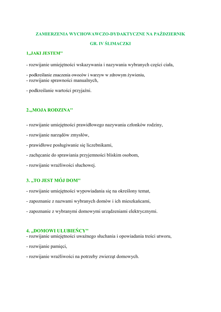 ZAMIERZENIA WYCHOWAWCZO-DYDAKTYCZNE NA PAŹDZIERNIK GR. IV ŚLIMACZKI 1,,JAKI JESTEM'' - rozwijanie umiejętności wskazywania i nazywania wybranych części ciała, - podkreślanie znaczenia owoców i warzyw w zdrowym żywieniu, - rozwijanie sprawności manualnych, - podkreślanie wartości przyjaźni. 2.,,MOJA RODZINA'' - rozwijanie umiejętności prawidłowego nazywania członków rodziny, - rozwijanie narządów zmysłów, - prawidłowe posługiwanie się liczebnikami, - zachęcanie do sprawiania przyjemności bliskim osobom, - rozwijanie wrażliwości słuchowej. 3. ,,TO JEST MÓJ DOM'' - rozwijanie umiejętności wypowiadania się na określony temat, - zapoznanie z nazwami wybranych domów i ich mieszkańcami, - zapoznanie z wybranymi domowymi urządzeniami elektrycznymi. 4. ,,DOMOWI ULUBIEŃCY'' - rozwijanie umiejętności uważnego słuchania i opowiadania treści utworu, - rozwijanie pamięci, - rozwijanie wrażliwości na potrzeby zwierząt domowych. WIERSZ B. Kołodziejskiego ,,Pan odkurzacz'' Szuru szu, szu, szuru szu, szu. Pan odkurzacz poszedł w ruch. Jeździ w koło po podłodze, warczy przy tym bardzo srodze. Szuru szu, szu, szuru szu, szu. Wjeżdża wszędzie w zakamarki, czyści też najmniejsze szparki. Wszystkie brudy migiem wciąga i dokładnie pokój sprząta. PIOSENKA ,,Kot jest czysty'' I. Kot się myje przed śniadaniem, kot się myje przed obiadem, przed kolacją i przed spaniem, taką kocią ma zasadę. Ref.: Kot jest czysty i my też. Spójrz na ręce, jeśli chcesz! Po co mają krążyć plotki, że czyściejsze od nas kotki. II. Kot mydełka nie używa, bez ręcznika się obywa. Ja w łazience kran odkręcę, mydłem wyszoruję ręce. Ref.: Kot jest czysty i my też. Spójrz na ręce, jeśli chcesz! Po co mają krążyć plotki, że czyściejsze od nas kotki.